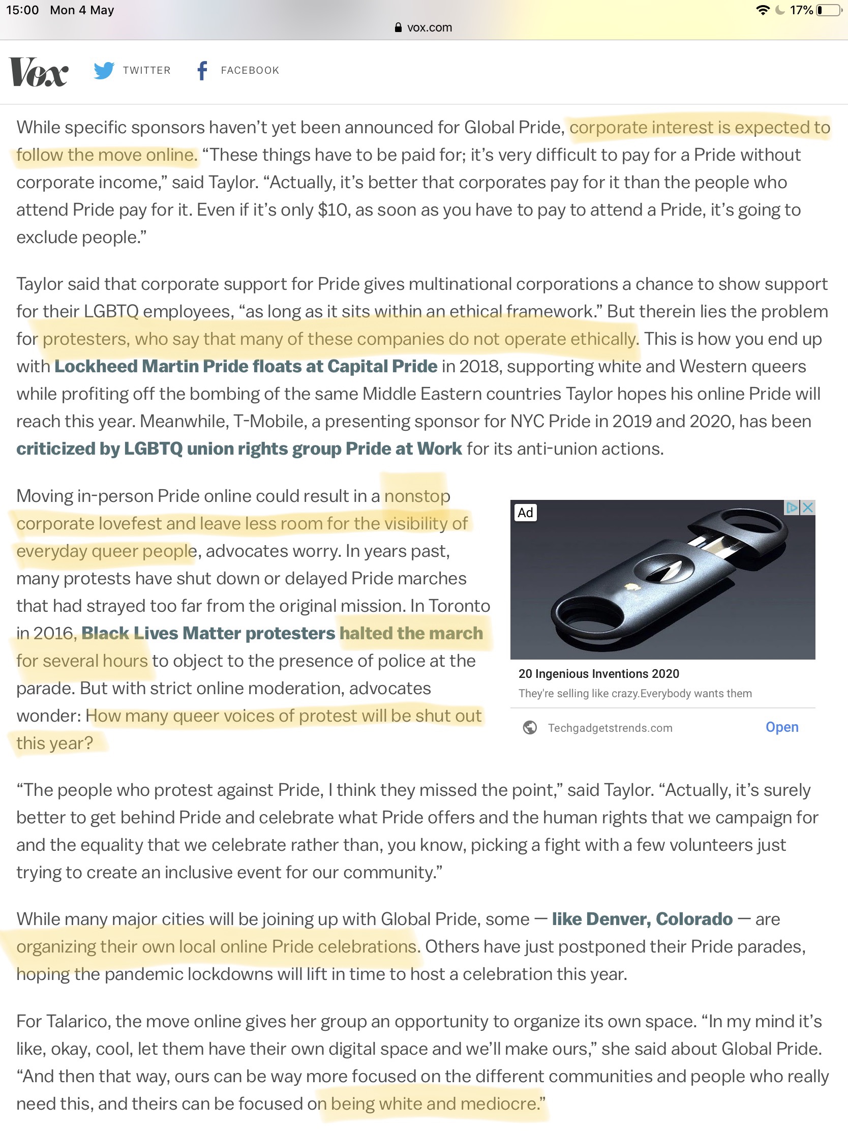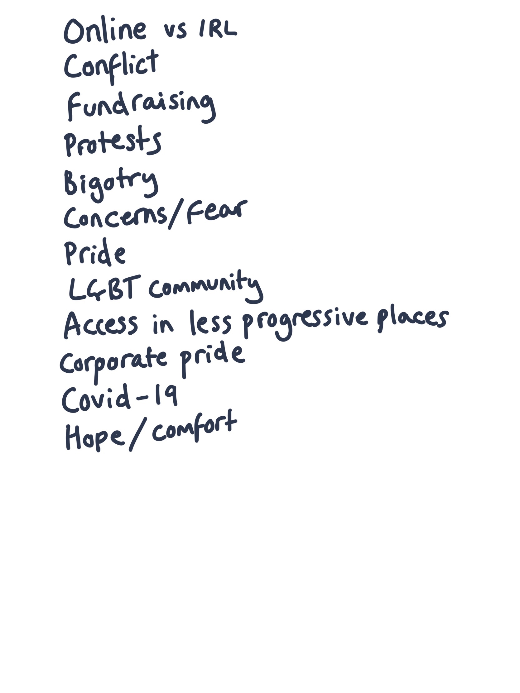I then jotted down the key points I took away from the article, and what I felt summarised the text. The core themes were that Pride would exist online rather than in real life spaces, that there was fear and concern – around homophobic and transphobic abuse online and around how to support smaller communities – and that the purpose of Pride may be lost, either to protestors, or to the thing protestors are protesting.