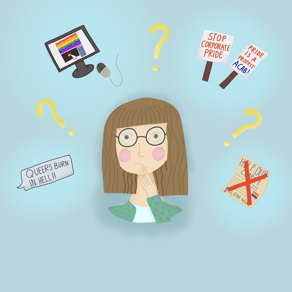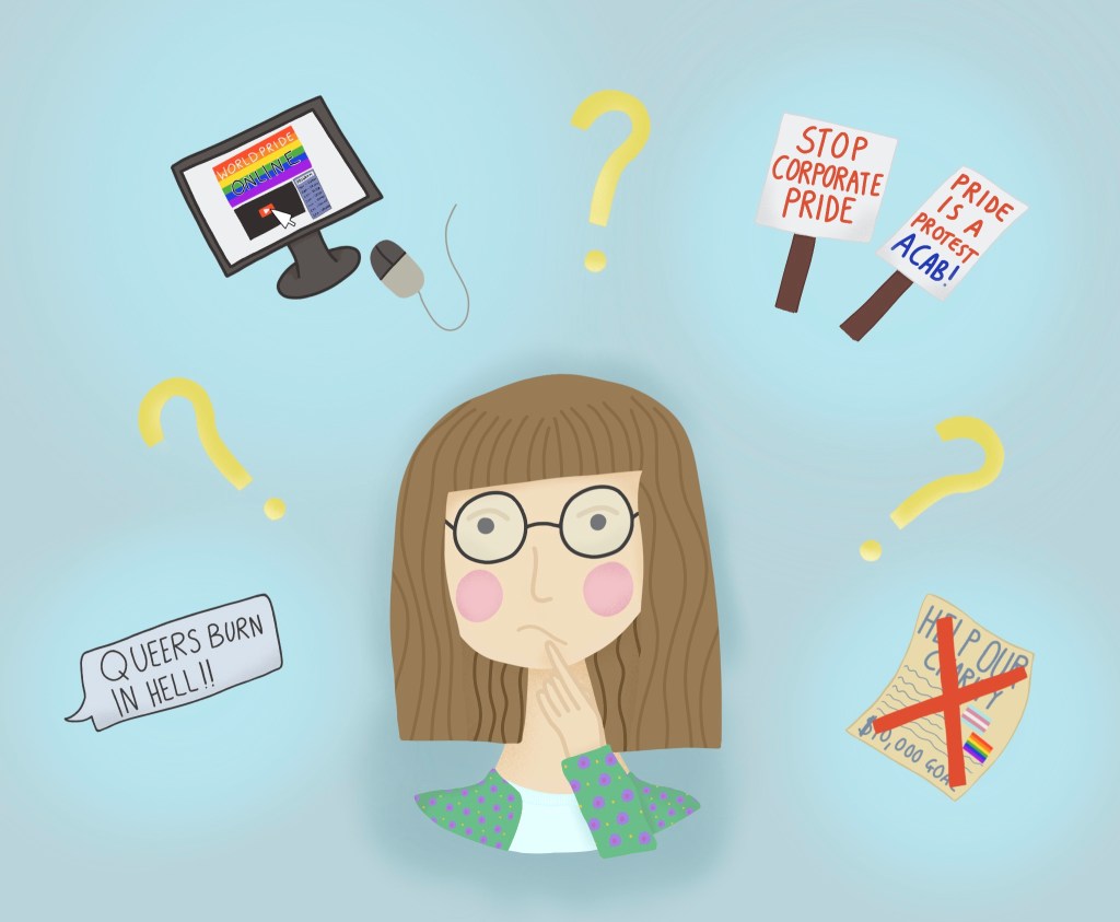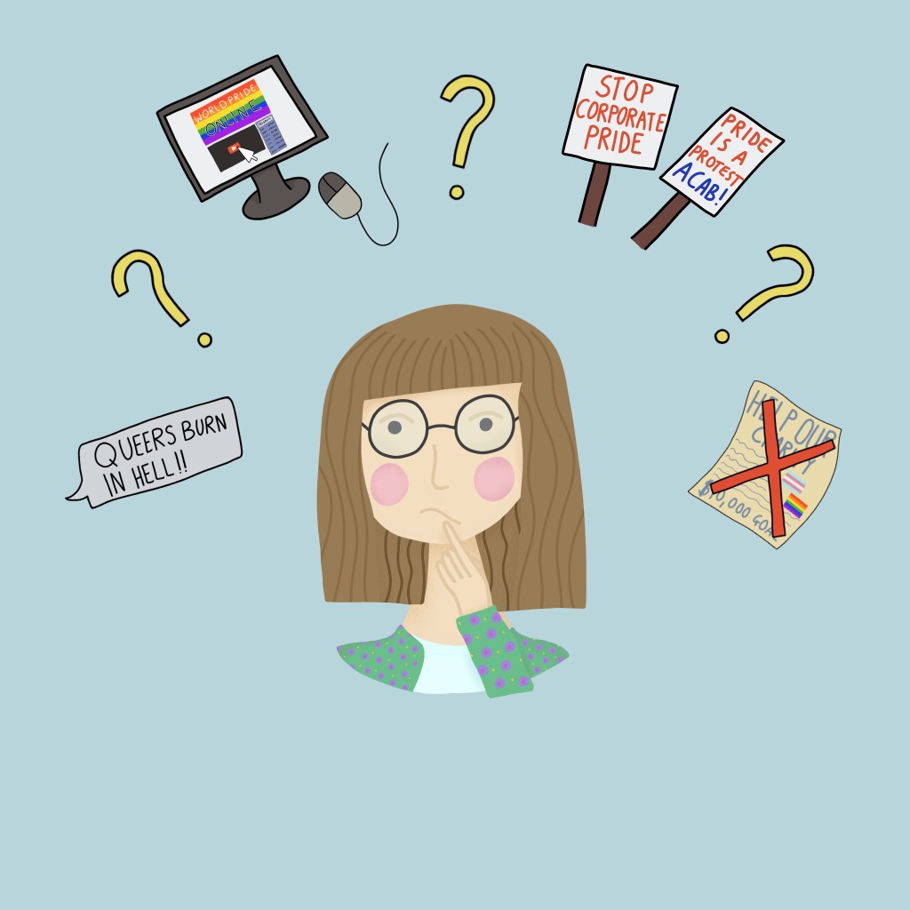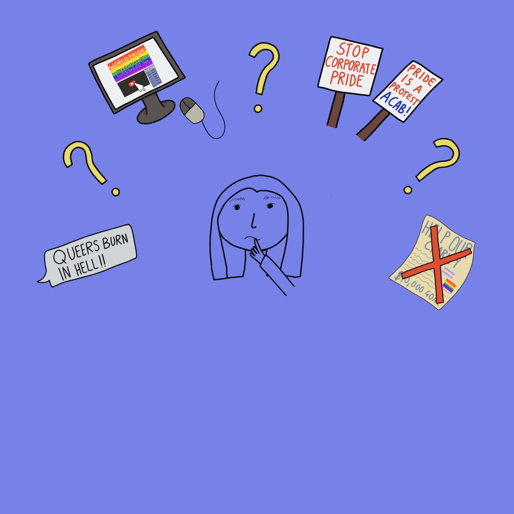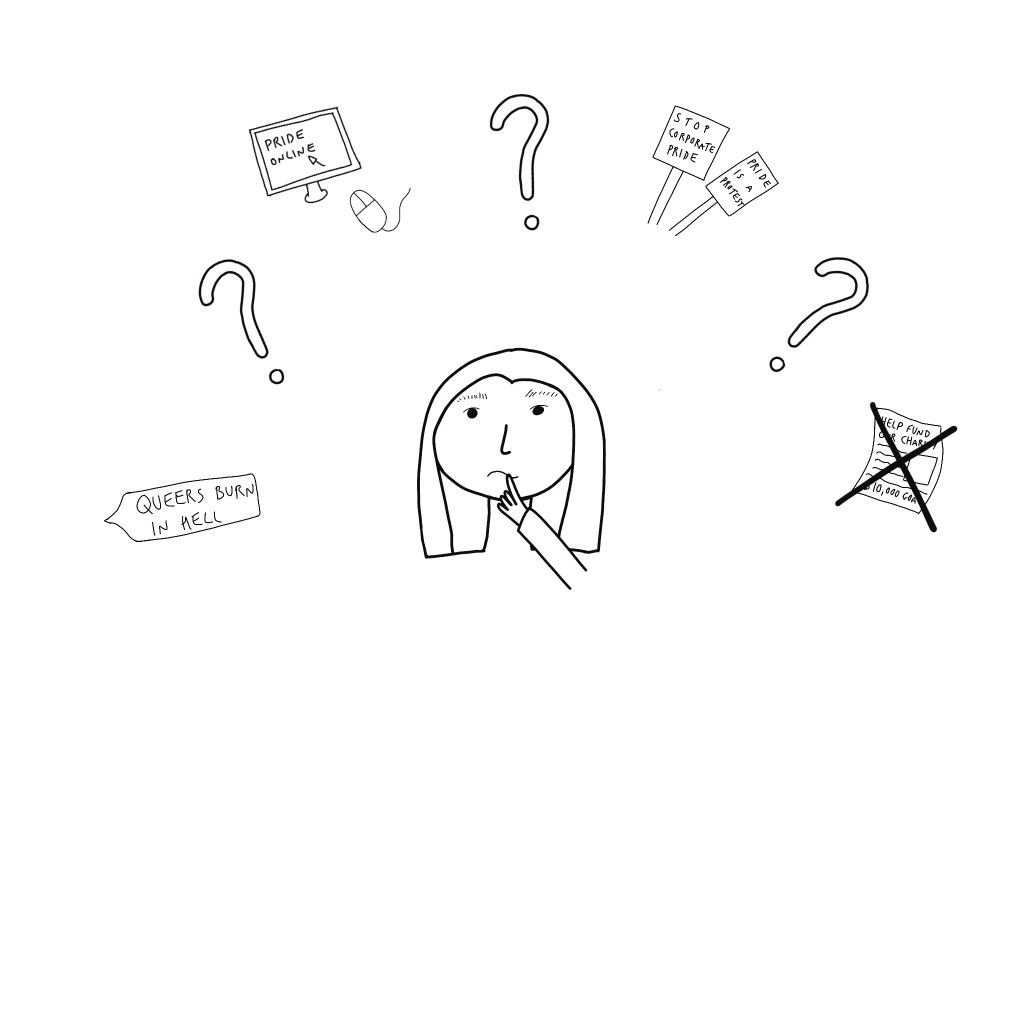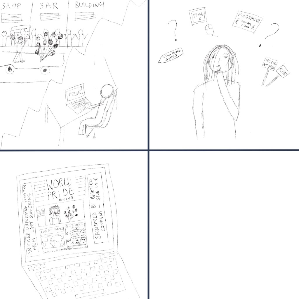 I sketched out 3 initial ideas for an illustration. The first shows a regular Pride parade in the street, and someone sat at home watching Pride on their laptop. I used a jagged line to separate the two as I felt it showed the striking difference. The second has a confused and worried person surrounded by question marks and various ‘fears’; online harassment, Pride online, fundraisers lacking traction, and protestors. The third simply shows a laptop with a Pride online website open. It has adverts over most the page from anti-LGBT corporations, homophobic and transphobic abuse in a chatbox, and a very tiny barely readable ‘donate to LGBT charities’ link, showing the priority given to corporations rather than community resources.
