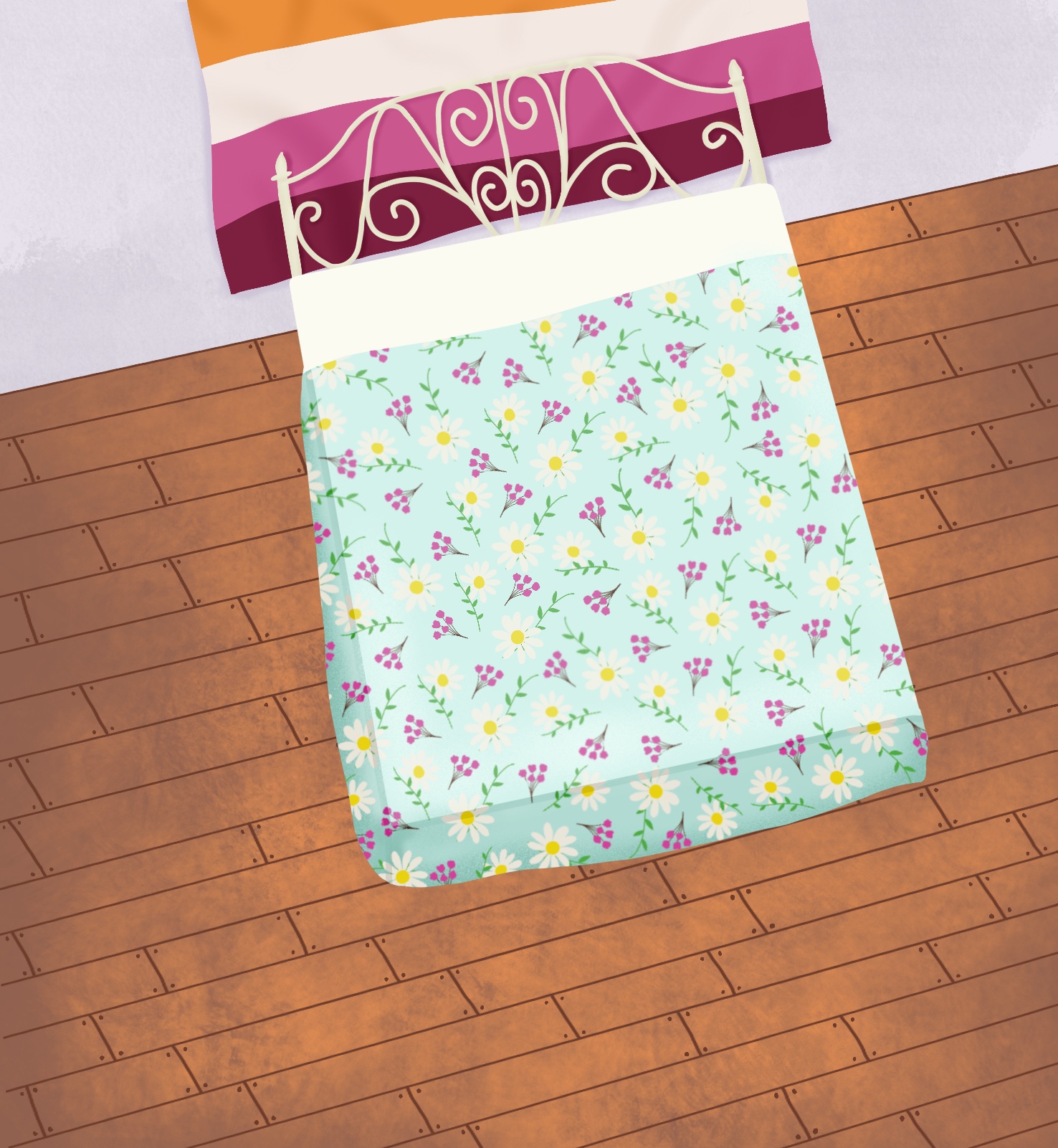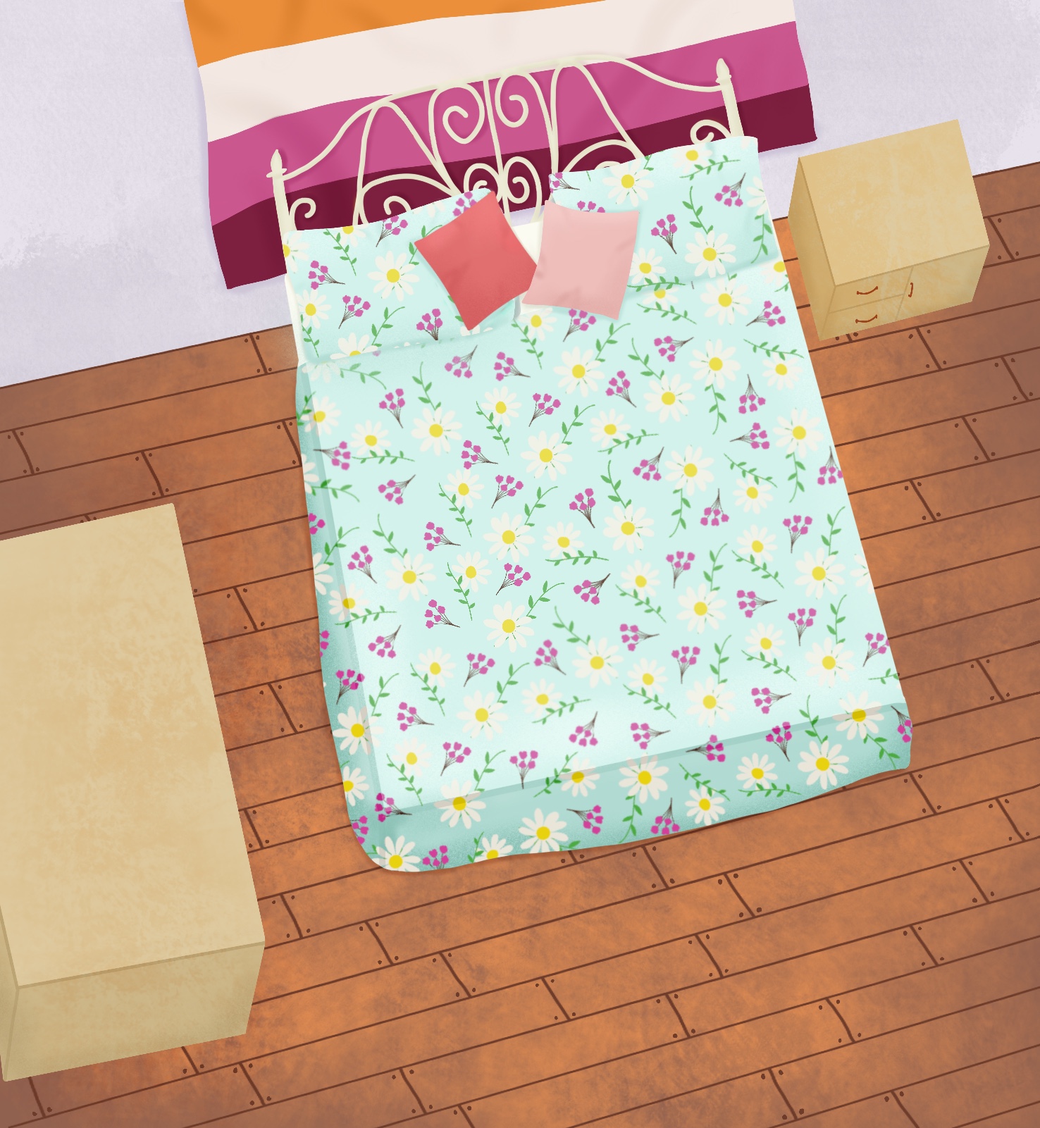 Whilst working on the piece I made several changes from my original sketch. I moved the table at the front of the piece to the left as I felt it filled the space better, and I removed the door. I decided to draw myself lying down rather than cross-legged, as it worked better with the top-down view. I moved the elements from my bed to the tables as the pattern on the bed made it difficult to see anything on it, leaving only my phone in my hand. I also decided to not draw a rug, as I really liked the flooring, and felt the rug made the piece too busy.