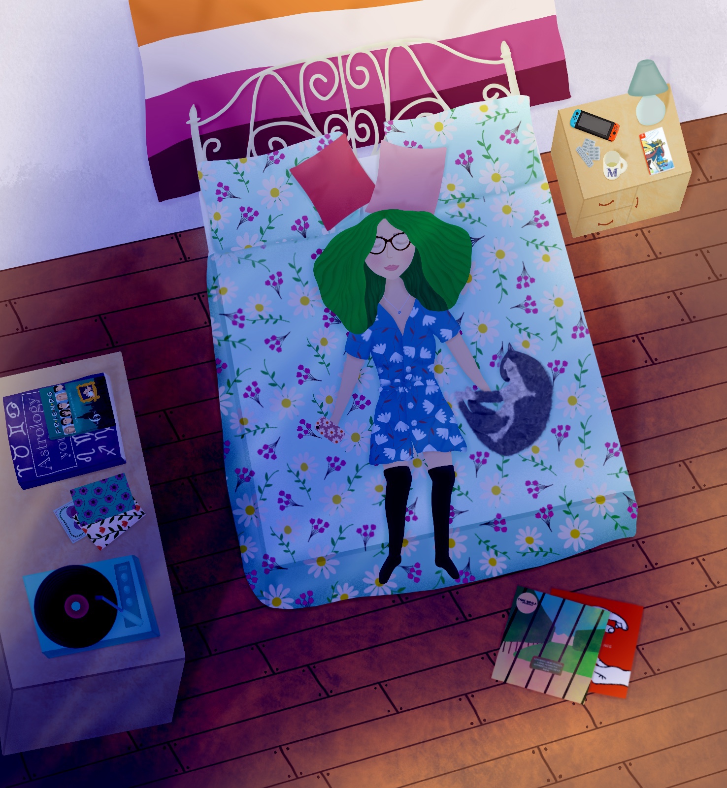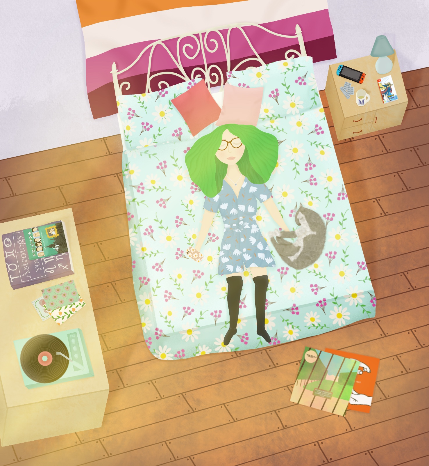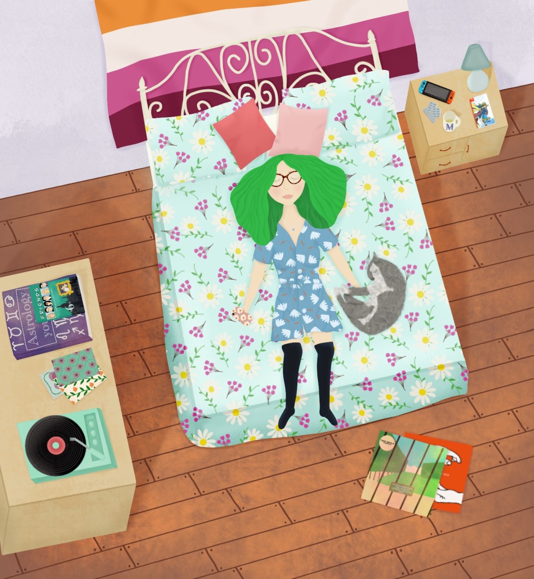 On reflection, I think I bit off a little more than I could chew with this piece. I loved doing it, but found myself having to scale back repeatedly on what would be in the final piece. I wanted to include as much as possible, but found it getting busy and cluttered, and that I was taking lot of time on tiny individual elements. Despite that, I am really proud of the finished image. I love the way it looks and how everything fits together. The only thing I would change is my cat, Nina. I wanted to add a fur texture to her, and as a standalone I think it works well, however it looks out of place with the rest of the image. I think redrawing her, maybe stretching by the bed, would look better.