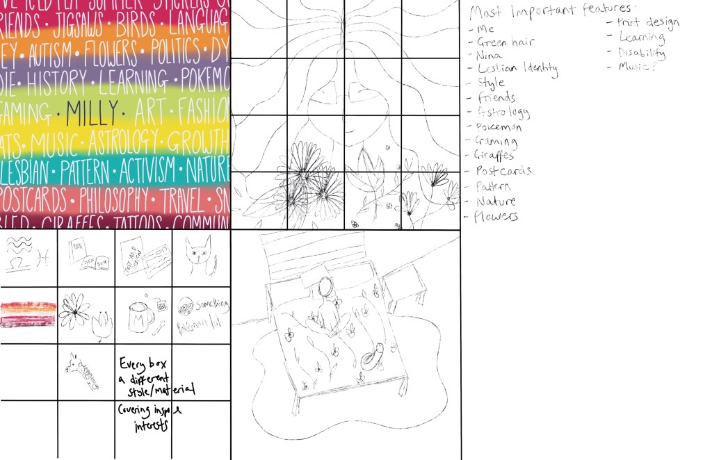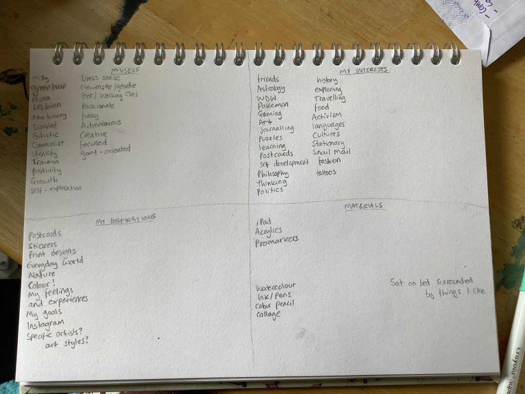 Then, I started drawing out ideas, trying to figure out what it was I wanted to say. I reduced down my initial list to the key things that I felt were important. Me: my name or myself, my green hair, my identity as a lesbian and as a disabled person, my cat, my dress sense. My interests: the TV show Friends, astrology, pokemon, gaming, art, postcards, my love of learning. My inspirations: colour, nature, the world around me, and specifically patterns on anything and everything I see. Materials: I’m most comfortable using my iPad and creating digital art. I do enjoy physical art too, but digital is where I feel best suited.