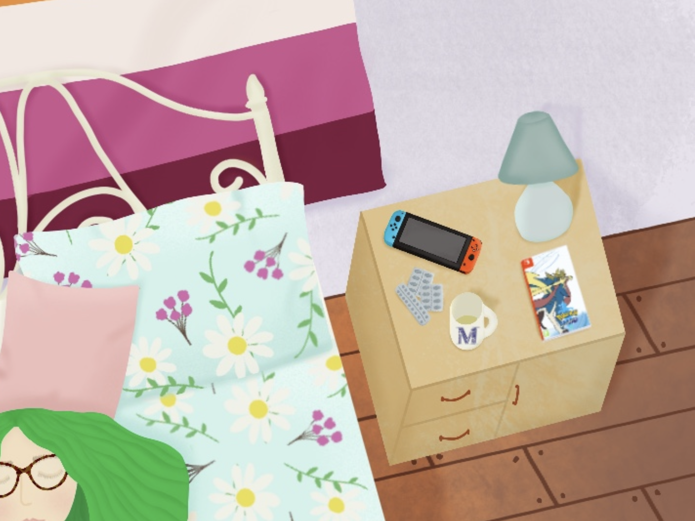 On the table on my right, I have a Nintendo Switch, a Pokemon game, a mug, and some medication packets. The Pokemon game replaced the Pokemon plush I was originally going to draw on the bed. I also drew a standard Switch, as the one I own is a limited edition Pokemon themed one, and I wanted it to be recognisable. The mug is one of my favourites, and it was really fun to recreate it. I also included the medication packets as a nod to my experiences being disabled.
