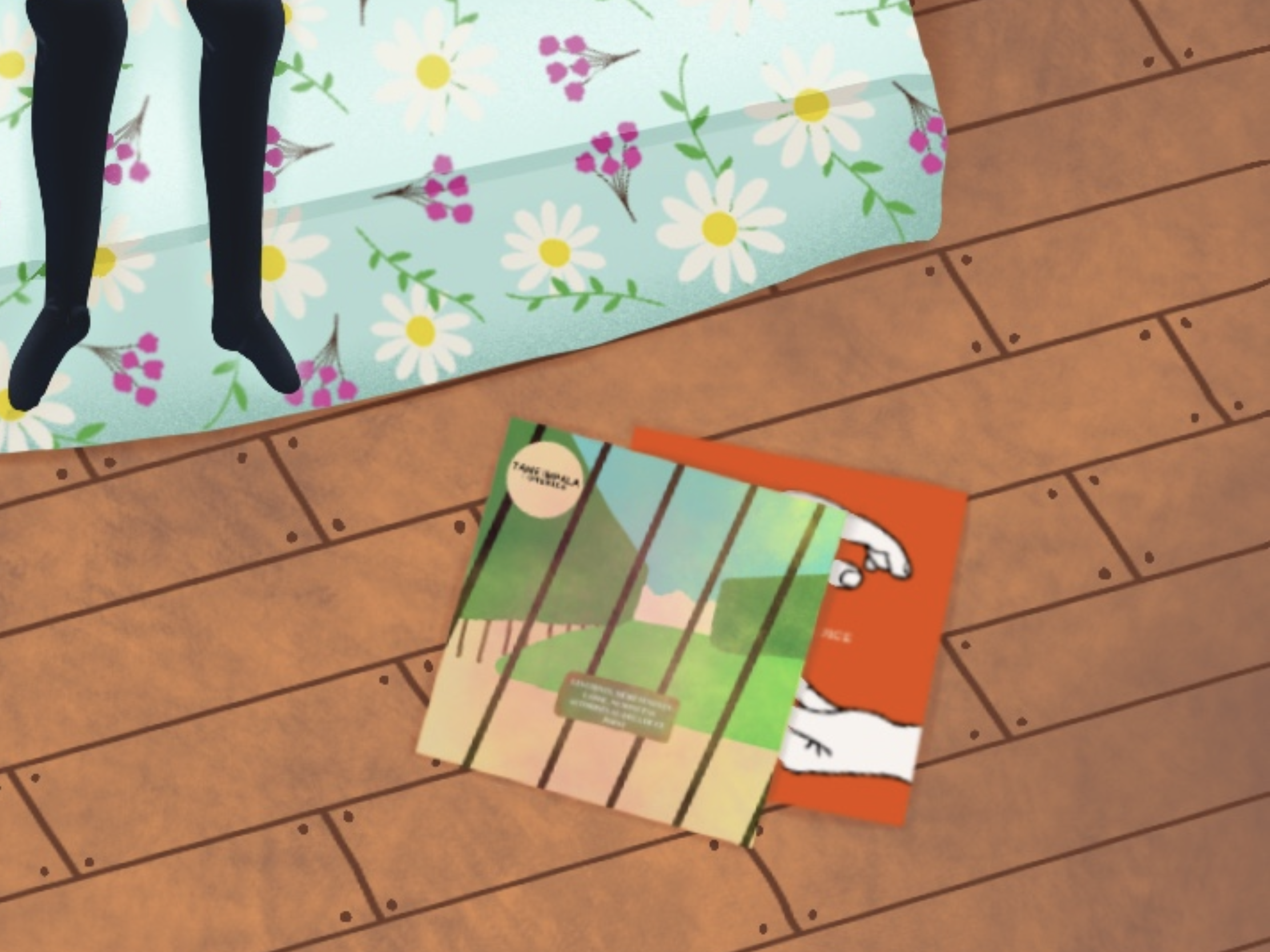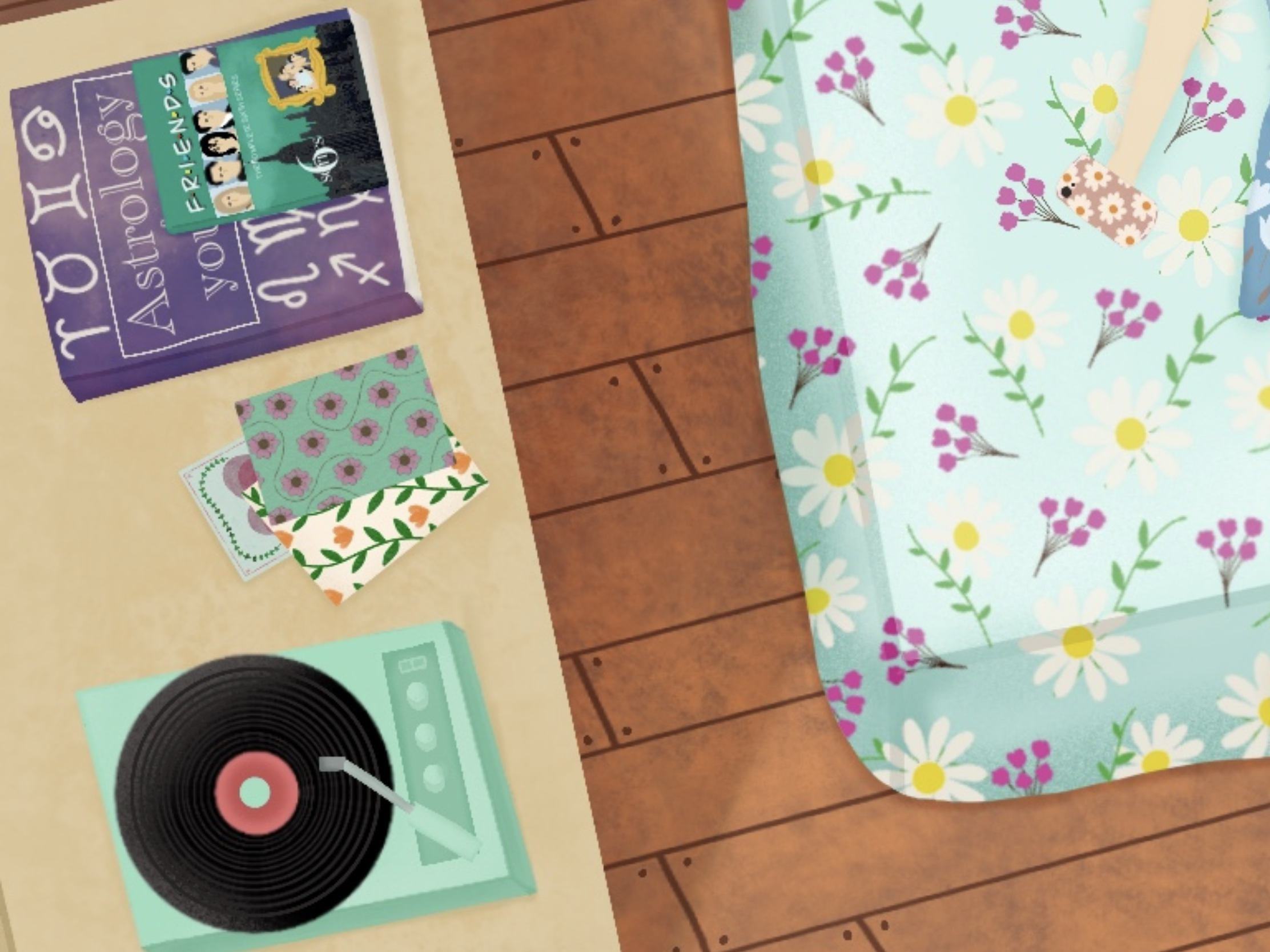 As this piece progressed, I realised that music was such a huge part of my life I had completely bypassed when working on ideas. To have me lying on my bed listening to a record seemed brilliant, and fitting to how I spend my time. So the record player and vinyls took centre stage. It worked well as I was looking for something to include in the bottom right space. I had thought a plant would work, but I feel the floral decorations point to my nature inspired style enough. The vinyls are two albums I love, Lonerism by Tame Impala, and Hospice by The Antlers.