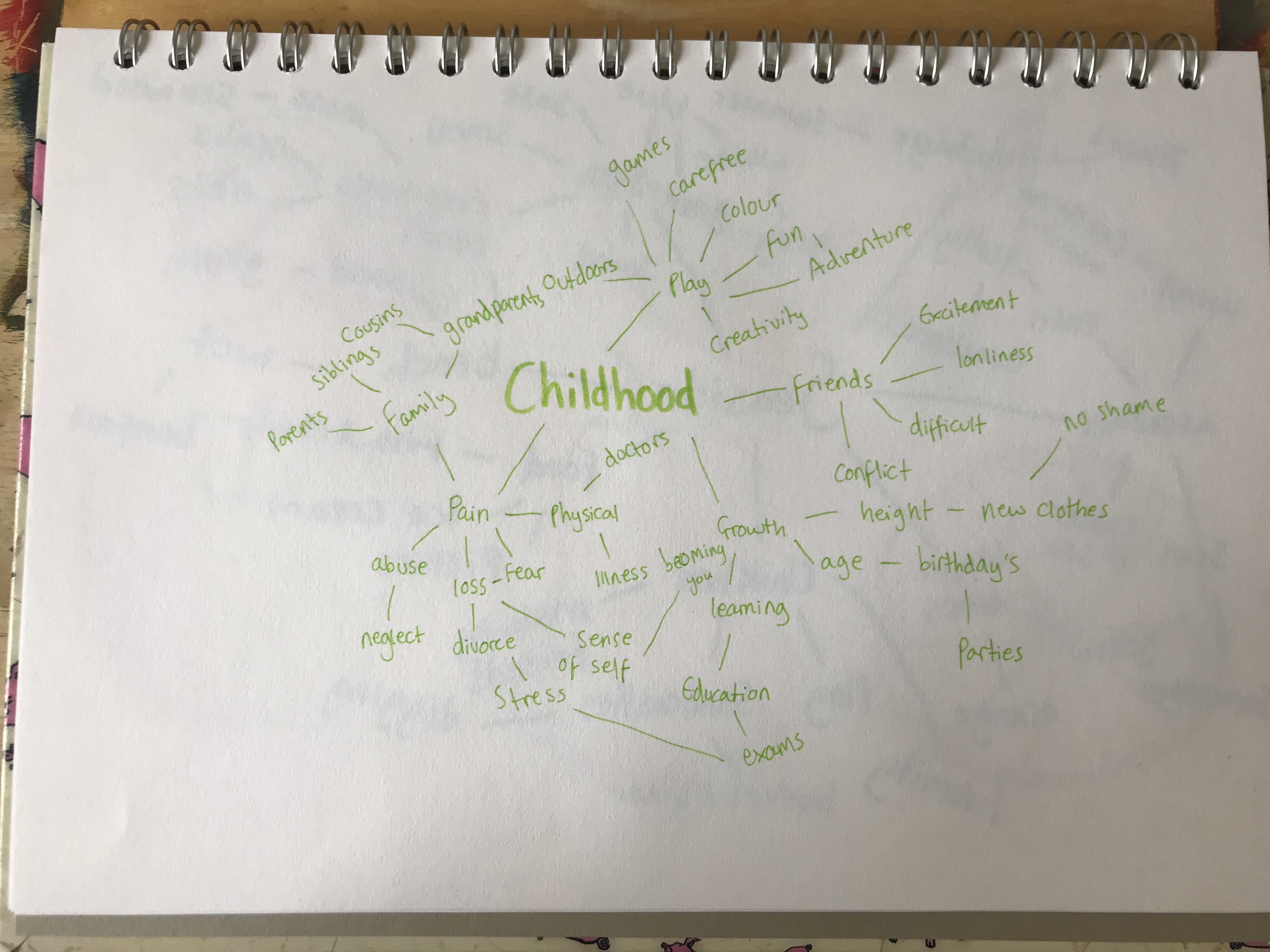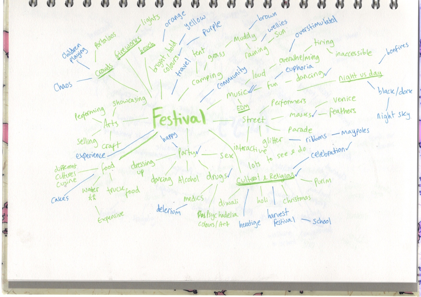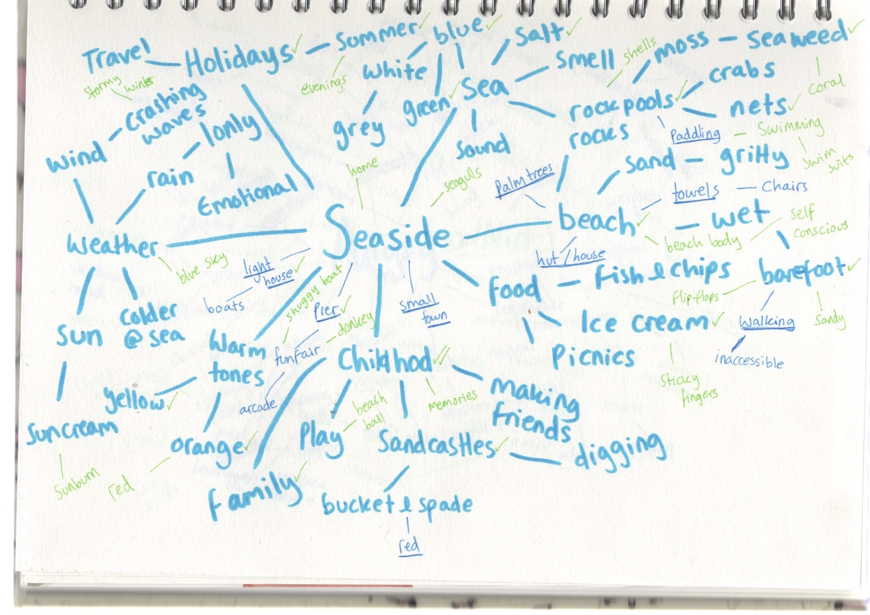 For this exercise, I had to create a spider diagram for four words: seaside, childhood, angry, and festival. I had to use different ways of generating ideas for it, including asking at least one other person.