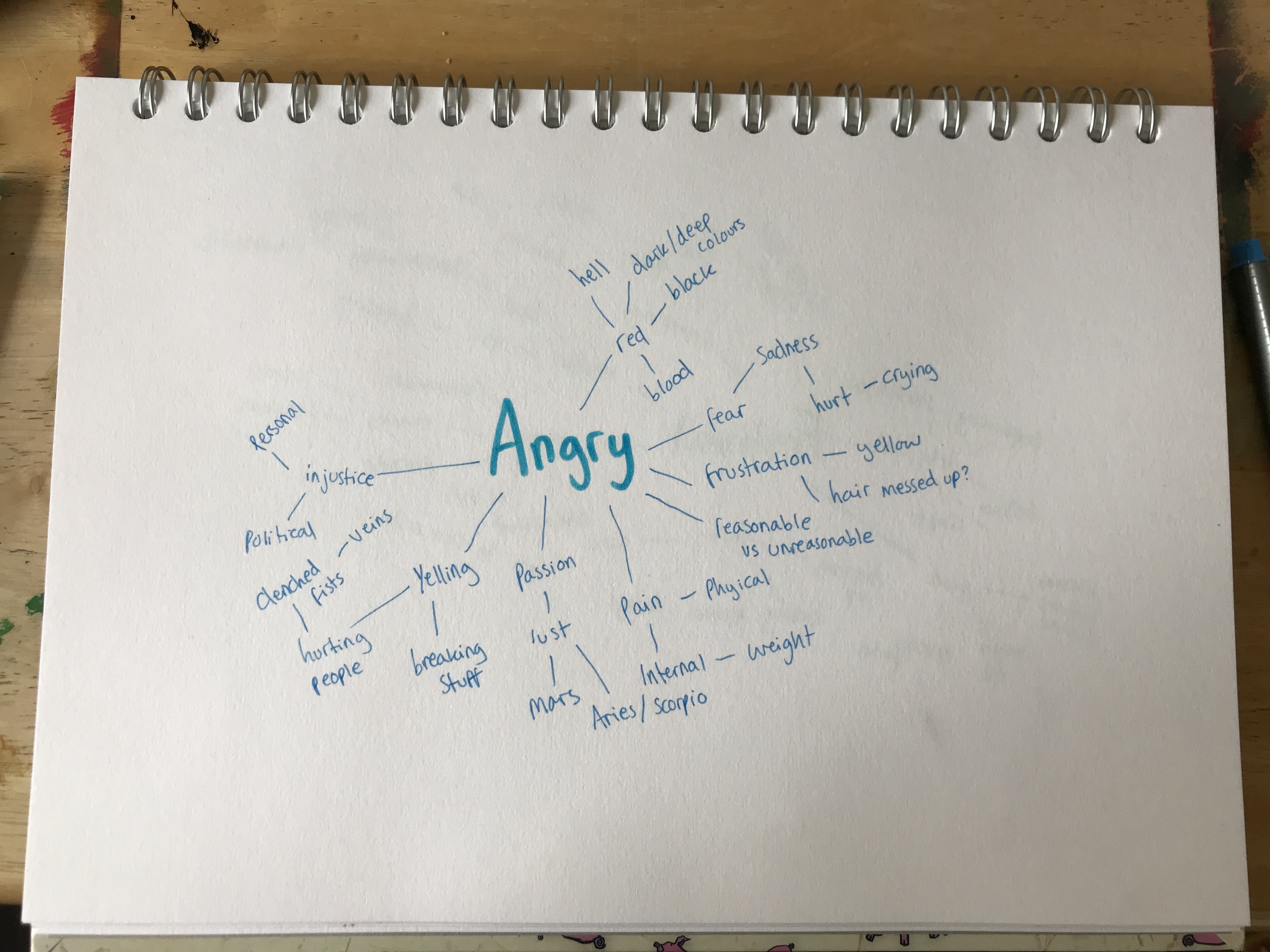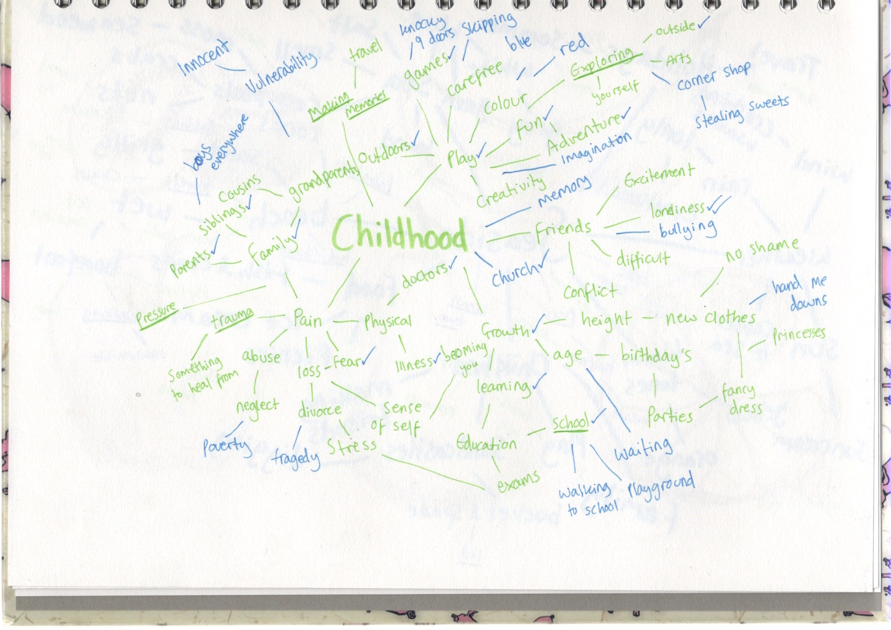 I started by doing each spider diagram and just referencing my memory, and the thoughts/ideas that I thought of without external input. I realised after the first diagram that I was using too big of a pen for the amount of ideas I was generating, hence the change after that.