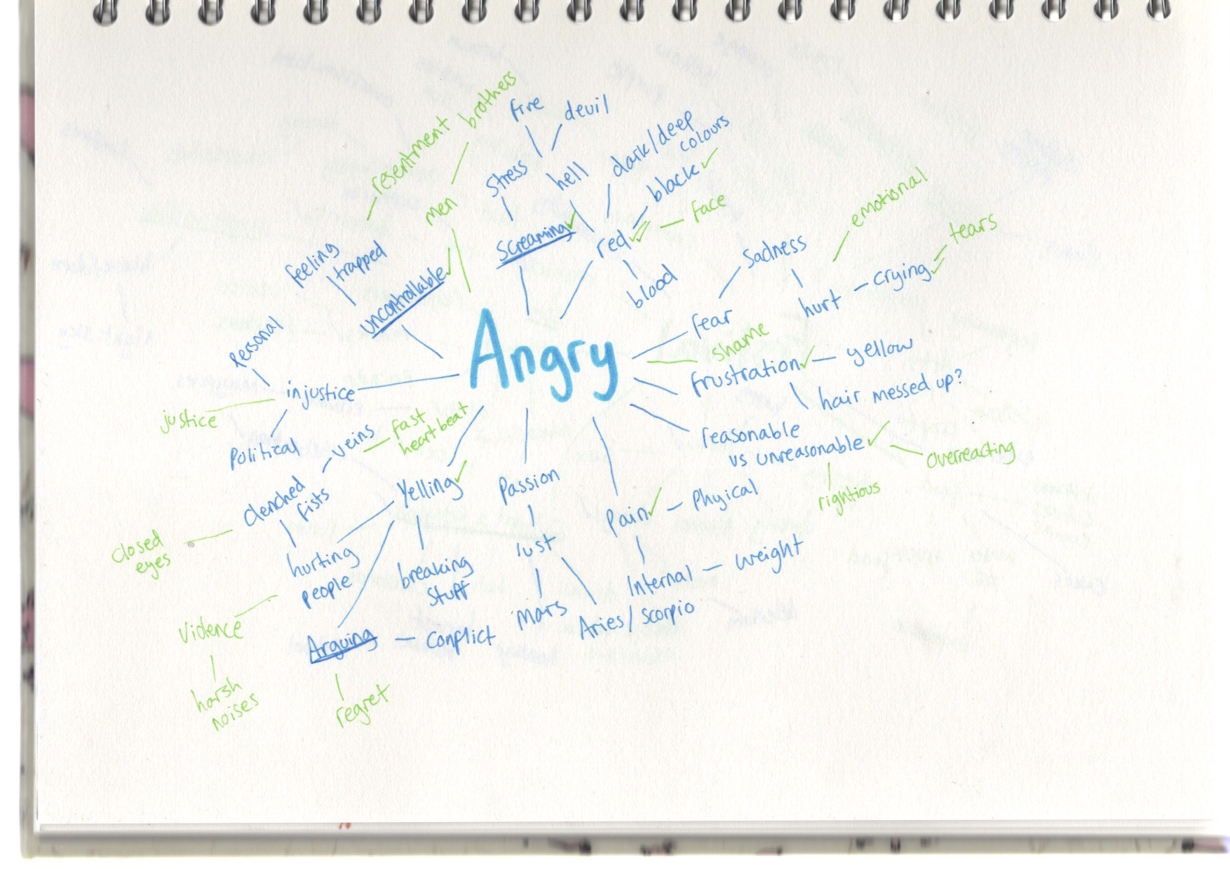 Then, I called my girlfriend and my mum and asked them both to tell me anything that came to mind when I said each word. I wrote anything that I hadn’t yet written in a different colour, and ticked the words that they said that I had already written. Anything that is ticked twice, they both said.