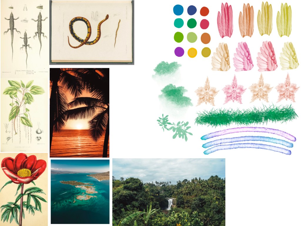 I think the next step here for me would be to begin studies of the different elements, and drawing out specific shapes to get a feel for them. I would then start to compile my ideas into an illustration, and work with composition. For idea development, I thought this was incredibly useful. Creating a collage rather than going straight to the orderly mood board helped me see the possibilities for an illustration. It helped connect ideas visually and notice how these ideas engage with each other. For idea development in future, I think I will begin with a spider diagram, then a collage mood board, then finalise my ideas with a structured mood board.