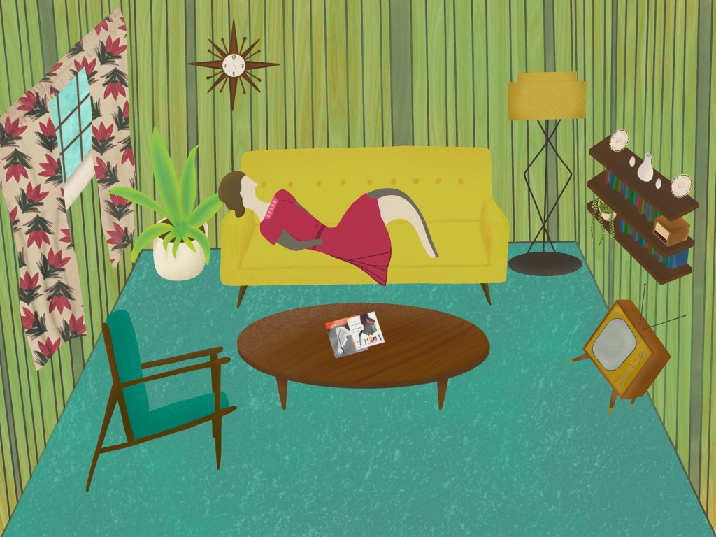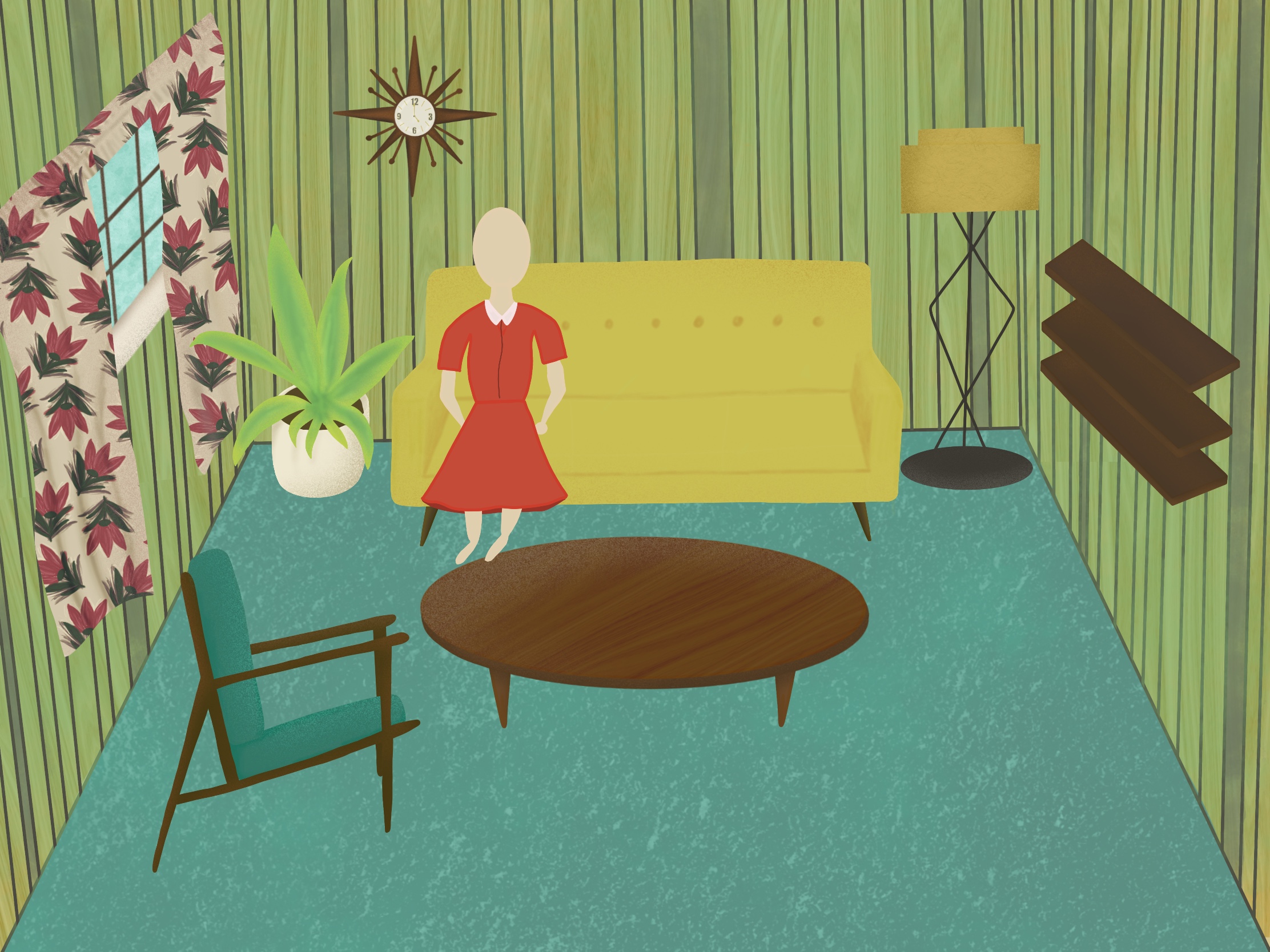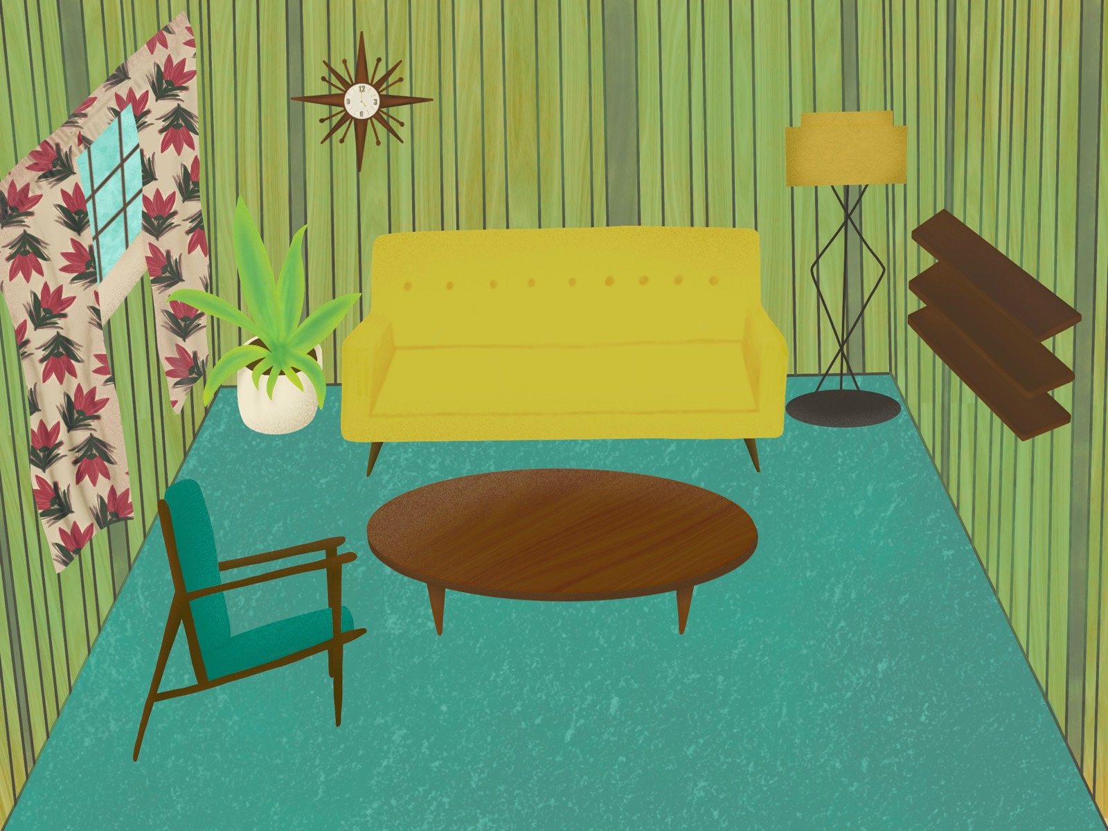 Beginning with the walls, I tried to emulate the wooden nordic style commonly seen in interior decor at the time. I then added a classic sofa, coffee table, and arm chair, wanting to really accentuate how low to the floor these things were, and the sharp angles the legs had. I loved the shading technique I used on the sofa, and was so happy with how it came out. I also really like how clean the overall illustration feels without linework. The colour palette for the piece was centered around the walls and sofa, as I felt yellow was very appropriate for the time. Interiors, especially living rooms, all look quite dark too. There was little natural light, and a lot of dark colours consistently used.