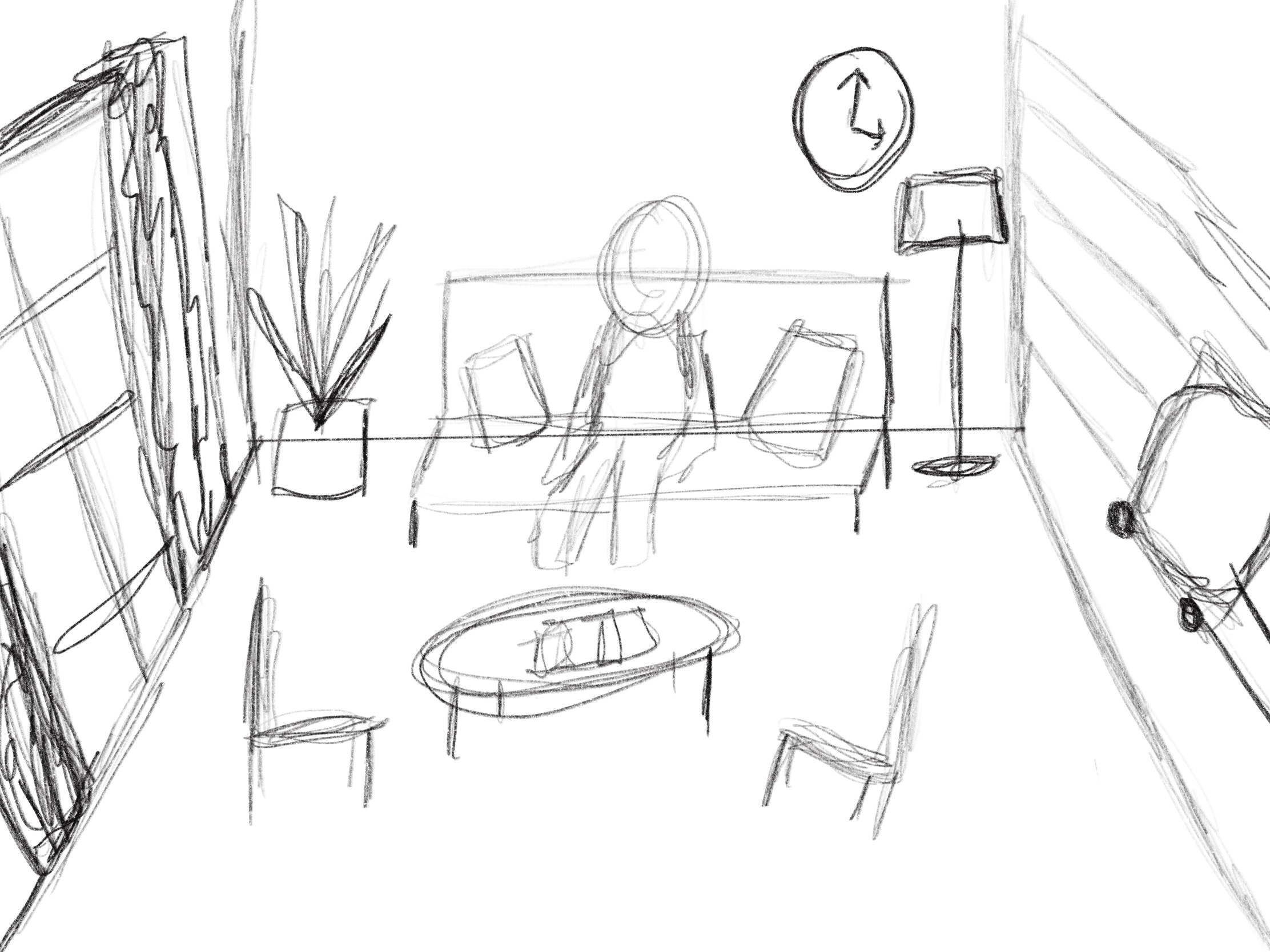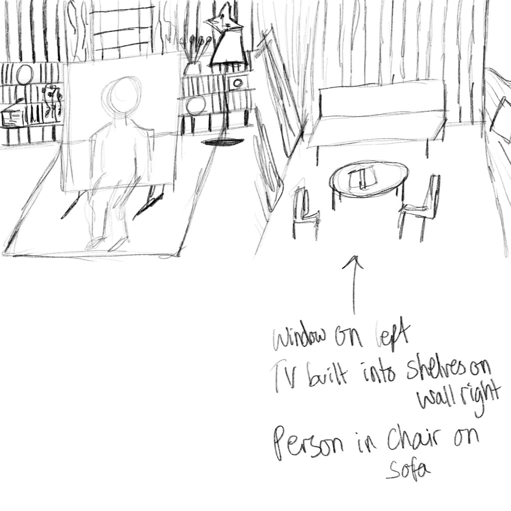 I then attempted to draw someone sitting on the couch. I really hated it, and felt so demotivated. I was so proud of the rest of my work and I felt this was just completely destroying it. Whilst it was just an outline, it was so disproportionate and I realised I didn’t know enough about drawing human form. I decided to take some time to do some sketchbook studies of still life videos and tutorials on drawing people, before coming back to it and trying again.