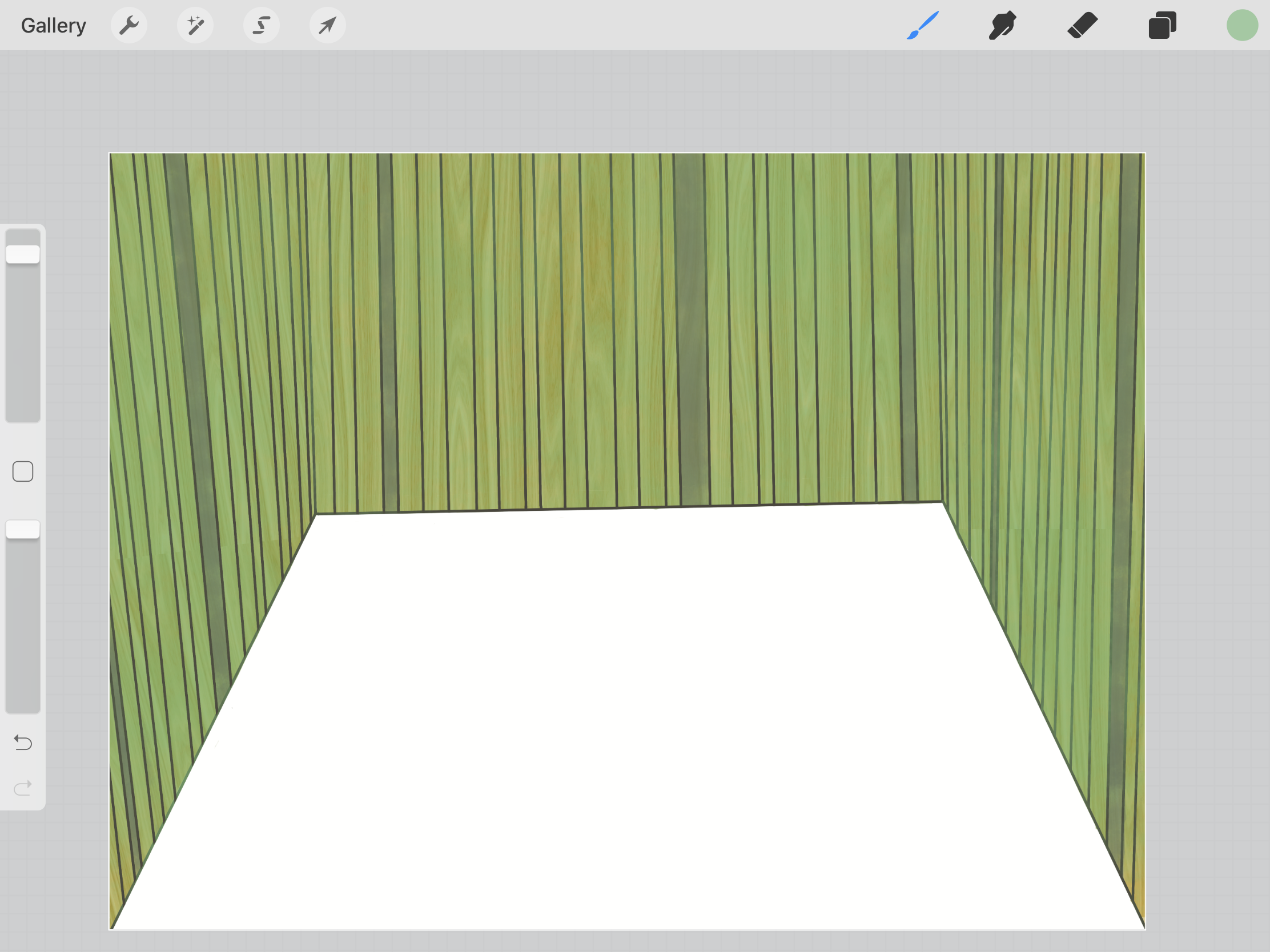 I then opened a new file, and sketched out the second thumbnail with a bit more detail. I started illustrating the walls and floor to start with, building the image up from the ground like I did with Assignment 1. However, as I learned in this assignment, the level of detail I was putting in was not necessary. This time around, I went for a softer, less detailed, more stylised approach. For the walls, and the coffee table, I found a wood texture from myfreetextures.com and overlayed it onto both. I found it difficult to create a wood effect in my assignment, so this was a great discovery.