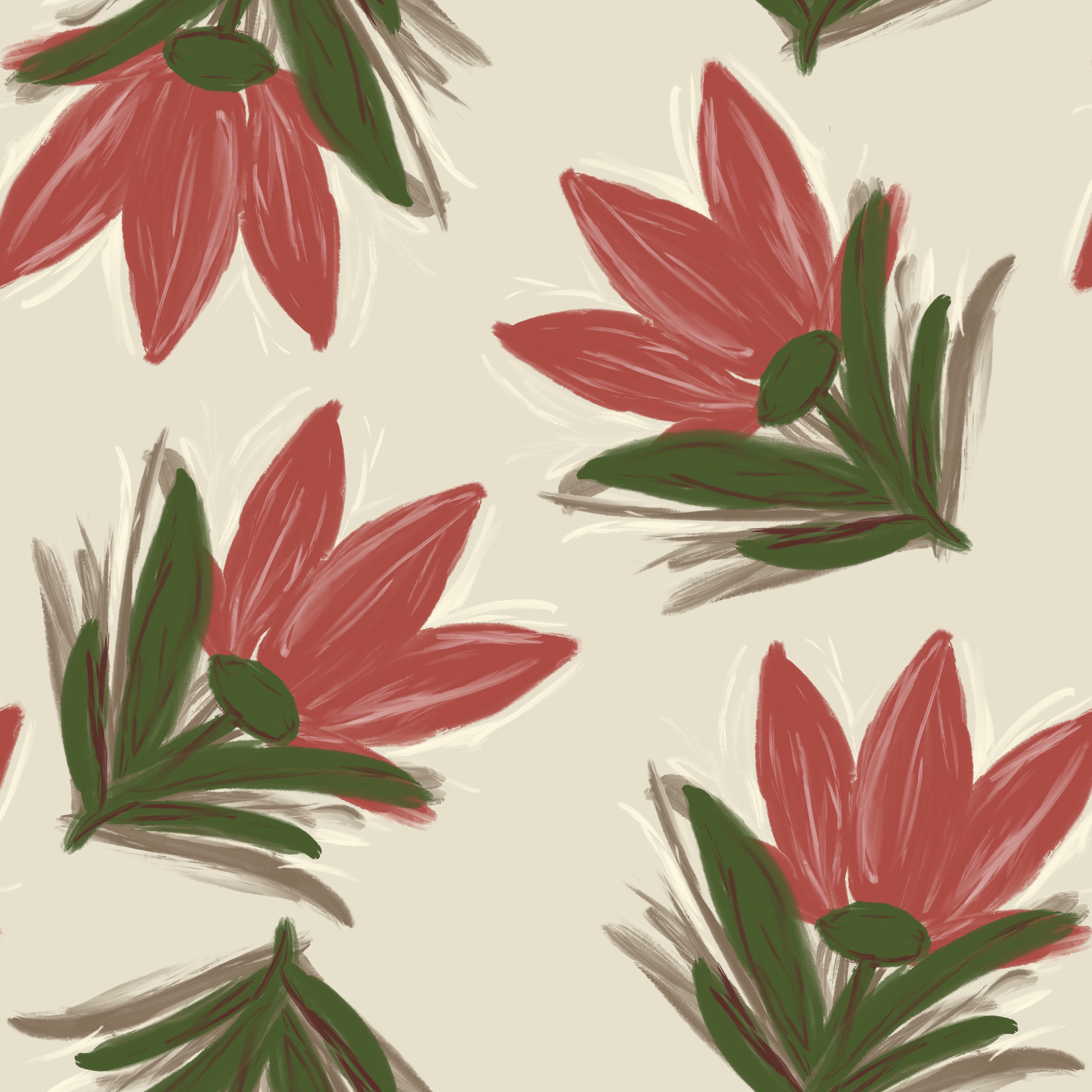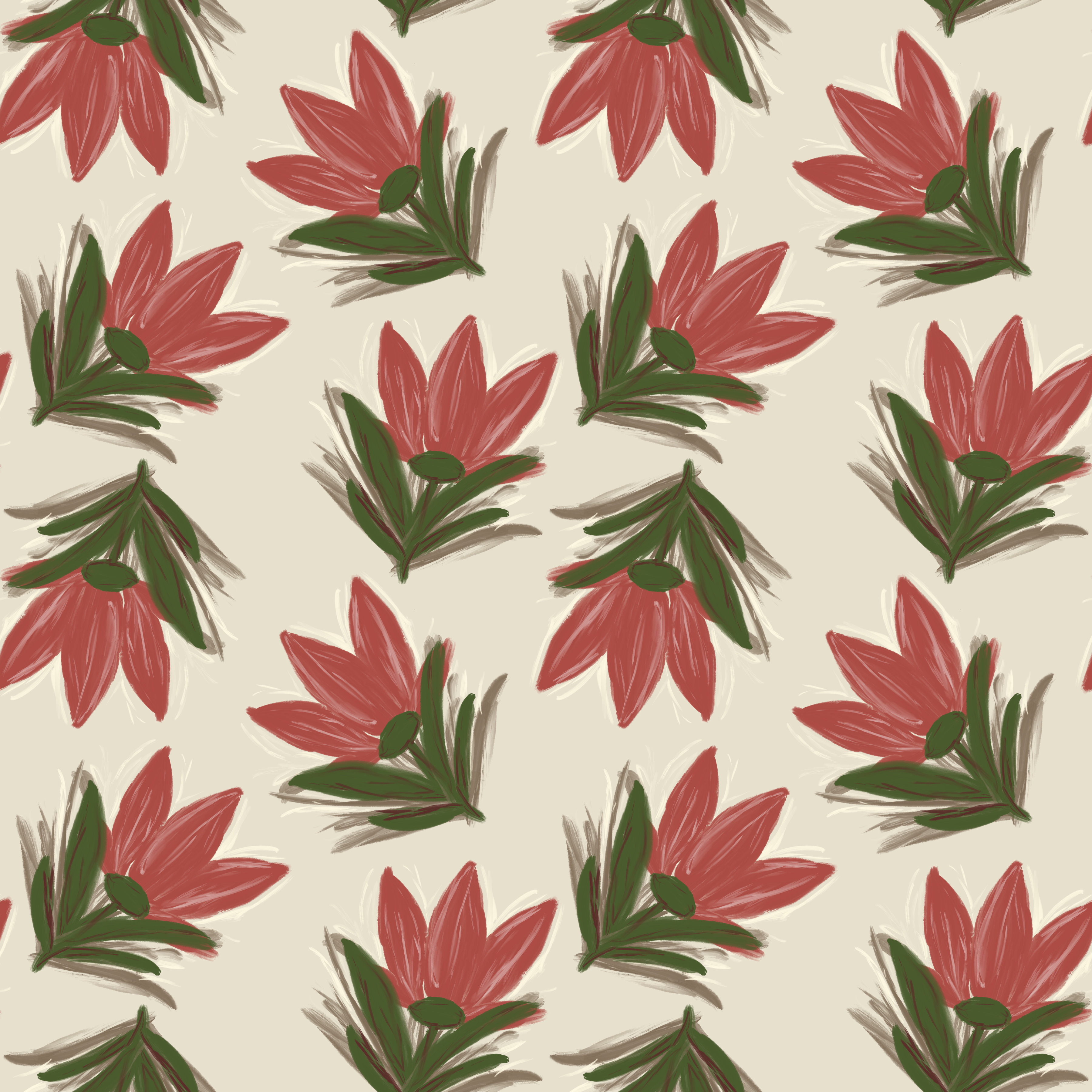 For the curtains, I created my own seamless repeating pattern which was inspired by pages 42, 80, 84, and 131 of The Pattern Sourcebook by Drusilla Cole. The dry brush style and loose, messy florals populated curtain and tablecloth designs. I think my design is a little too minimalist for the time, as denser, more busy patterns were favoured, but I felt detail was lost in the smaller repeats. Maybe I could’ve added something in the gaps between the flowers.