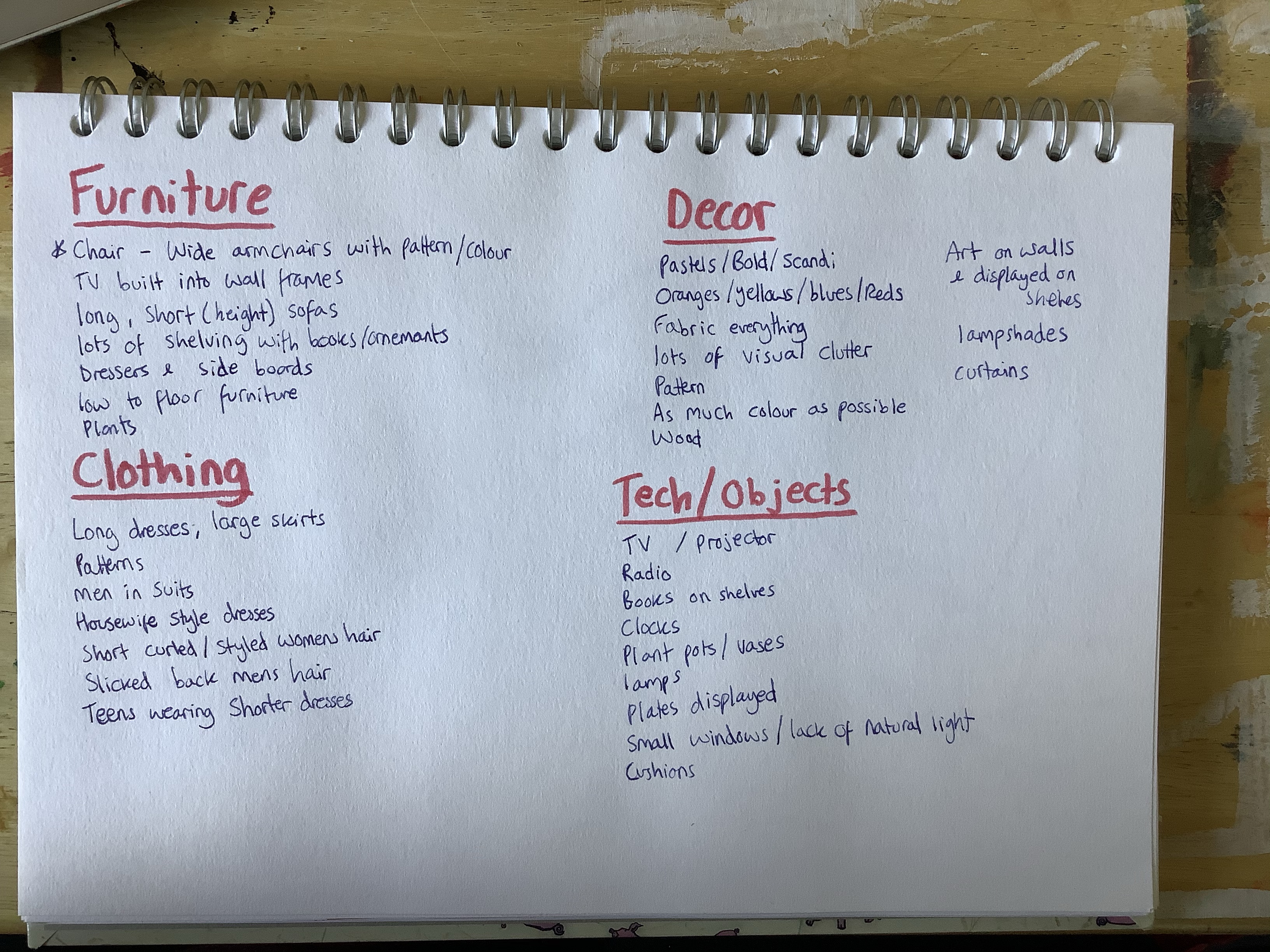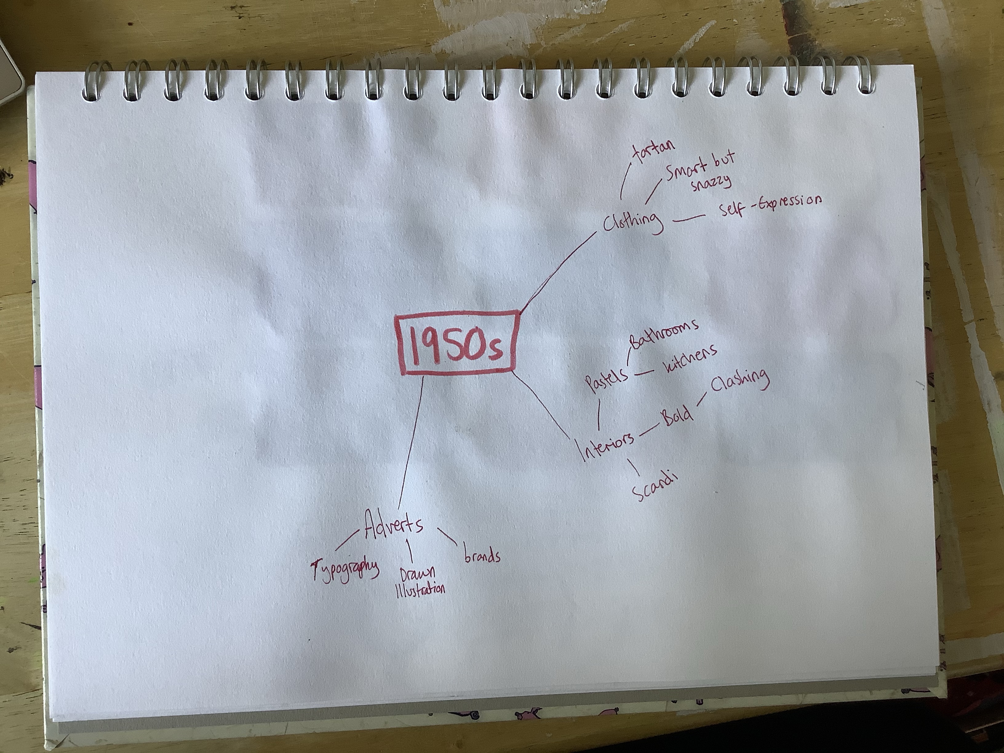 The first thing I decided to do was to do a spider diagram, using the reference material I had collected, to determine what were ‘typical artifacts’ from the 1950s and what I wanted to include in my illustration. I was struggling to make progress with this, so tried a different technique instead. I wrote headers for the areas I would need to reference in my illustration, and then looked through my reference images and wrote what I could see that connected to these themes.
