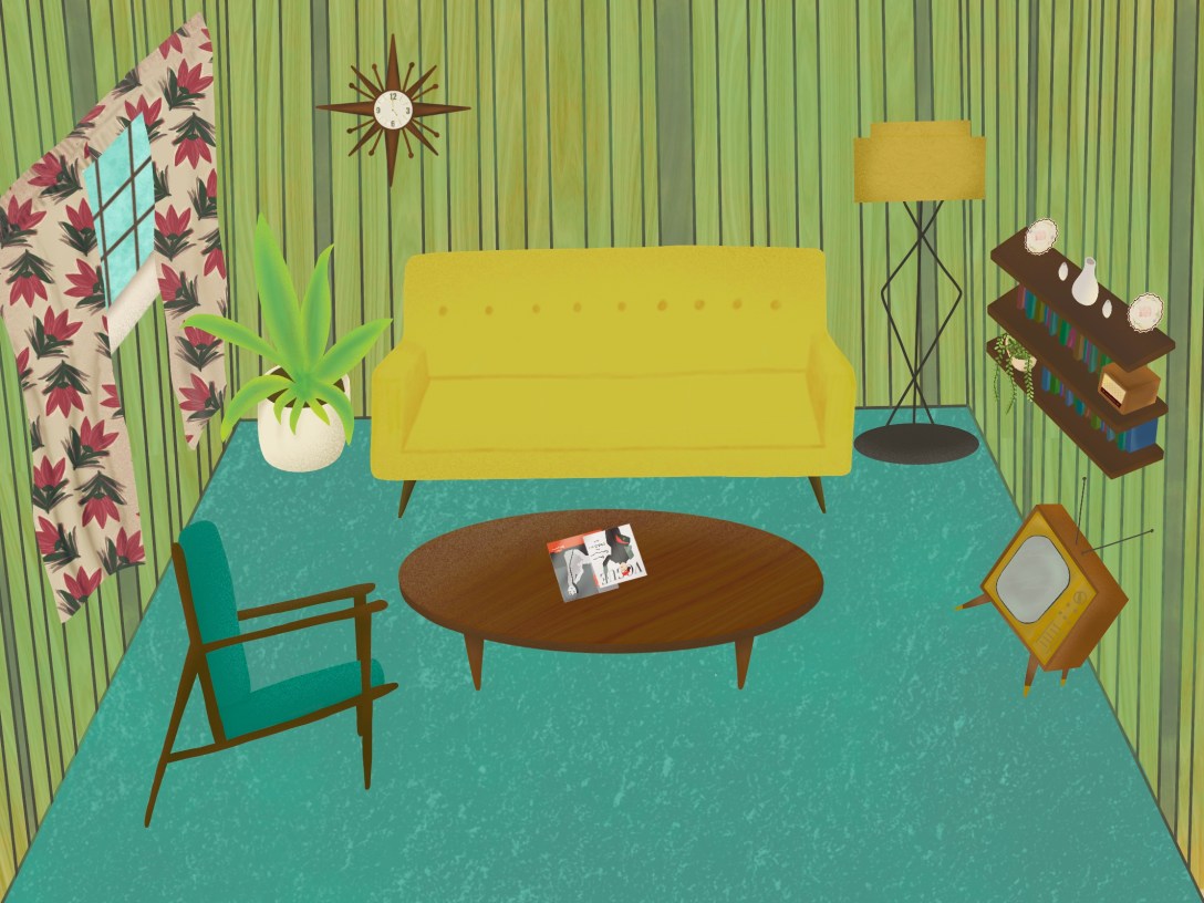 Beginning with the walls, I tried to emulate the wooden nordic style commonly seen in interior decor at the time. I then added a classic sofa, coffee table, and arm chair, wanting to really accentuate how low to the floor these things were, and the sharp angles the legs had. I loved the shading technique I used on the sofa, and was so happy with how it came out. I also really like how clean the overall illustration feels without linework. The colour palette for the piece was centered around the walls and sofa, as I felt yellow was very appropriate for the time. Interiors, especially living rooms, all look quite dark too. There was little natural light, and a lot of dark colours consistently used.