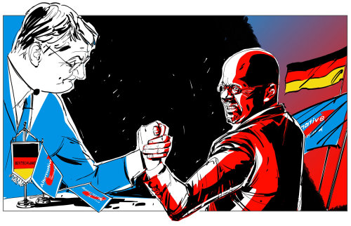 Similarly, Fabio Lyra and Silke Bachmann draw comic style illustrations, using one or two colours to show highlights and contrast. Lyra’s work however uses a more modernised style of comic illustration, whereas Bachmann opts for traditional political comics and pop art styles.
