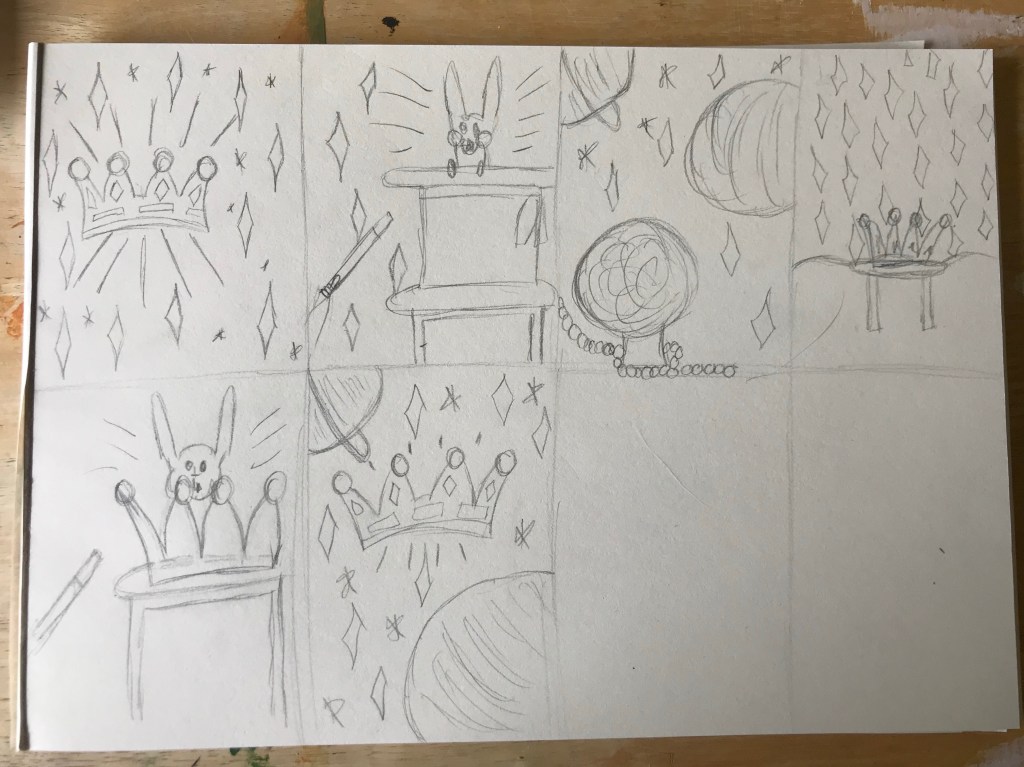 In my sketchbook I then began drawing several small thumbnail sketches, building on previous ideas as I went. My first idea was to have a crown in the centre of the drawing, surrounded by stars and sparkles. My second was to have a rabbit coming out of a hat as if in a magic show. I loved the sparkles I used in the first idea, so I carried them across to most of my other ones. My third idea was for there to be a crystal ball with a space background, with it almost looking like the crystal ball is a planet itself. I liked this idea a lot, but I wasn’t sure how I would communicate the difference between the ball and the planets using only black and white.