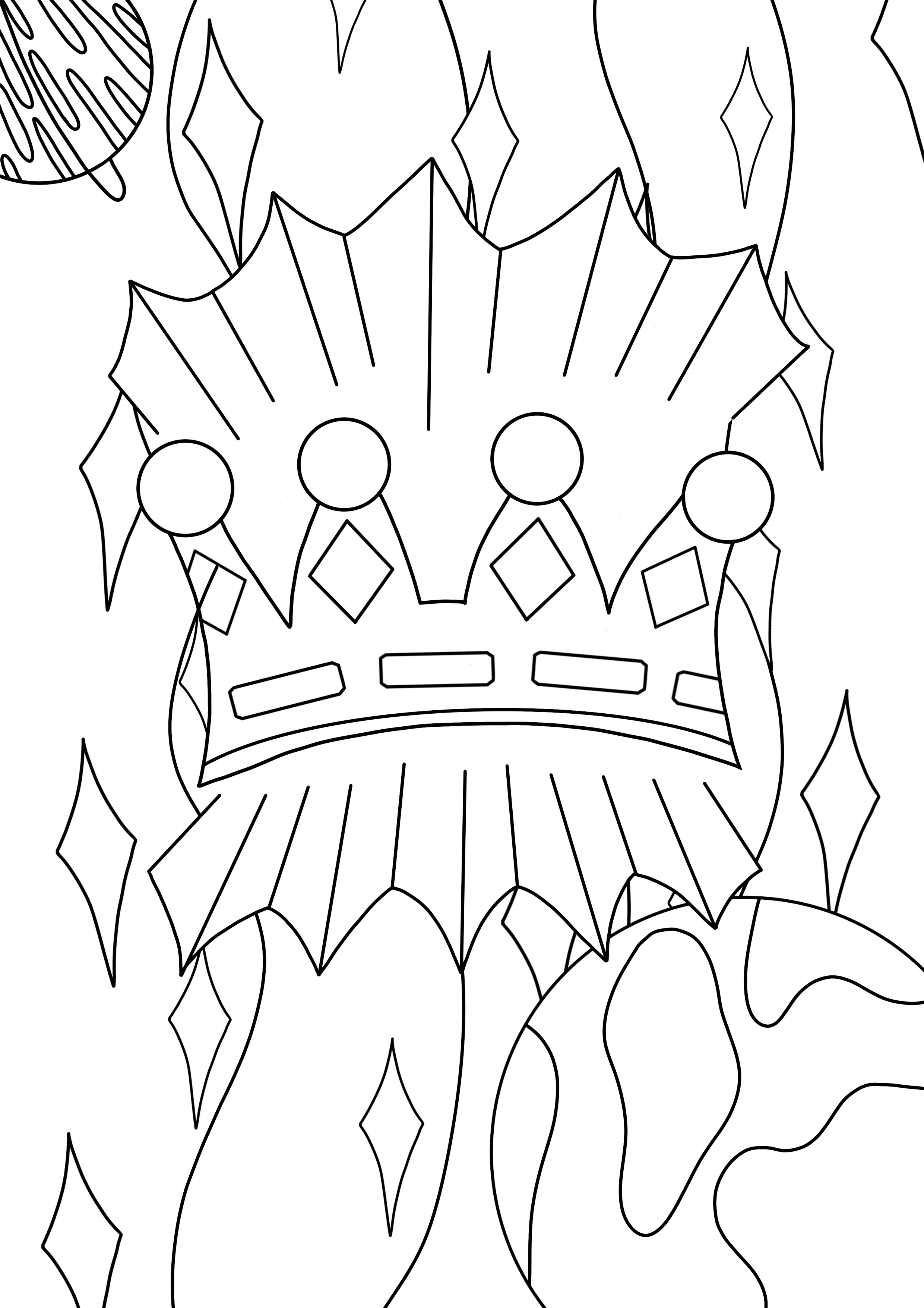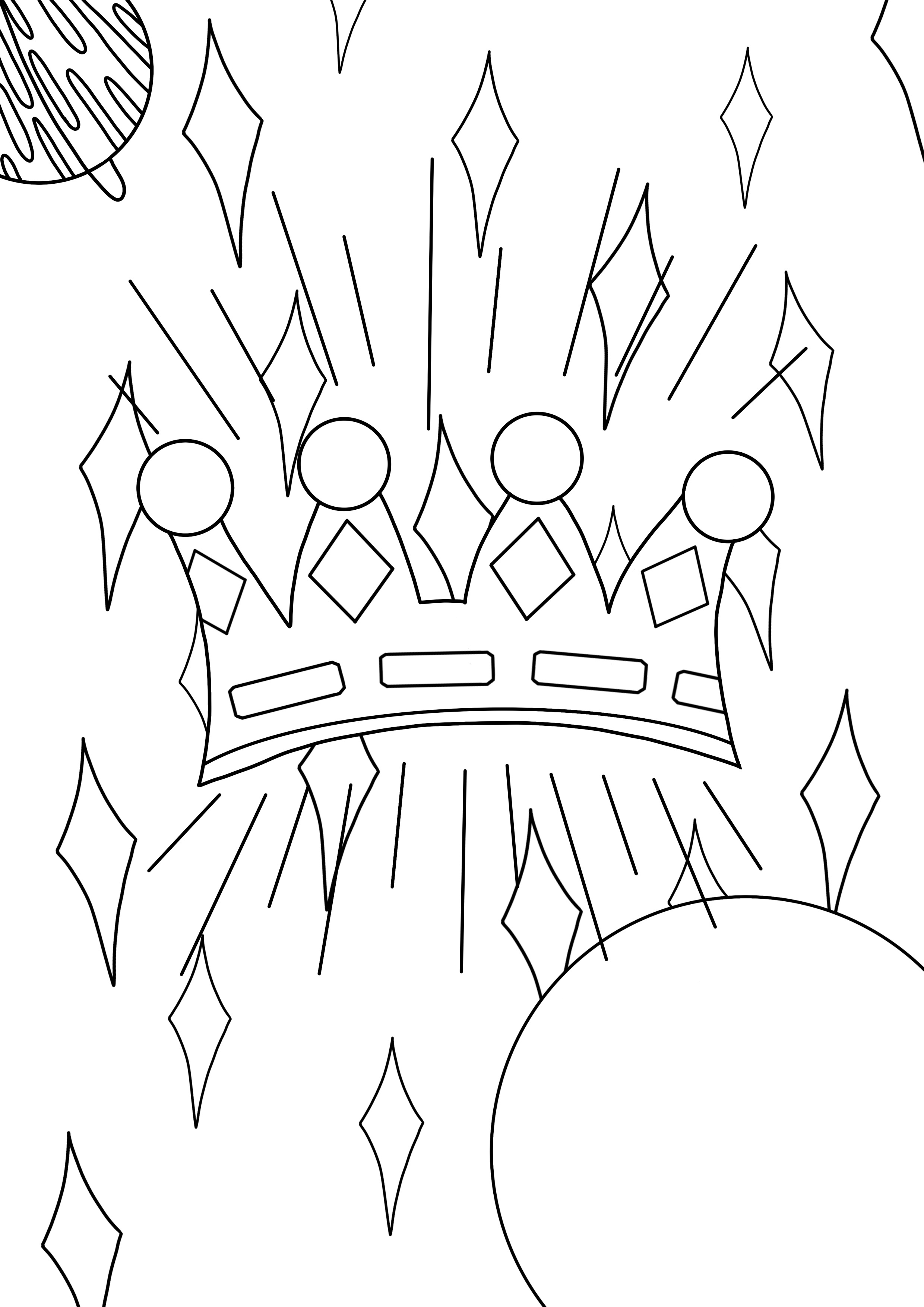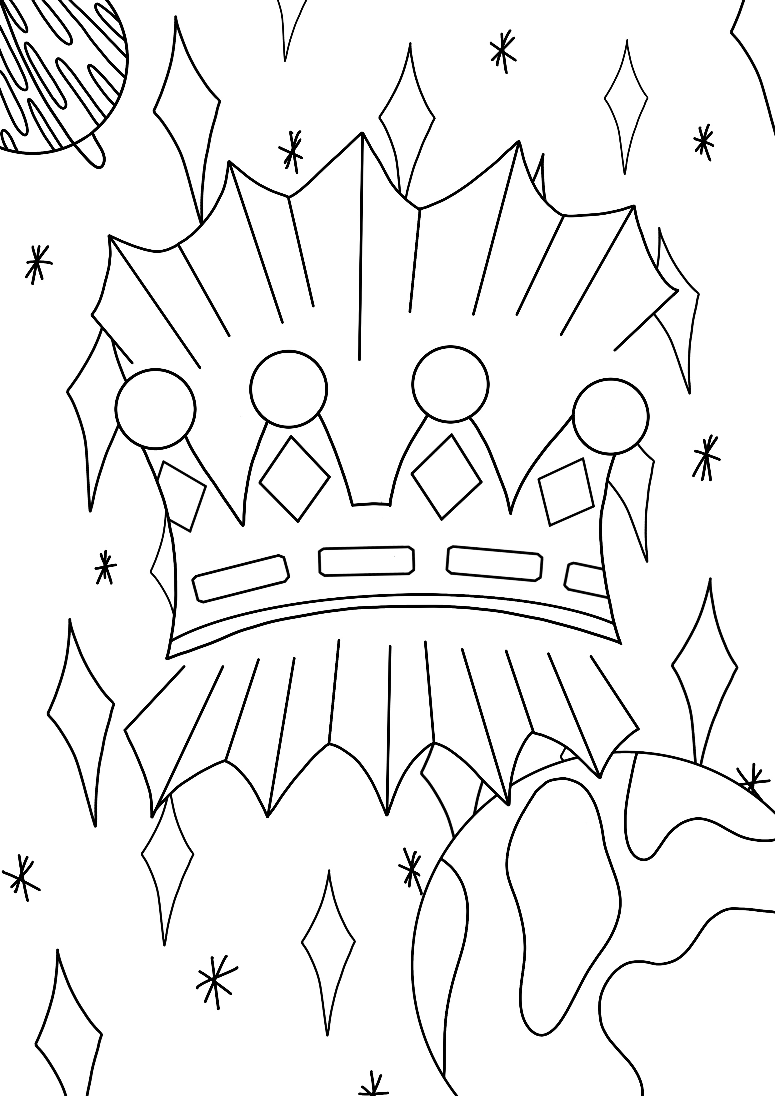 I drew my line art digitally as I wanted really bold lines to work with. To start with, I copied the thumbnail I drew initially, making a few slight changes here and there. The result was too cluttered, and didn’t have much visual hierarchy. I felt it would be difficult to fill in once printed. I decided to connect the lines around the crown, as they were meant to be rays of light, and having the space connected meant I could fill it to show that. I also added some detail to the planet on the right, as it was quite empty and plain. I considered adding smaller stars like my original idea, but ultimately decided against it as I wasn’t sure how to include them in the rest of the project.