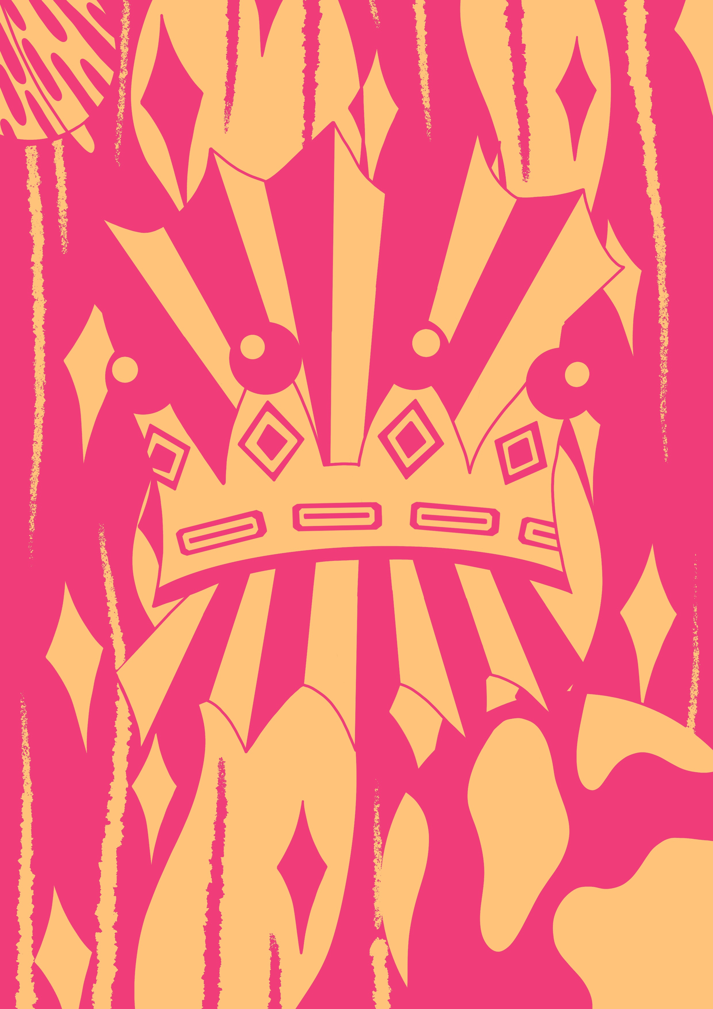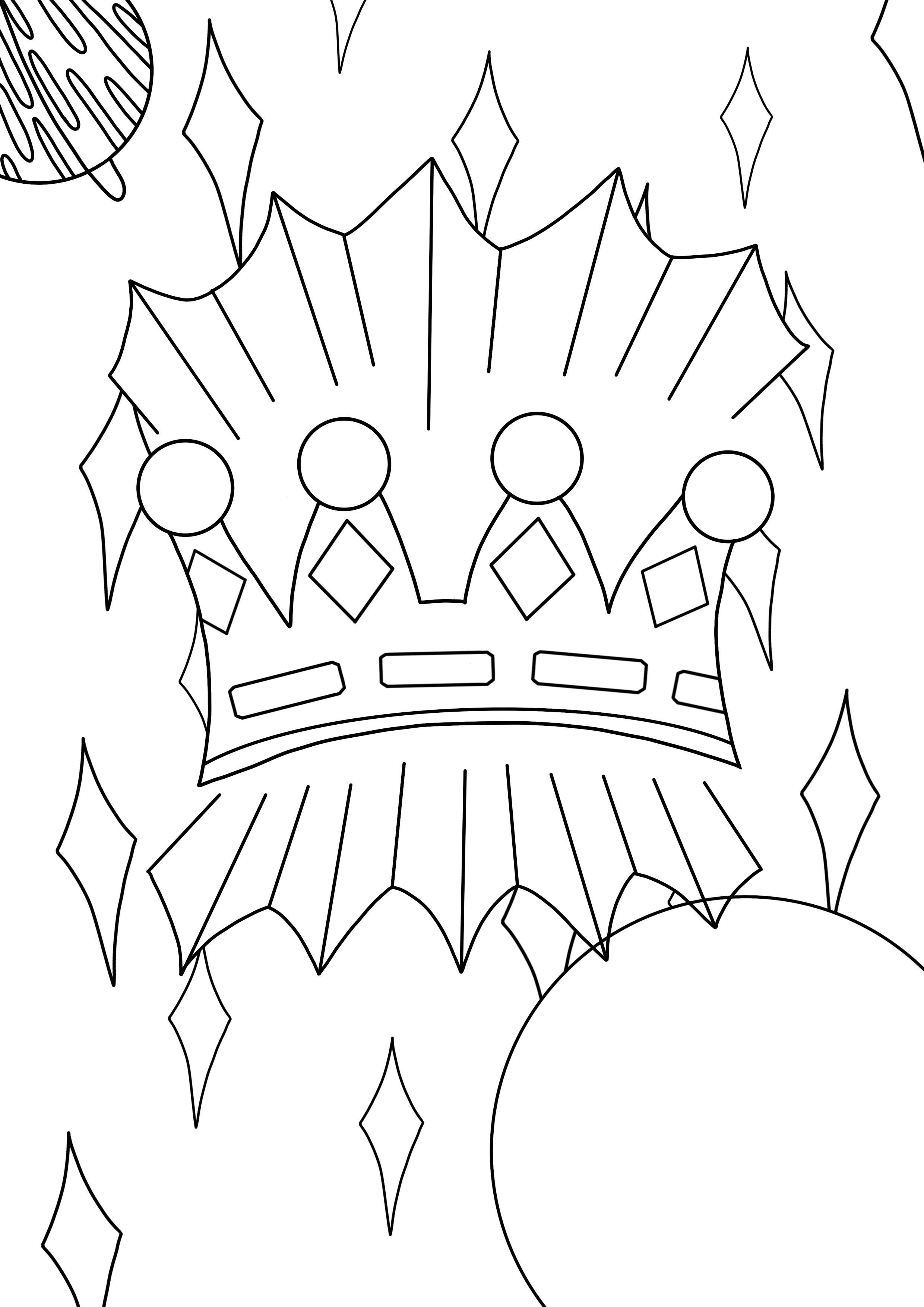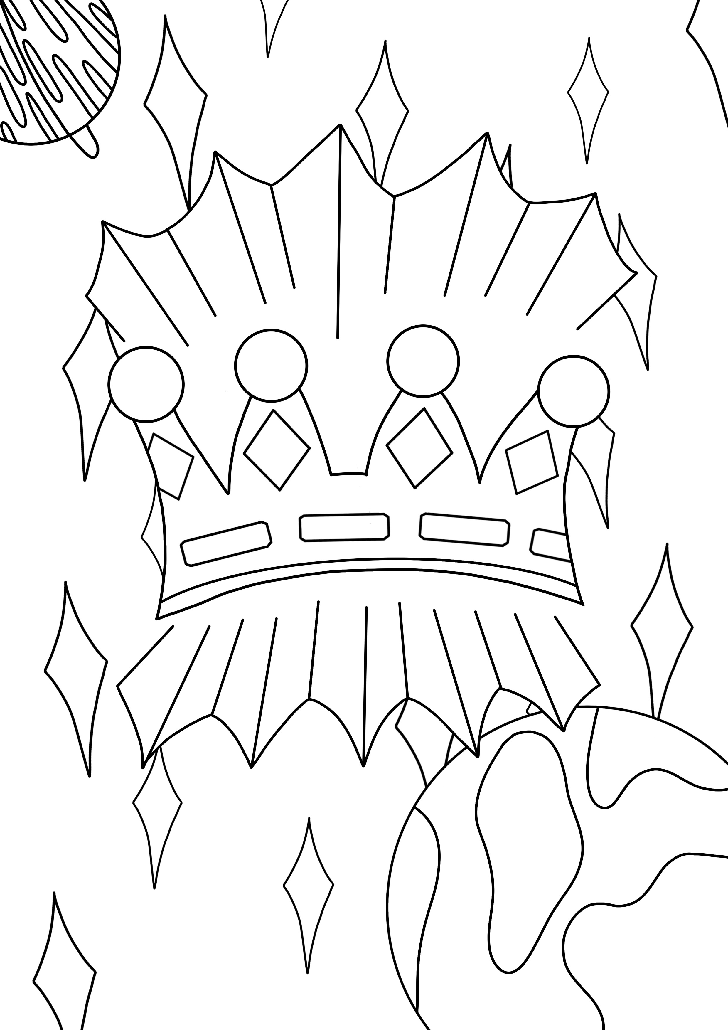 I drew my line art digitally as I wanted really bold lines to work with. To start with, I copied the thumbnail I drew initially, making a few slight changes here and there. The result was too cluttered, and didn’t have much visual hierarchy. I felt it would be difficult to fill in once printed. I decided to connect the lines around the crown, as they were meant to be rays of light, and having the space connected meant I could fill it to show that. I also added some detail to the planet on the right, as it was quite empty and plain. I considered adding smaller stars like my original idea, but ultimately decided against it as I wasn’t sure how to include them in the rest of the project.