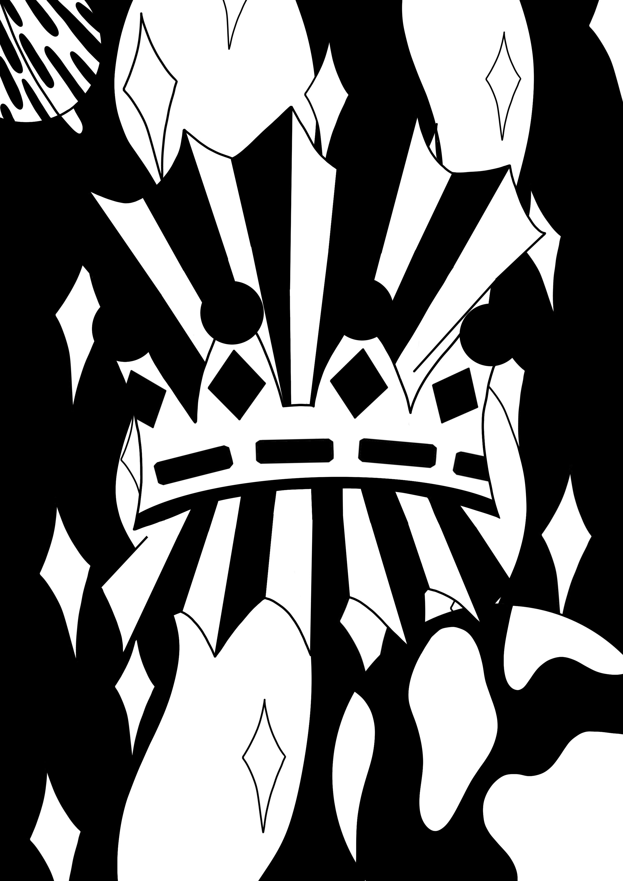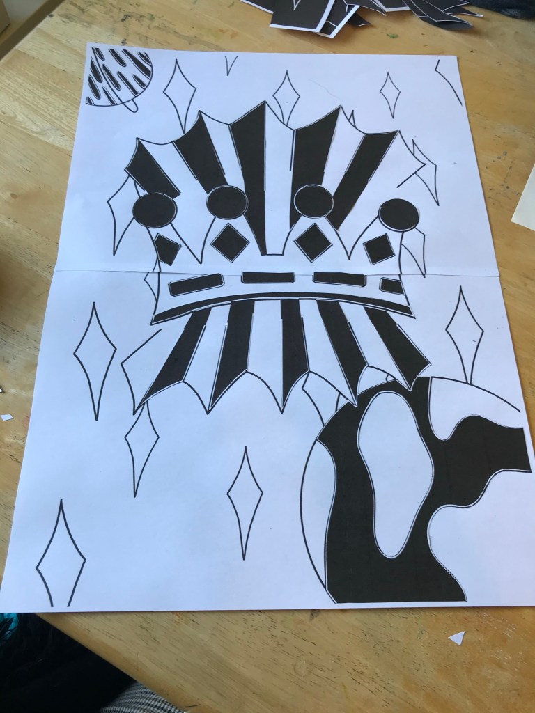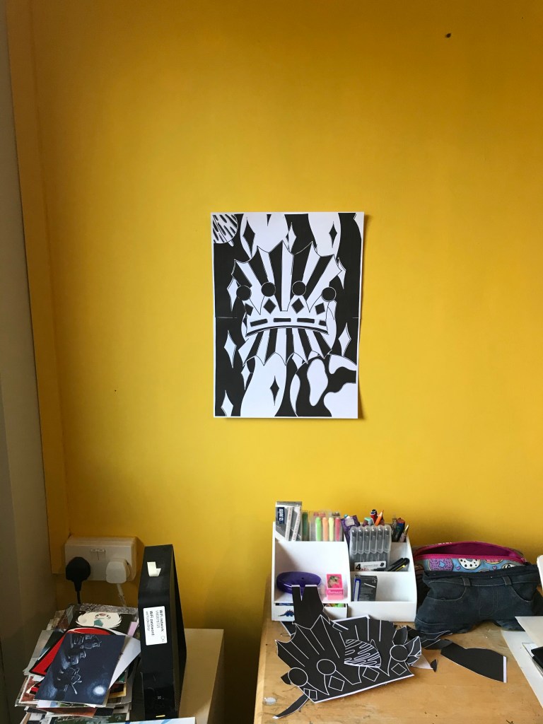 I then printed the image onto two A4 sheets and sellotaped them together to make it A3. I inverted the image and did the same. I began by filling the areas I knew I wanted to stand out – the rays of light around the crown, the crown itself, and the planets. Whilst doing this, I was thinking ahead about where colour would go, where I would add white later, and what to do with the background. I realised I couldn’t just leave it empty, so I needed to print more black to fill it. I went back to my digital line art and filled in where I wanted the black to be in the background, along with the areas I had already filled in. This was helpful as it meant I could form a plan for where I would be placing colour and see if it works in advance. It also meant I could cut exactly what I needed from the page.