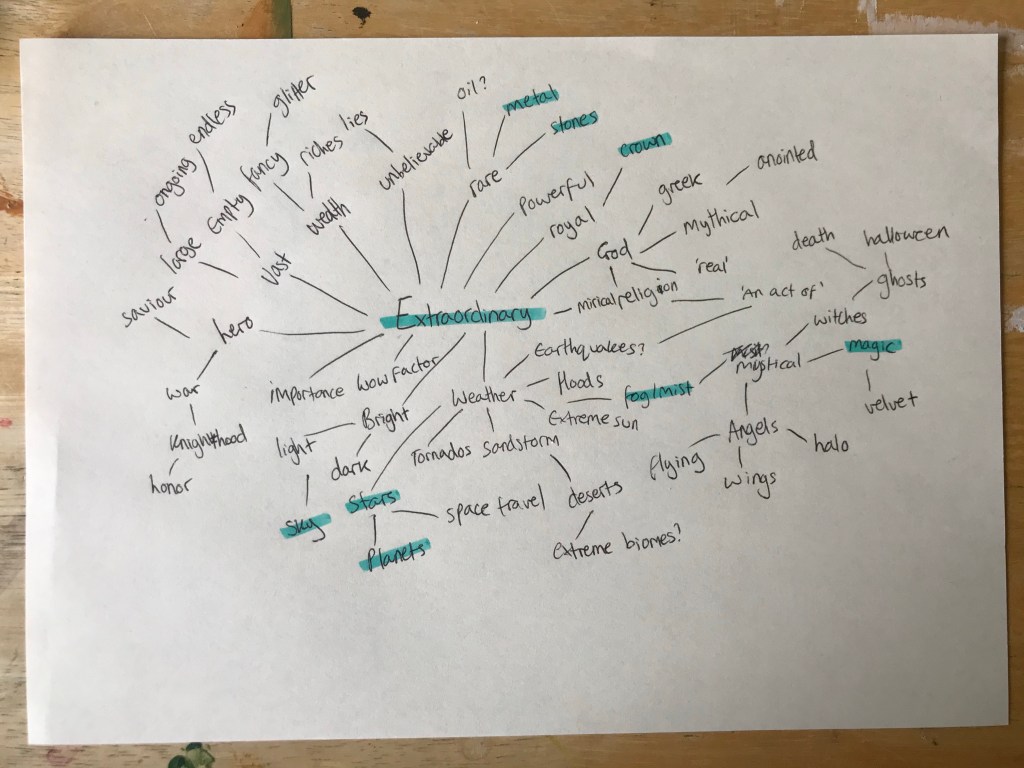 I decided to choose the word ‘extraordinary’ for my inspiration, as I felt it was the most vague and open ended word. I wanted to really explore what I could make with this exercise, and create something that felt true to my style and interests. I began by mind mapping all the things I could think of in relation to the word, which I really enjoyed. I made a lot of connections that excited me and gave me several ideas on what to draw. Once I felt I couldn’t produce any more ideas, I highlighted the words that stuck out to me, the ones that I felt screamed ‘extraordinary’.