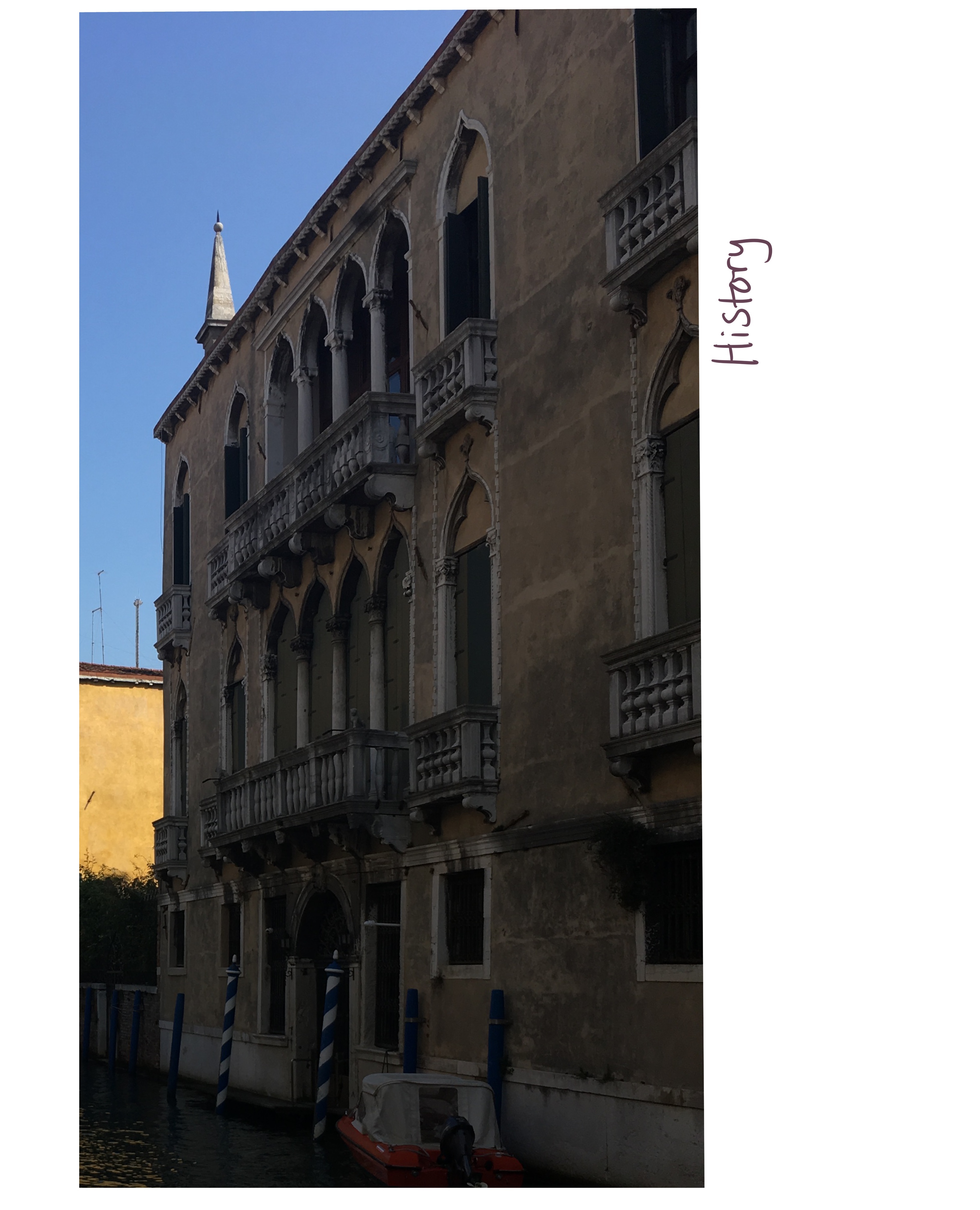 Initially, I wanted to use the ‘Italy’ image as a basis for my poster, combining it with the ‘rooftops’ image and having the placement of the buildings quite low in the frame with the word ‘Italy’ above. I tried to sketch out some ideas and wasn’t very happy with them. I looked back again at my images and the words tied to them, and how the colours in them and potential textures relate to the chosen words, and realised ‘History’ was a much stronger piece.