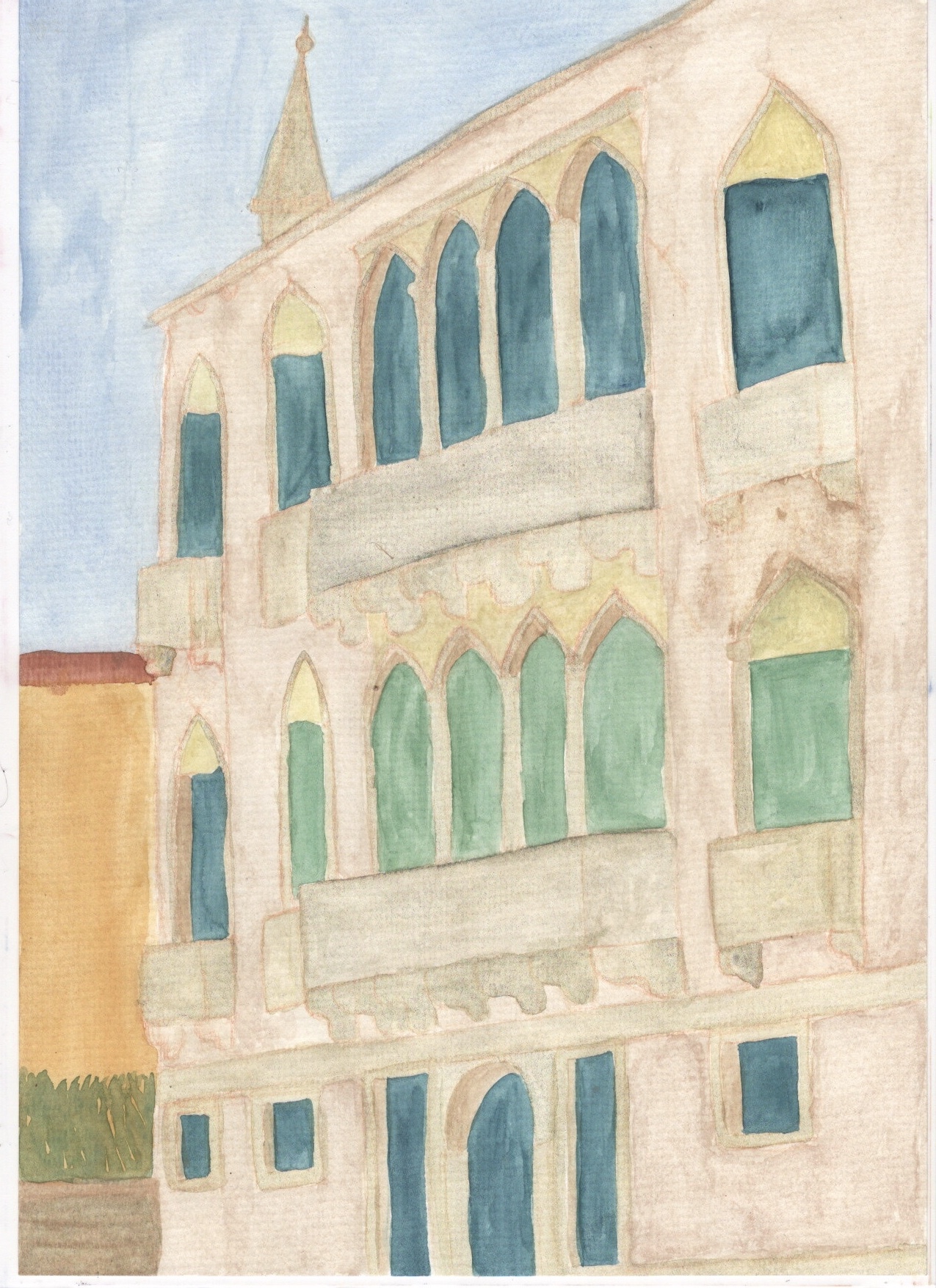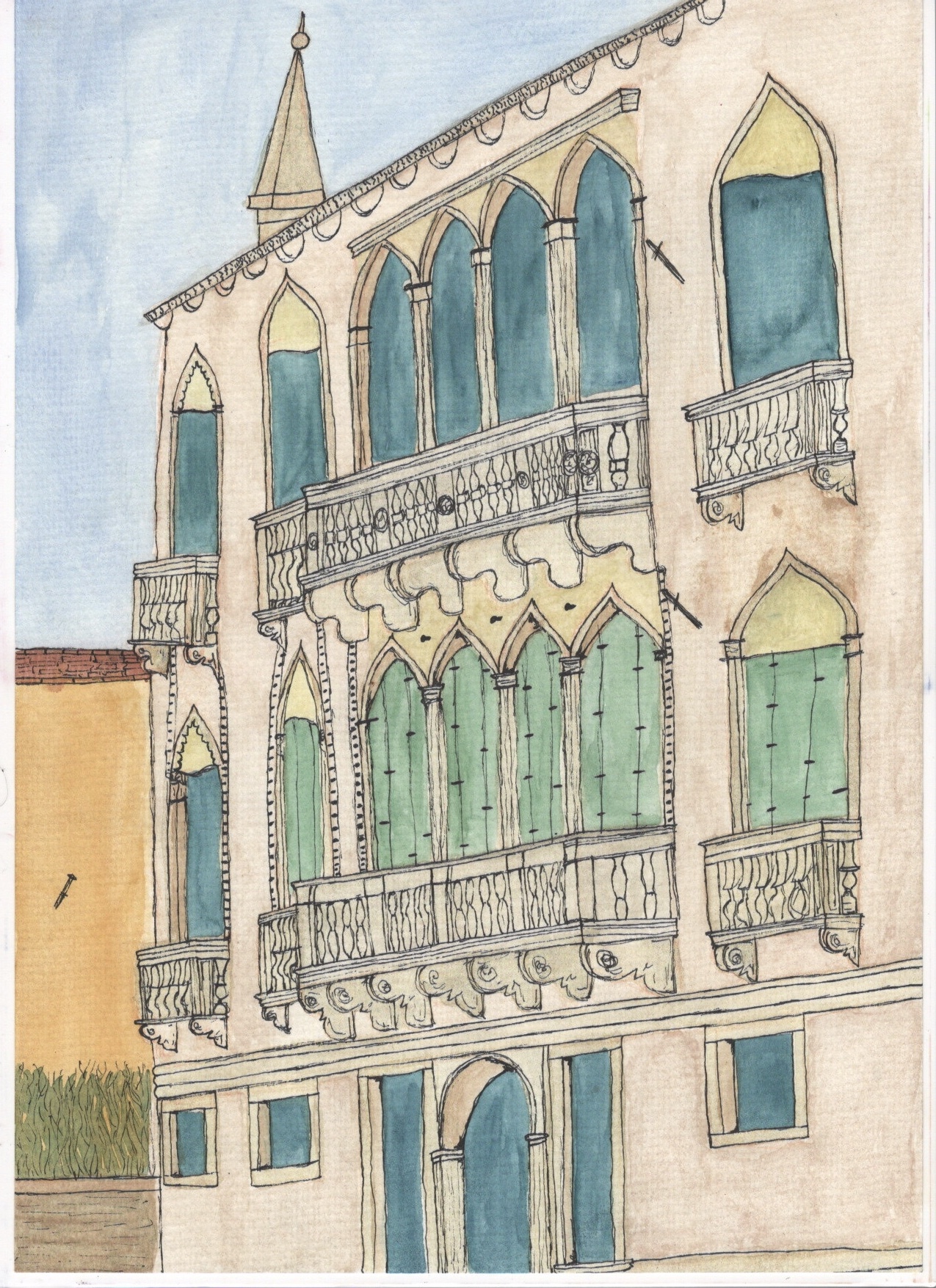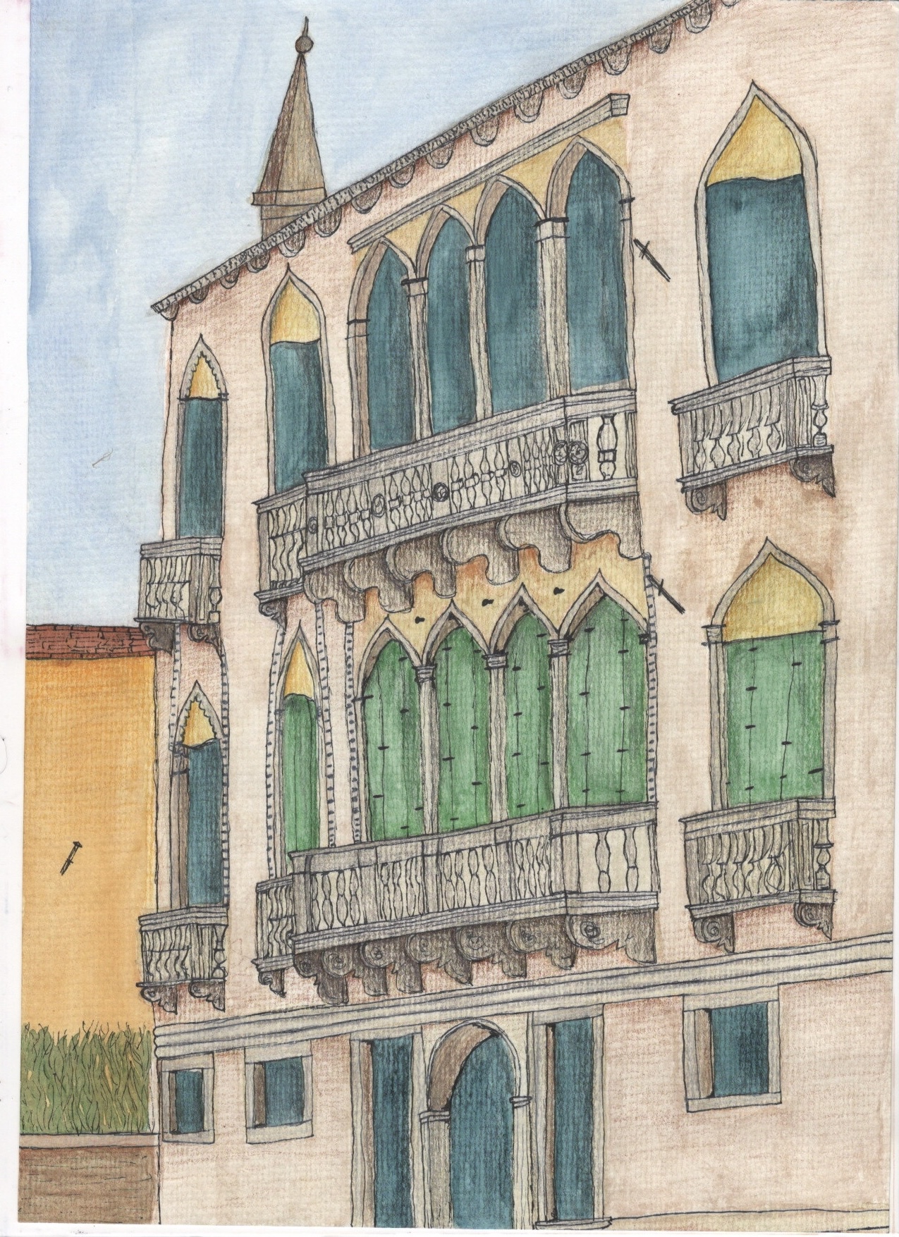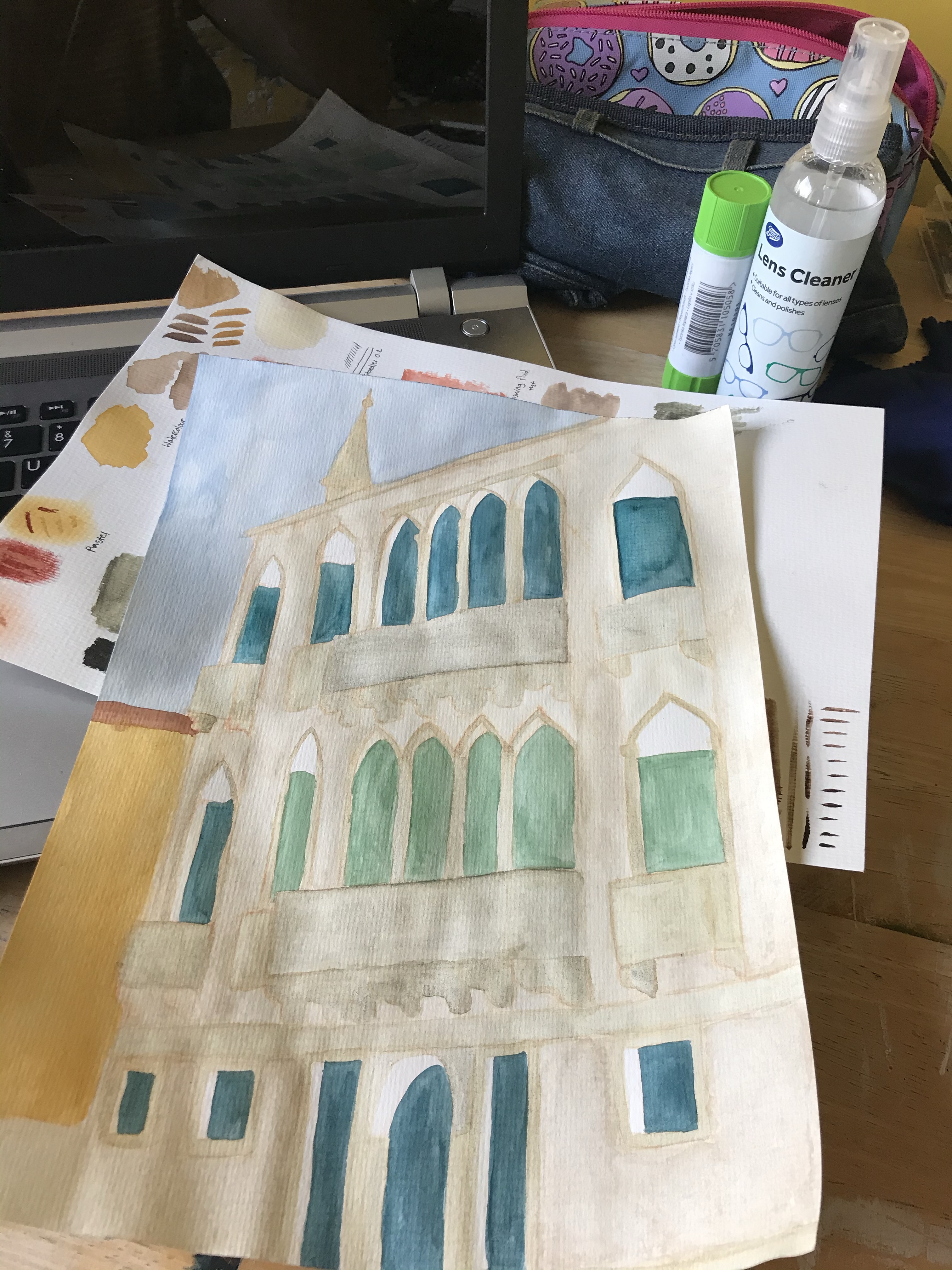 I then moved on to adding lineart and detail with fineliners. This took the illustration in a whole new direction as it really emphasised the building and the angle it’s at. Adding the detail brought it to life and transformed it from the flat image it was before – I enjoyed this step a lot. Next, I began shading and adding some extra texture and contrast using coloured pencils. This further emphasised the angle of the building and gave it a lot more depth. The pencil brings out the texture of the paper so much more than the paint, which added to the aged/historical look of the piece.