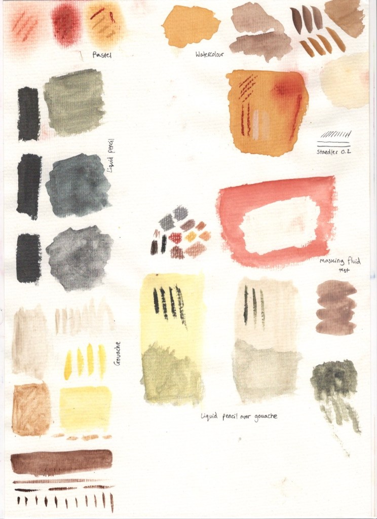 I decided to try out various materials and colourings to see how they interacted with the pastel paper and ensure I could achieve the effects I wanted to. This stage of the process was also a lot of fun, and taught me about the importance of experimenting before working on a final piece. It was great being able to reference this sheet as I continued with the illustration, and to use it to experiment further if I was curious about what to do next or how something would look on top of my previous layers.
