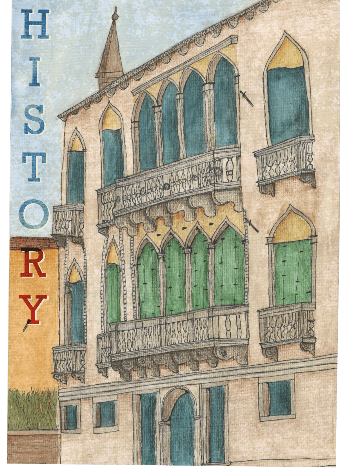 I then moved on to adding lineart and detail with fineliners. This took the illustration in a whole new direction as it really emphasised the building and the angle it’s at. Adding the detail brought it to life and transformed it from the flat image it was before – I enjoyed this step a lot. Next, I began shading and adding some extra texture and contrast using coloured pencils. This further emphasised the angle of the building and gave it a lot more depth. The pencil brings out the texture of the paper so much more than the paint, which added to the aged/historical look of the piece.