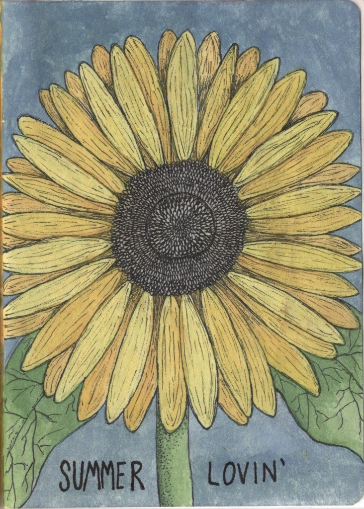 The third sketchbook I recieved was themed around seasons. Niki, who started the sketchbook, had began with a winter theme. Beth, who next recieved the book, decided to continue onto a spring theme. This meant when I recieved it, I got to explore the theme of ‘summer’. I love summer, it’s my favourite season of all, and with it being September it was still fresh on my mind, which helped a lot! Beth had introduced her section of the sketchbook with a sort of cover page for spring, and ended on a typography page. I wanted to keep up this theming, so began my 10 pages with a giant sunflower watercolour and the words ‘Summer Lovin” at the bottom.