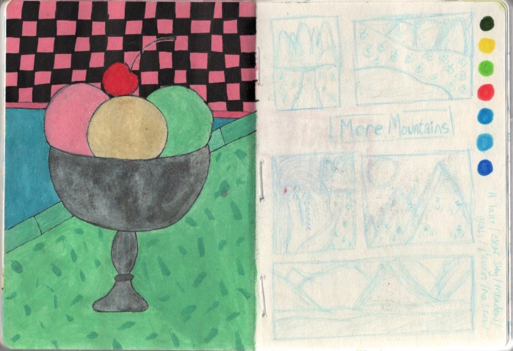 My next page I chose to do another watercolour illustration of my favourite year-round (but especially summer) drink – peach iced tea. This was fun but still just sketchy. It really showed me how great this paper is. I decided to illustrate some summer fruits on the next page and used water based markers for this, adding water to them to create some cool effects. This is a new technique I’ve not yet used, and I think I’ll experiment some more with it. I then really wanted to do a page of ice cream, and decided to work on an idea I’d considered for Inktober (which I ended up not participating in). I’m not super happy with the outcome of this page, but again it was a great learning experience.