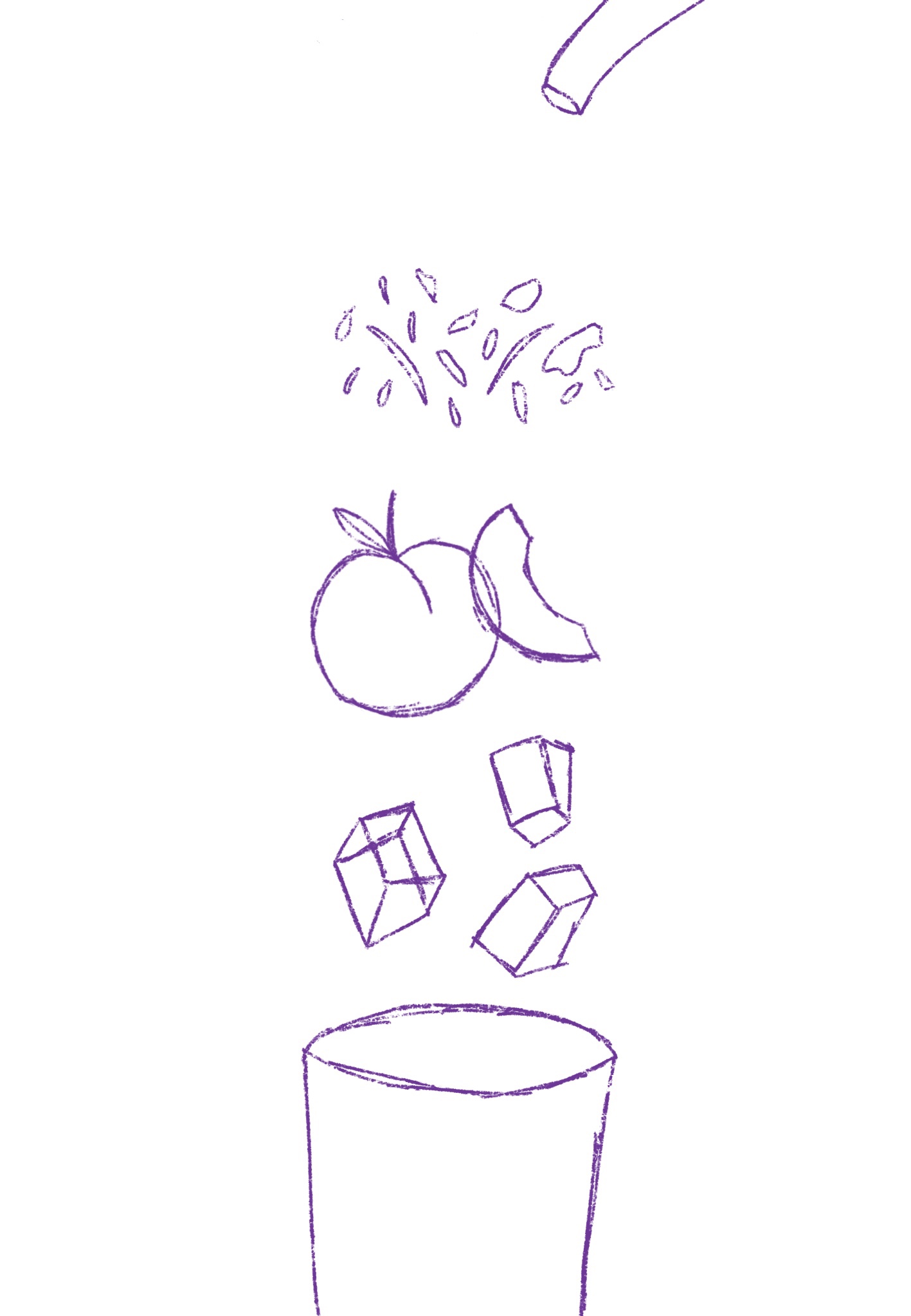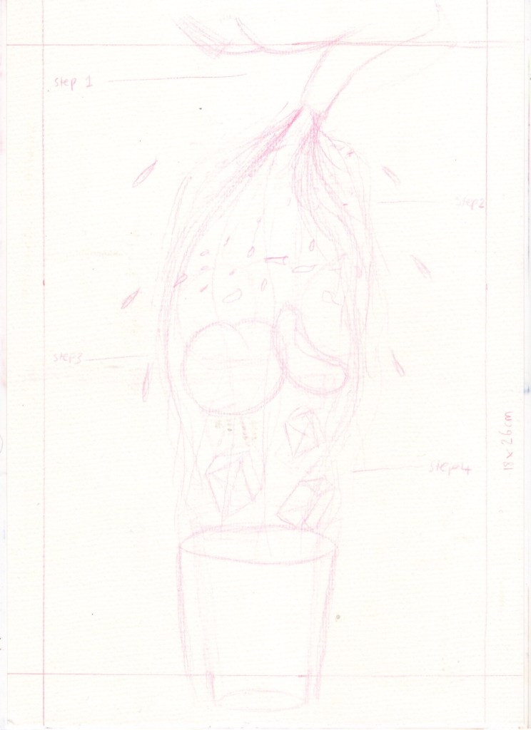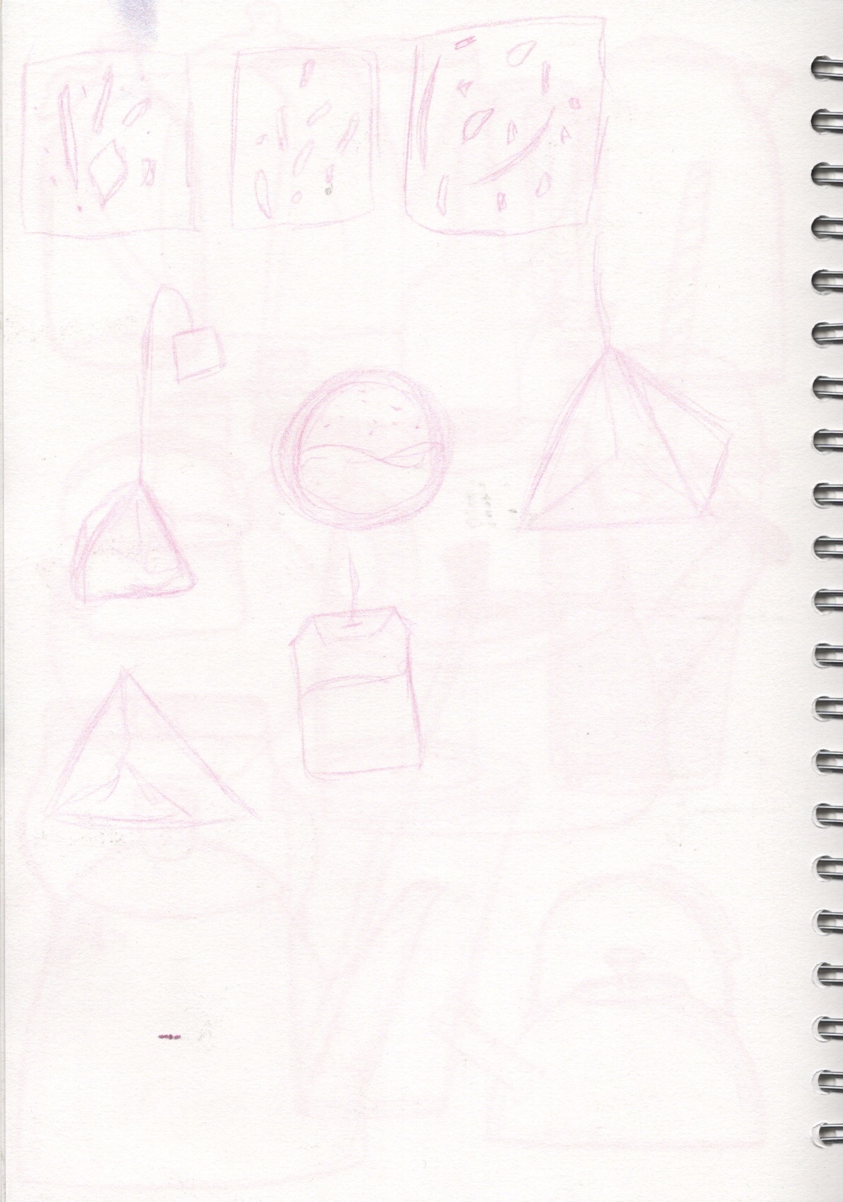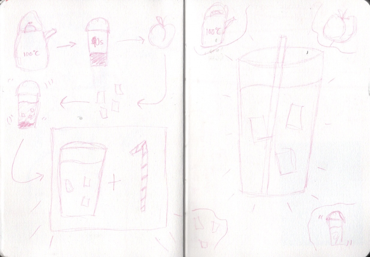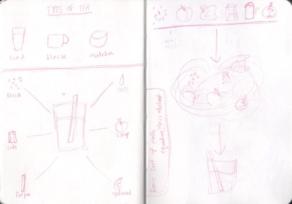 Inspired by what I’d found, I started sketching out some ideas. My first idea was to dissect the drink and place the elements in order of when they’re used in the making process, and have water flowing over them. My second idea was to draw each individual element and have arrows pointing to the next step. My third idea was to have a finished cup of iced tea in the centre of the page with elements circling around it showing the order in which you complete each step. My fourth idea was to do some sort of maths equation, having each element laid out and showing how they add up to equal iced tea. I felt my first and third ideas were strongest, but my first idea was my favourite overall. I did develop my third idea a little further to make sure I was confident on the first one, however.