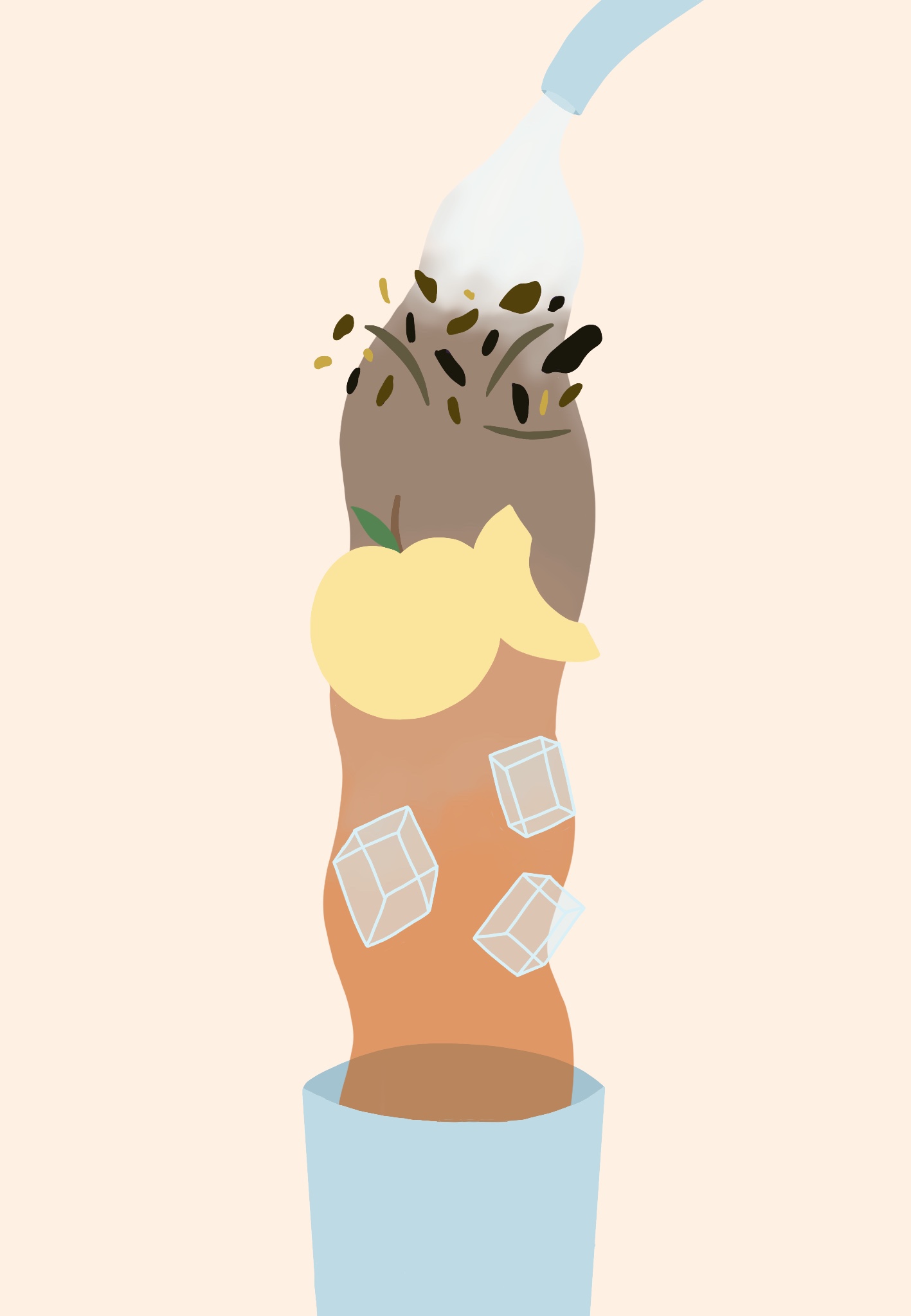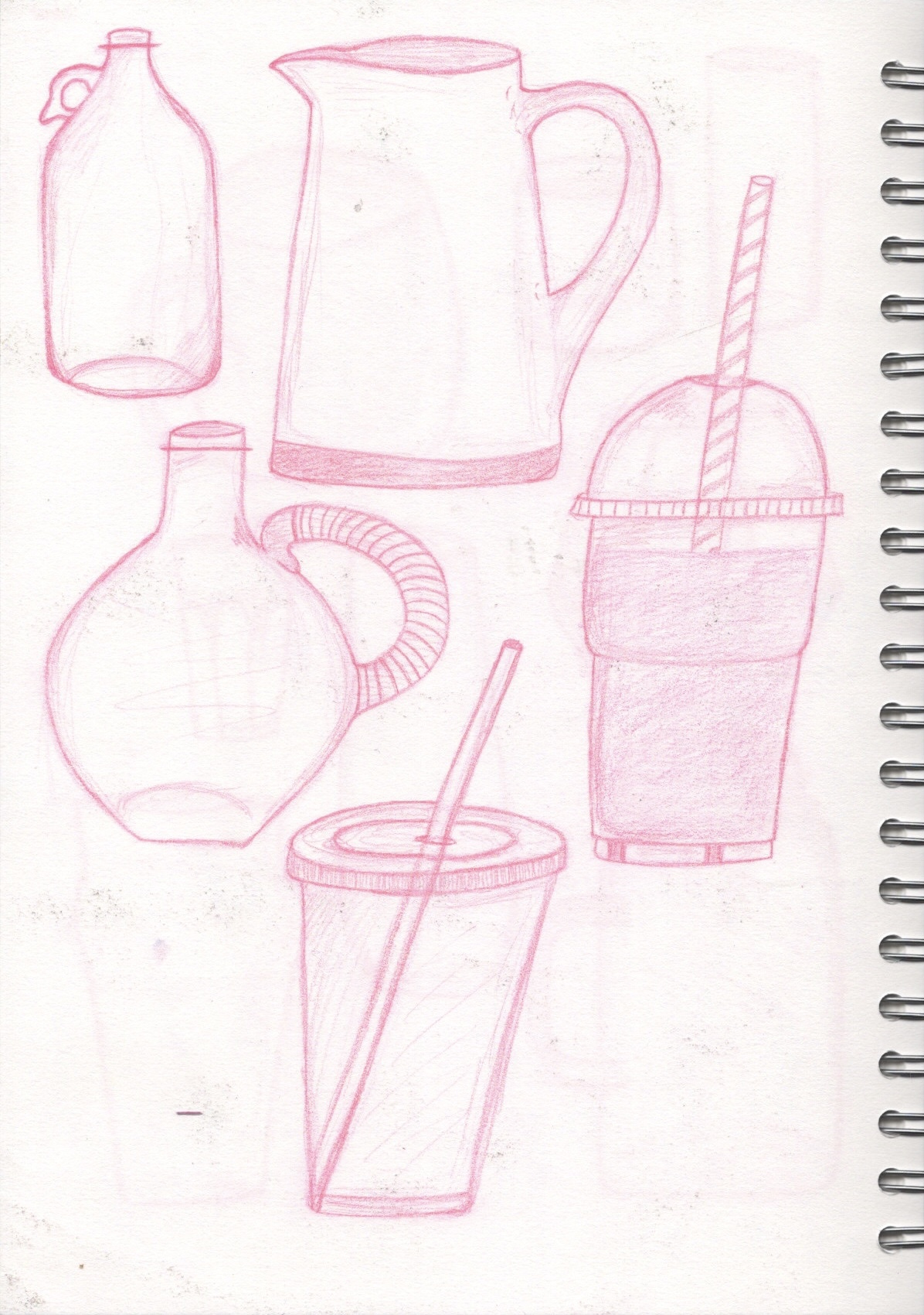 I knew that in my final piece I would have: a kettle or jug, tea in some form, peaches, ice cubes, and a glass or container for the tea. I wasn’t sure how to draw these or what shapes I wanted to include, so I made another pinterest board filled with references and options for what I could draw. I also included some illustrations by other artists to inspire me. I then sketched out variations of glasses, take-away cups, kettles, jugs, and tea bags, in an attempt to get a feel for the different objects and see what my preferred styles were. I really enjoyed this sort of observational drawing, and it helped me design the final piece.