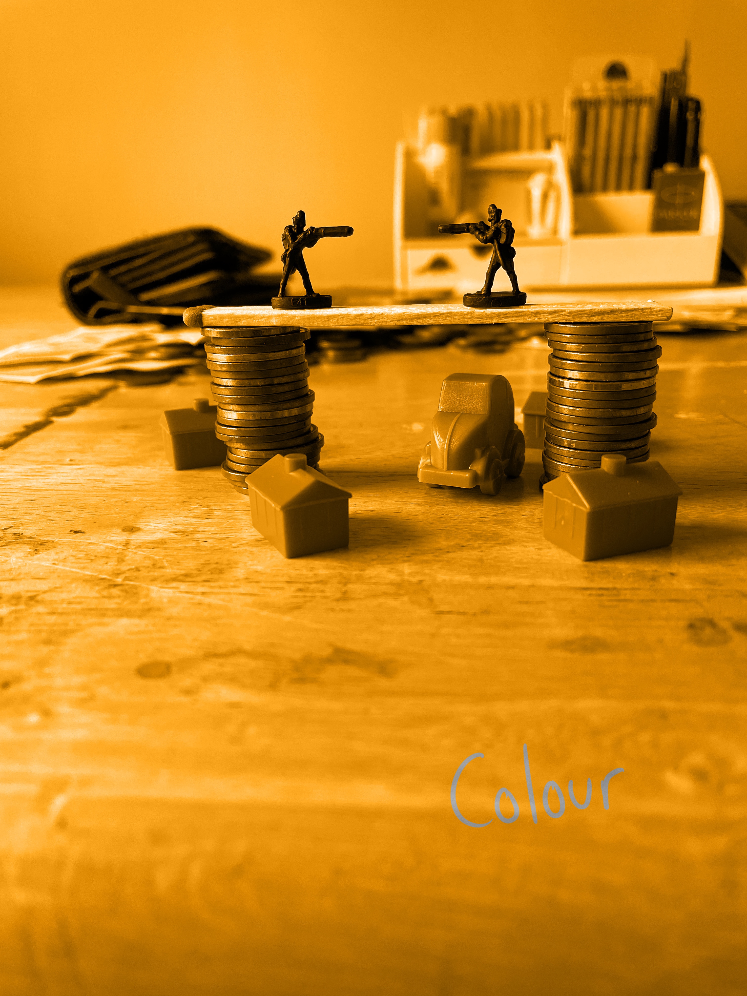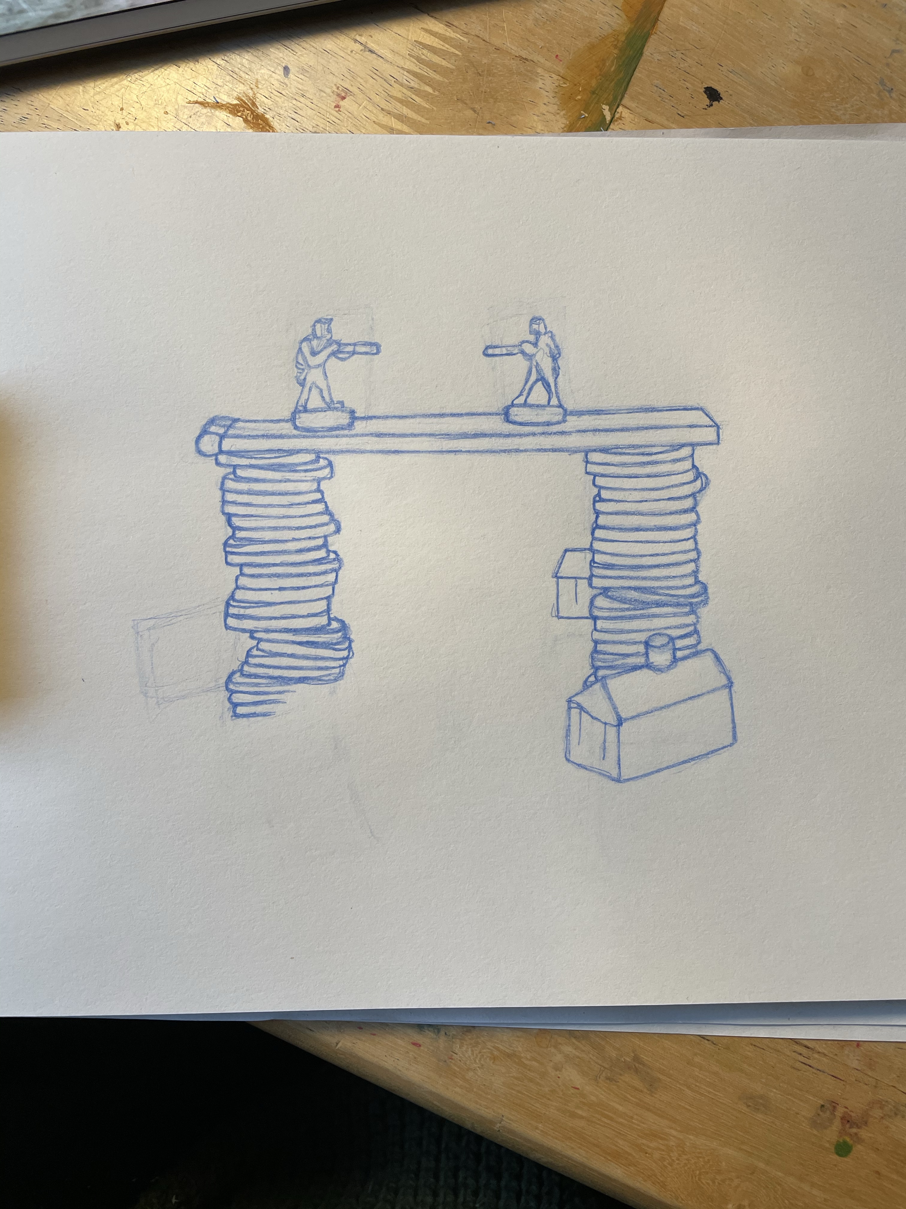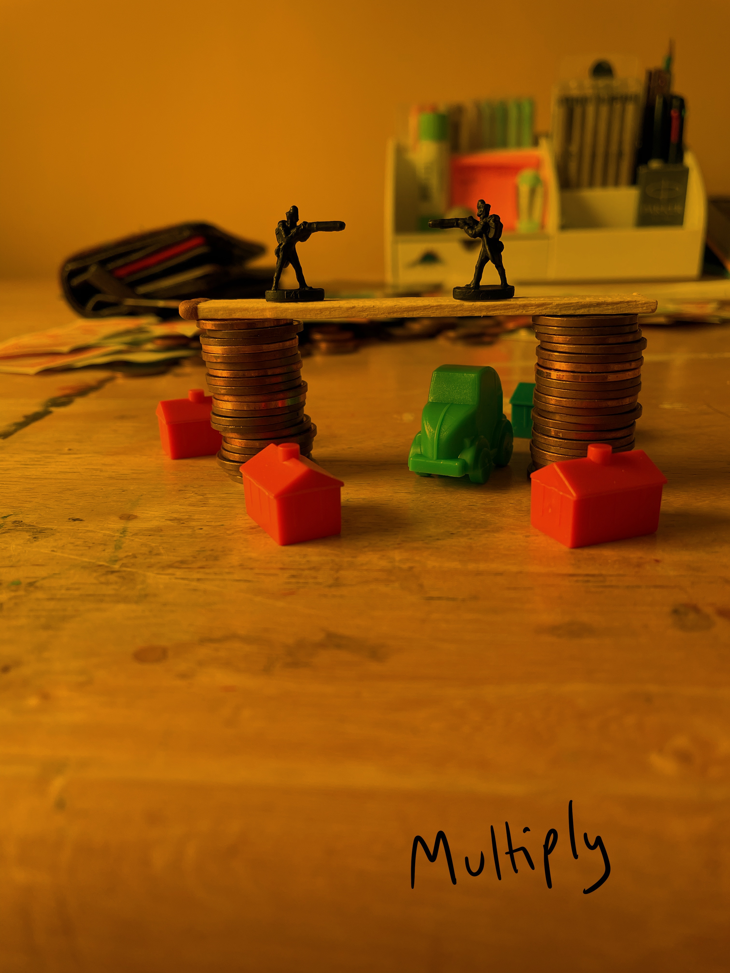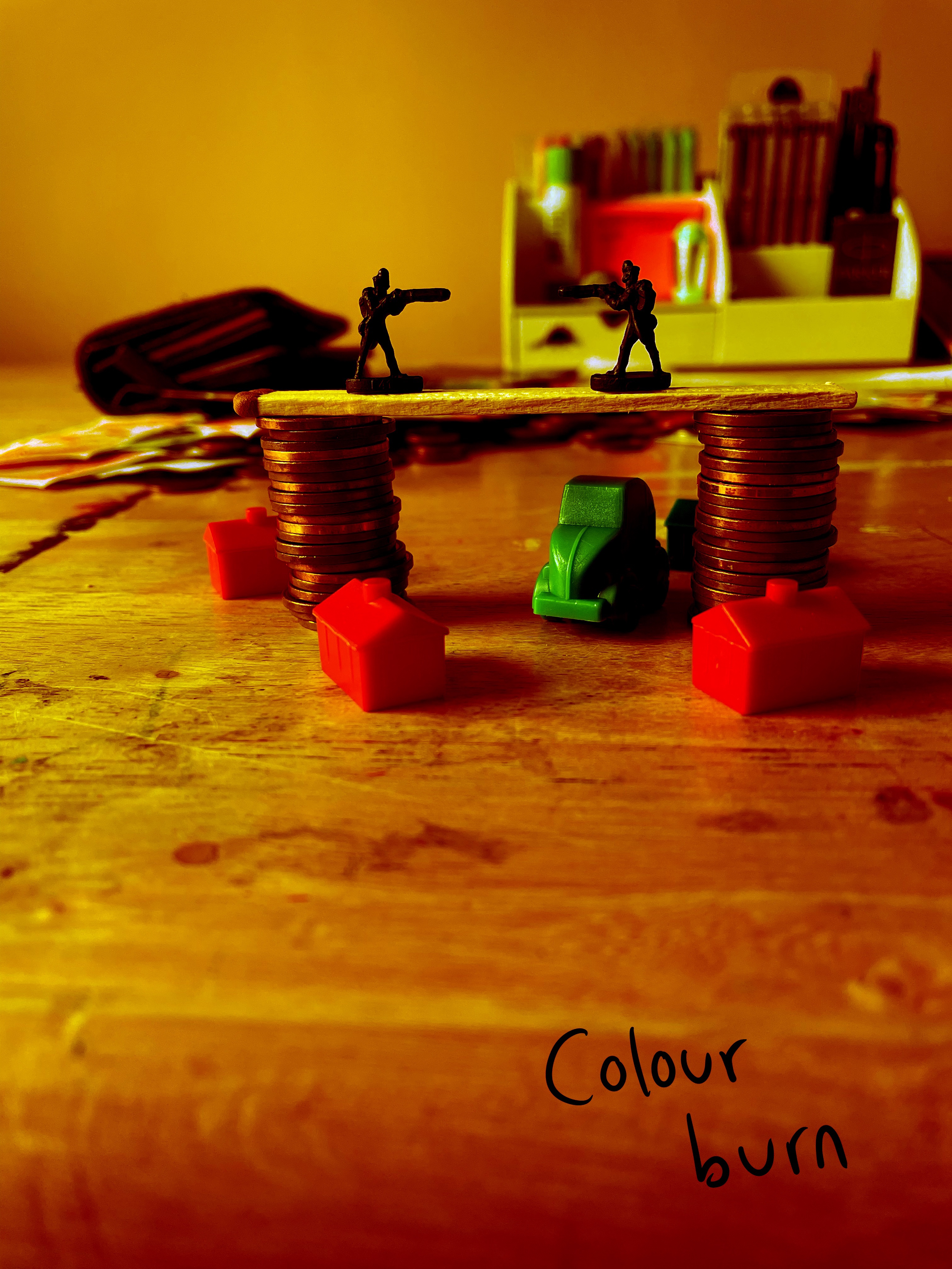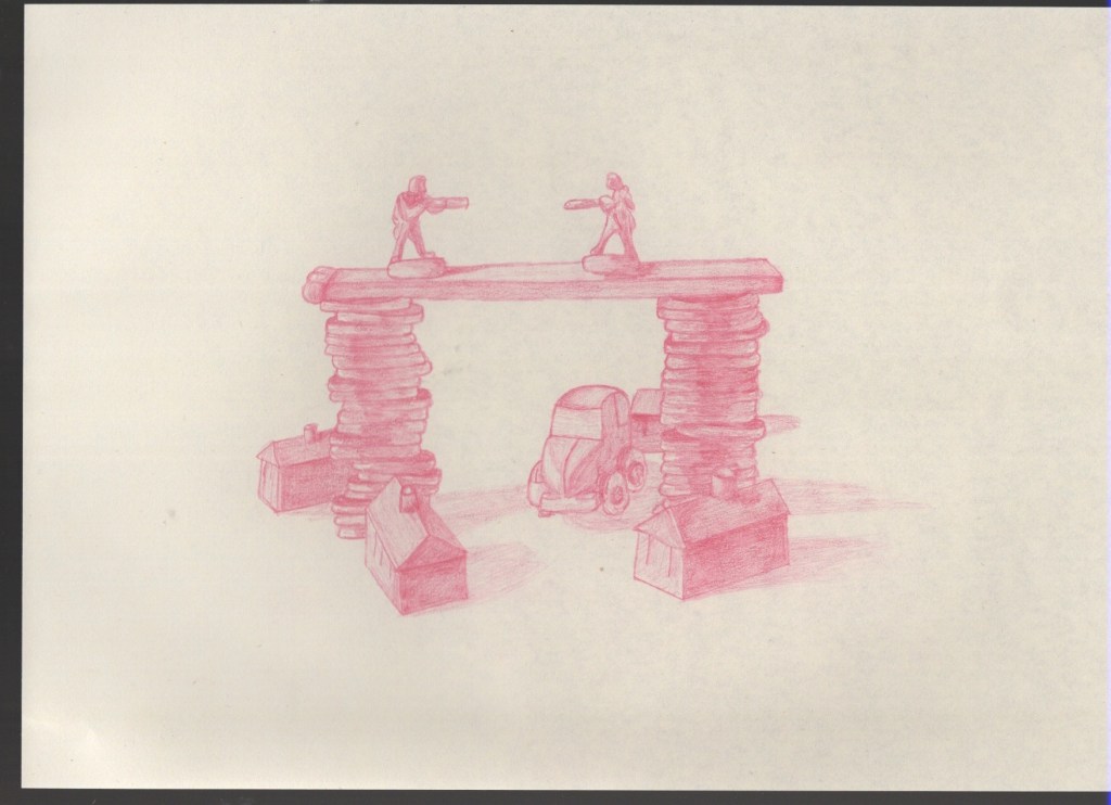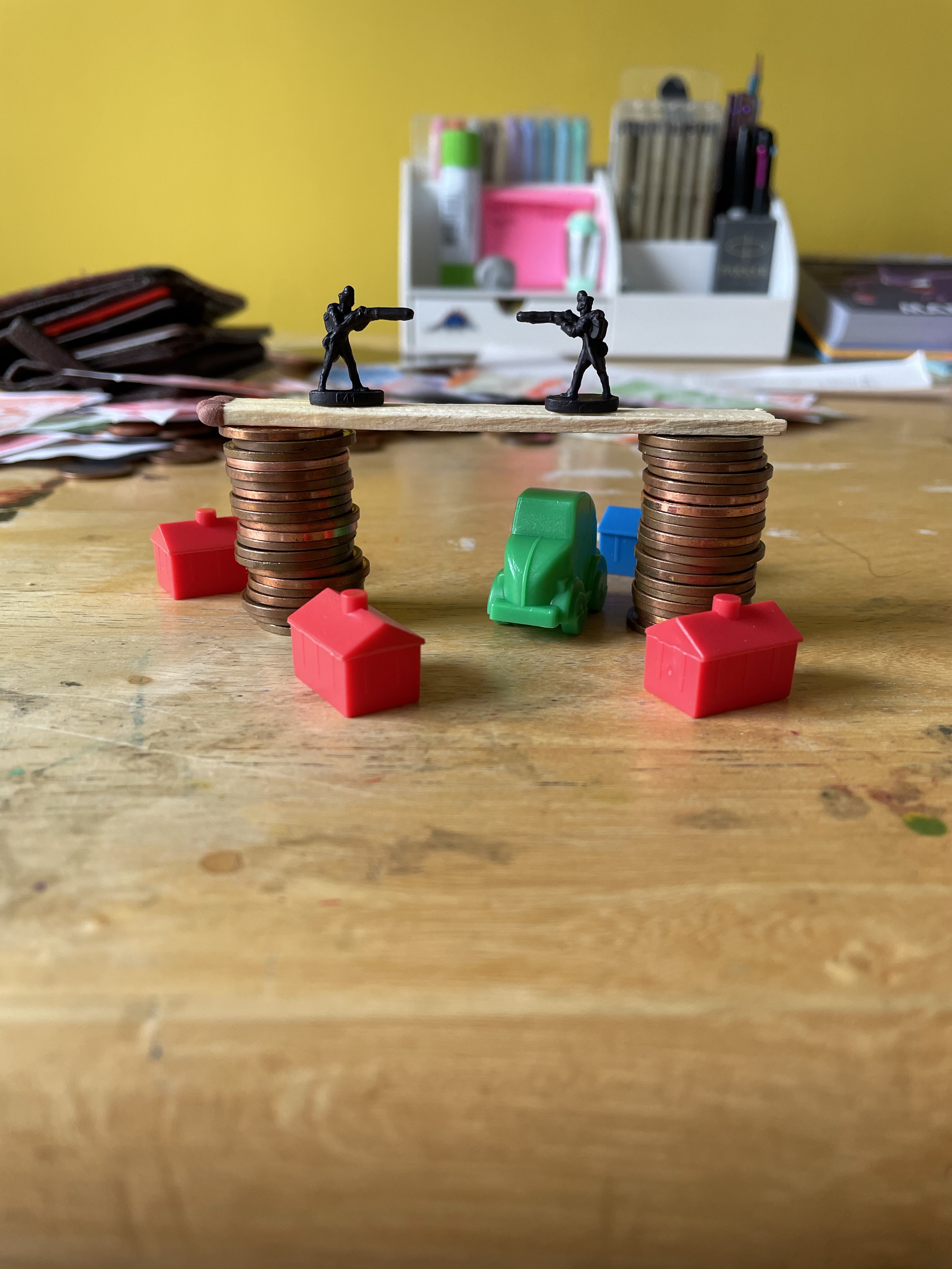 Once I felt I had exhausted my options for variations on the setup, I looked through the content I’d gathered. My favourite setup was one featuring two army men on a matchstick bridge that was held up by two stacks of coins, with monopoly pieces below invoking a village scene. I liked how this communicated ‘financial disaster’ and how the elements of the still life were used to do this. I decided that this setup would be my focus, and began sketching a simple observational line drawing.