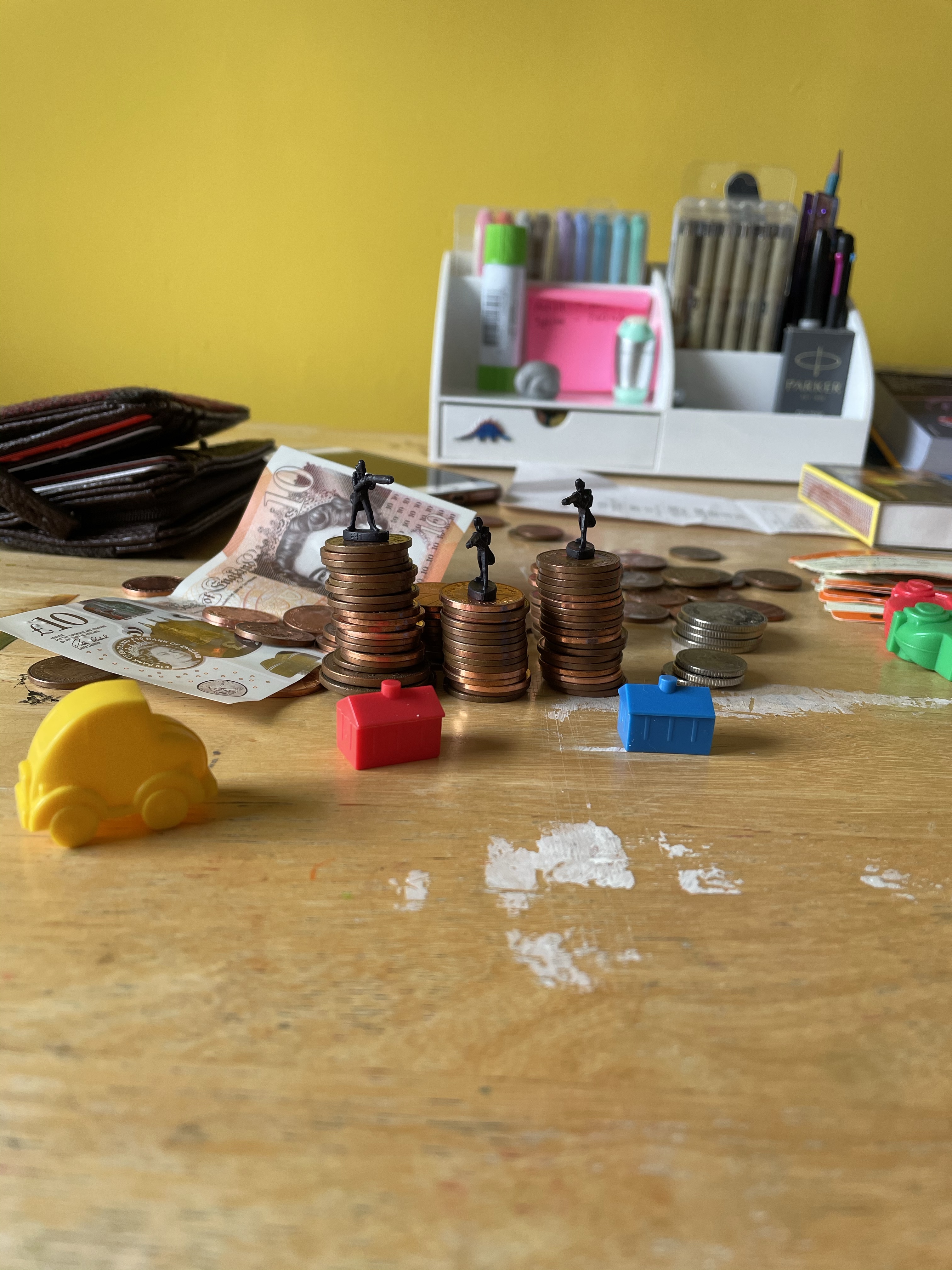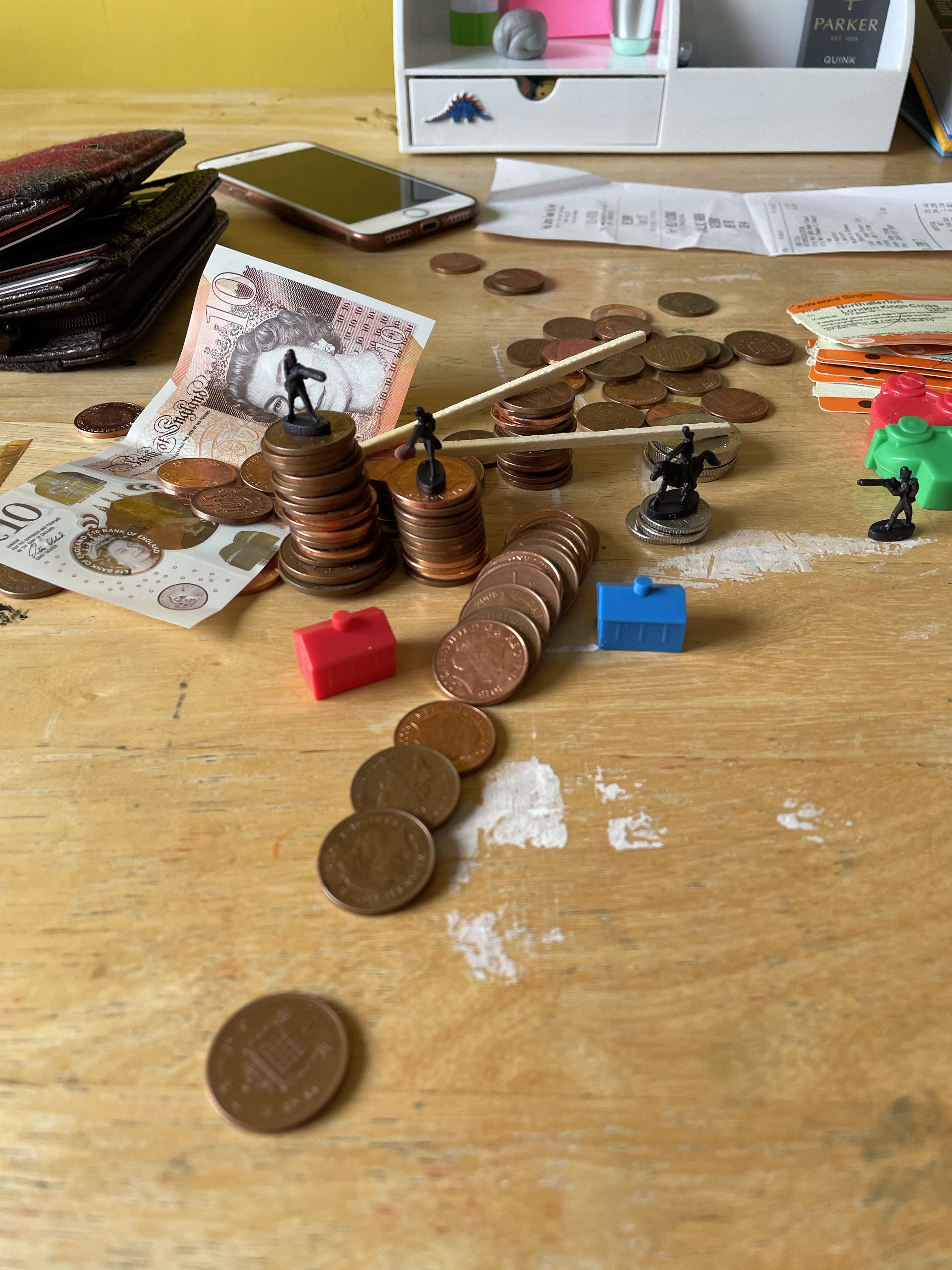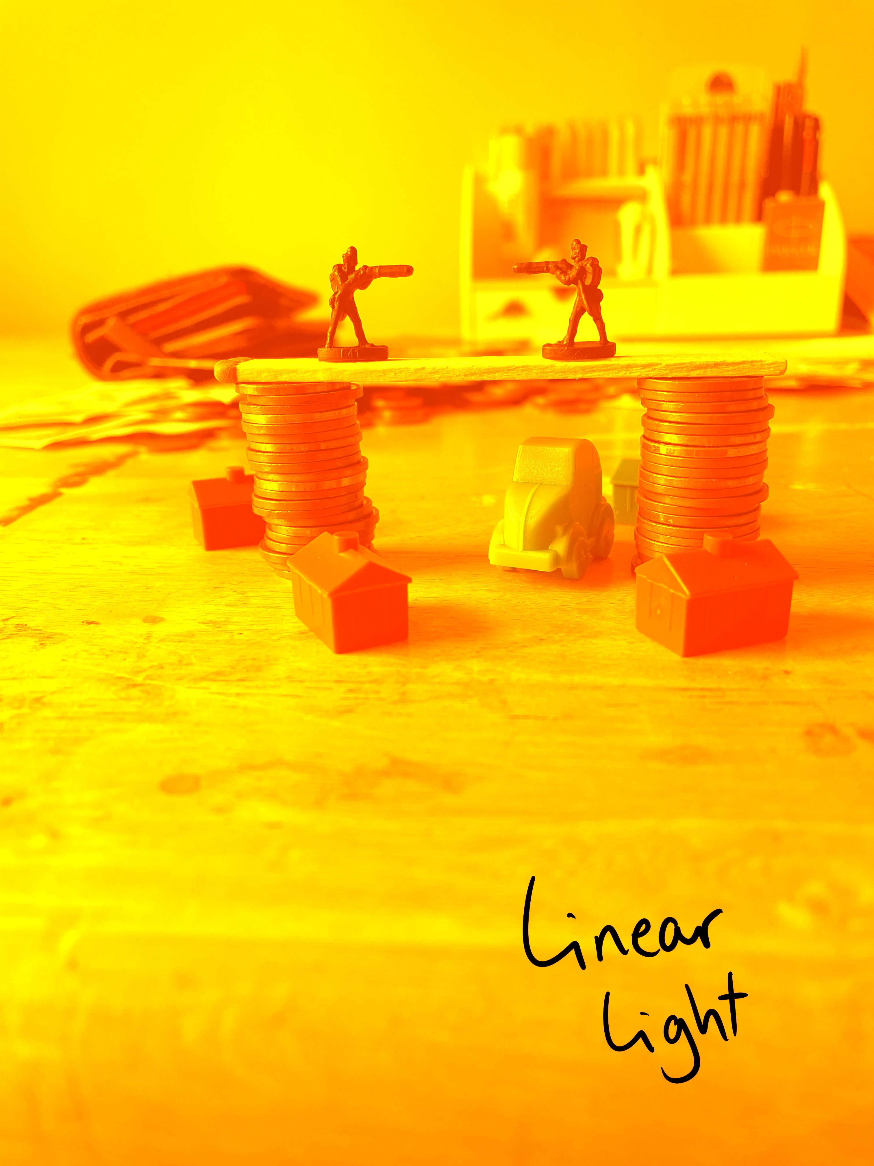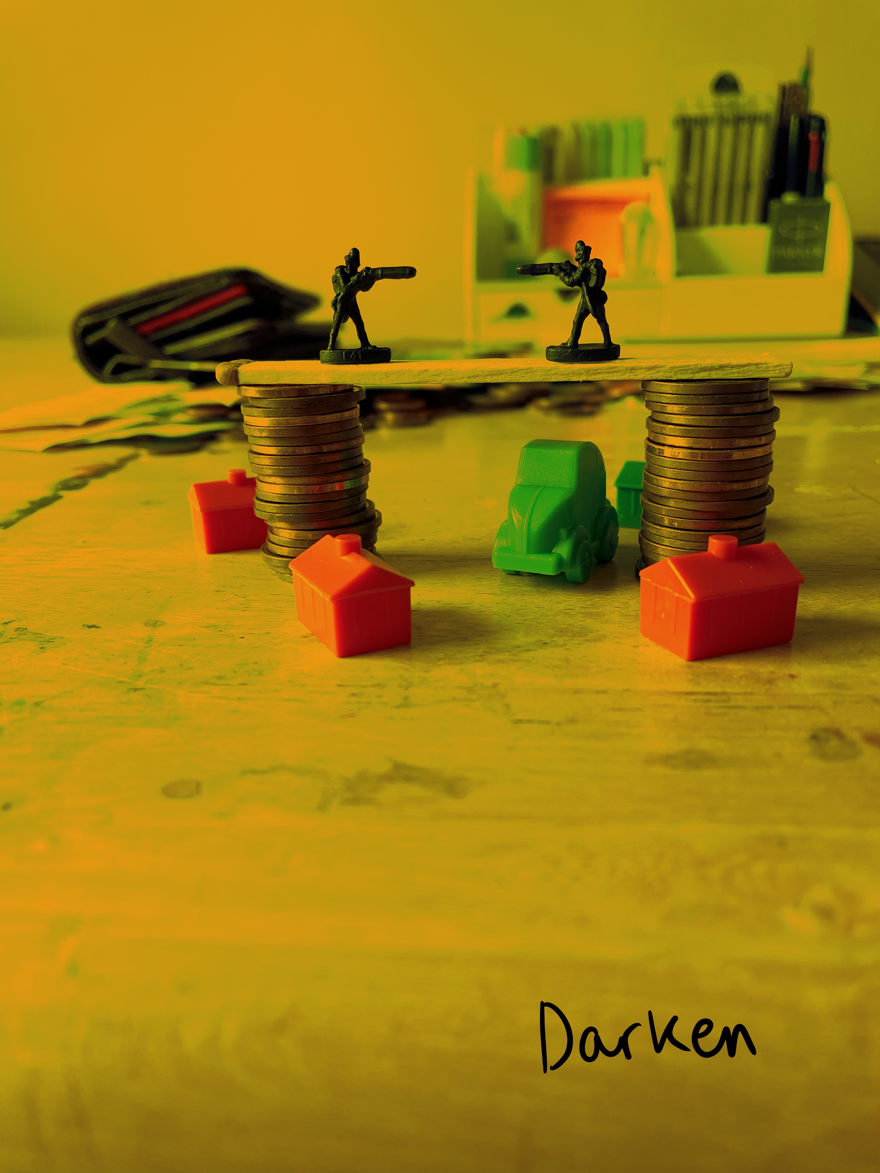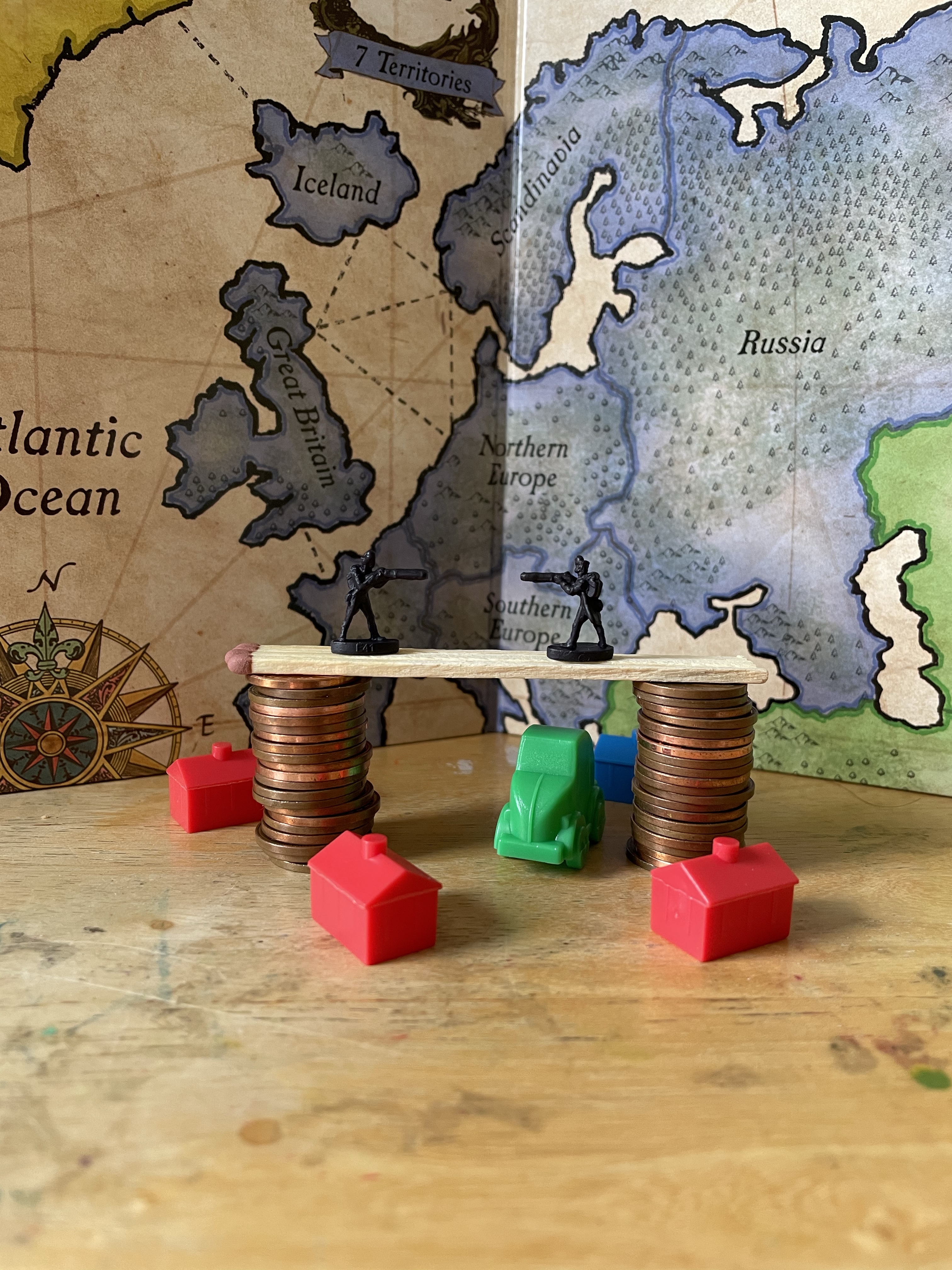 Once I felt I had exhausted my options for variations on the setup, I looked through the content I’d gathered. My favourite setup was one featuring two army men on a matchstick bridge that was held up by two stacks of coins, with monopoly pieces below invoking a village scene. I liked how this communicated ‘financial disaster’ and how the elements of the still life were used to do this. I decided that this setup would be my focus, and began sketching a simple observational line drawing.