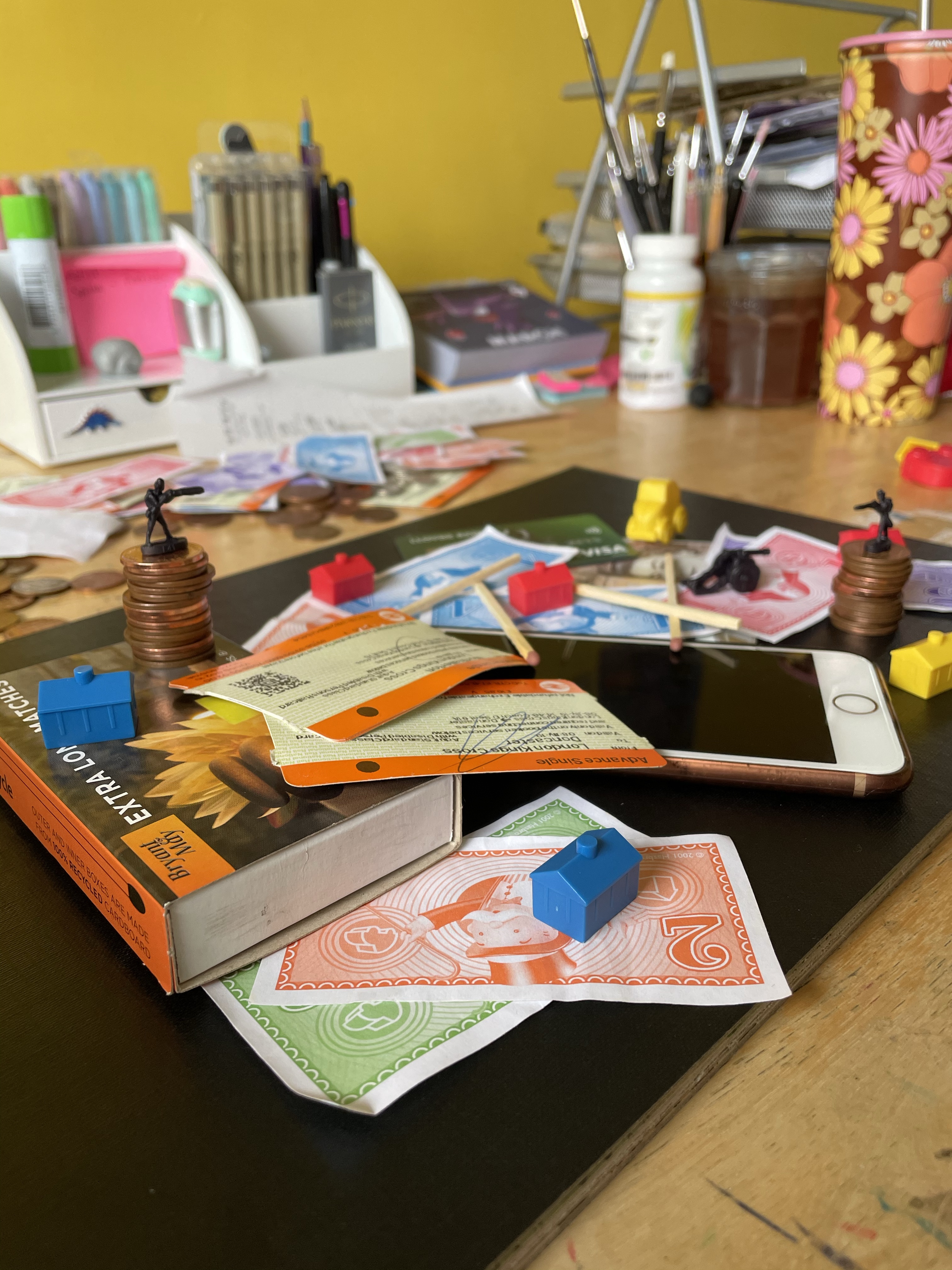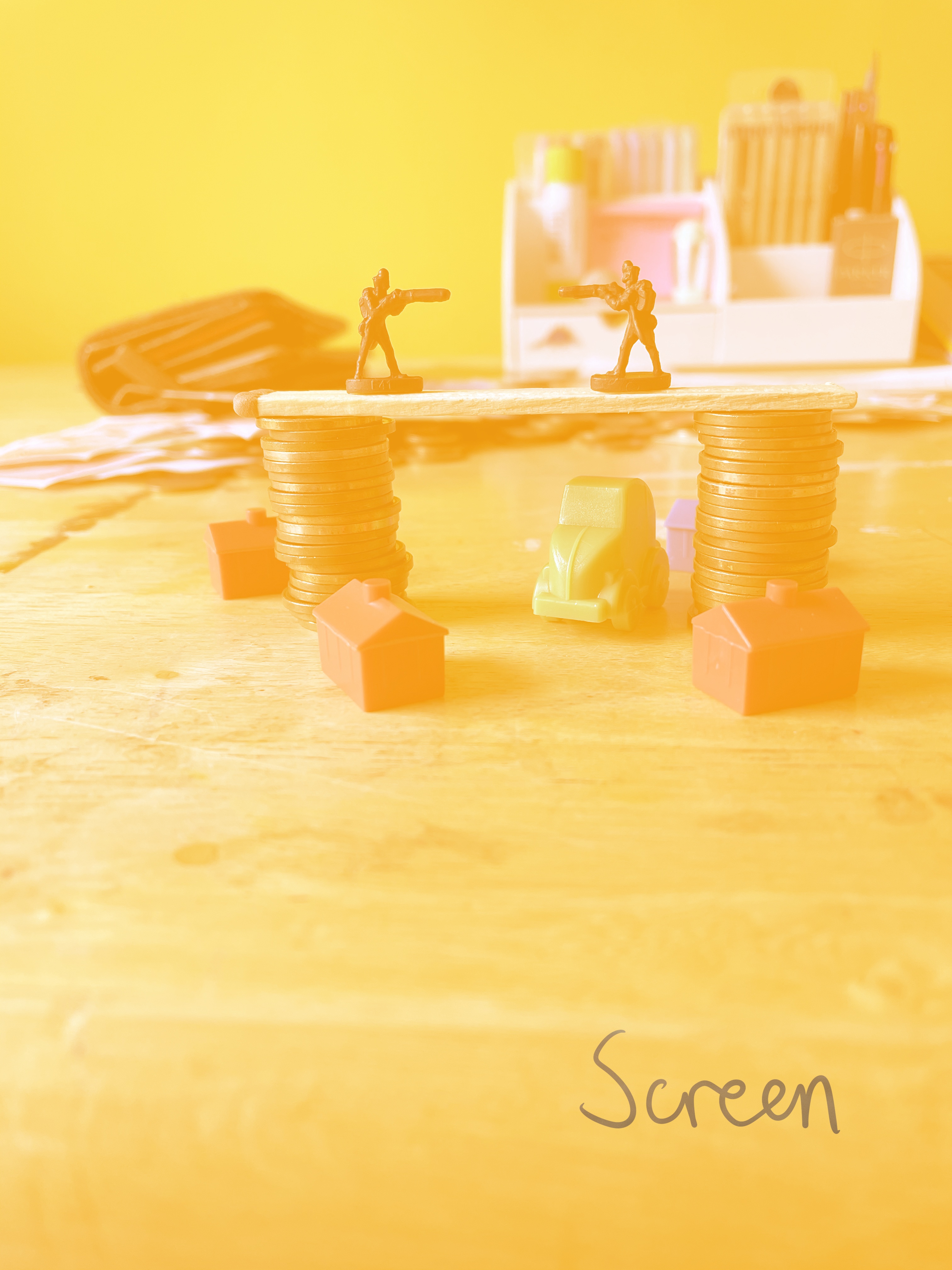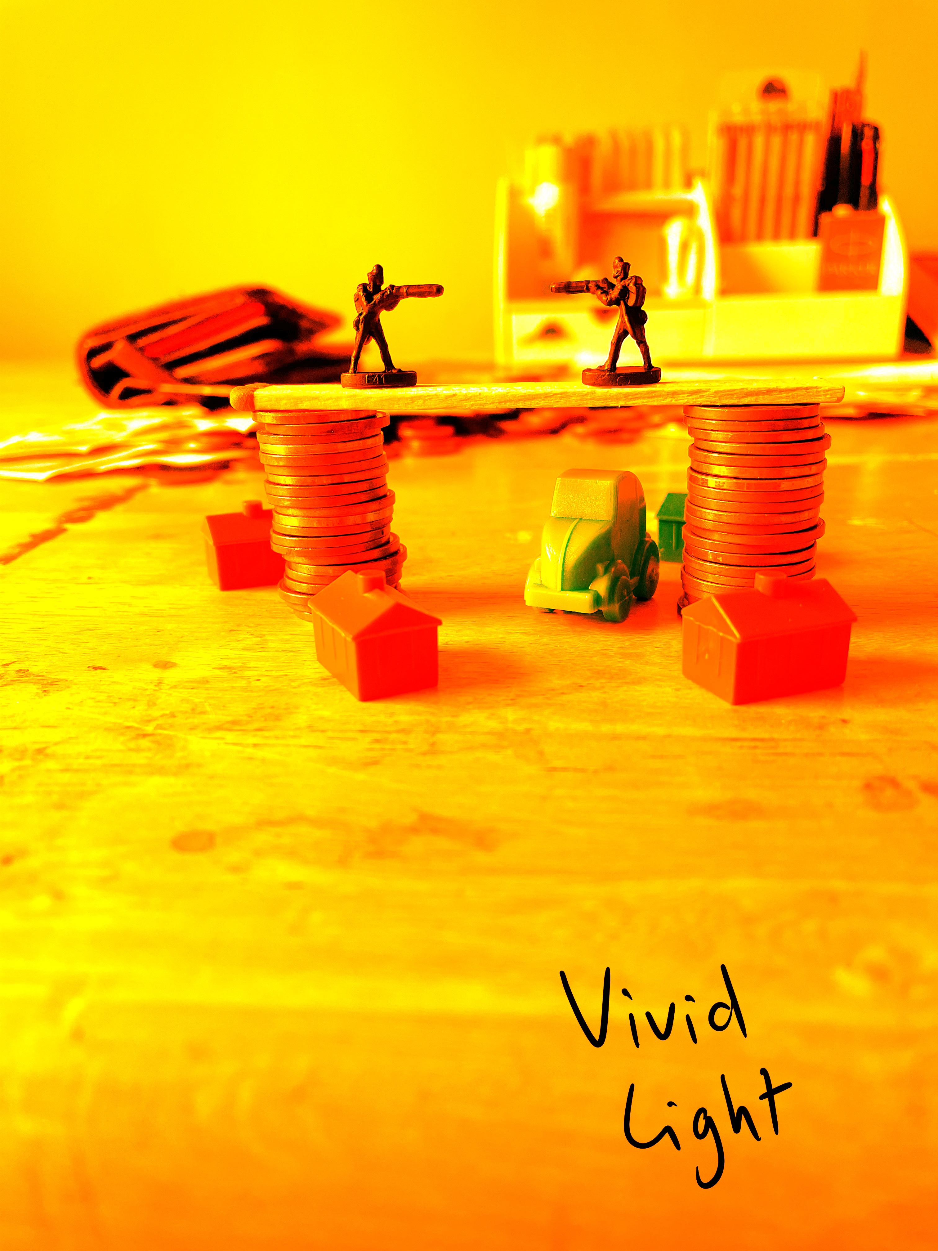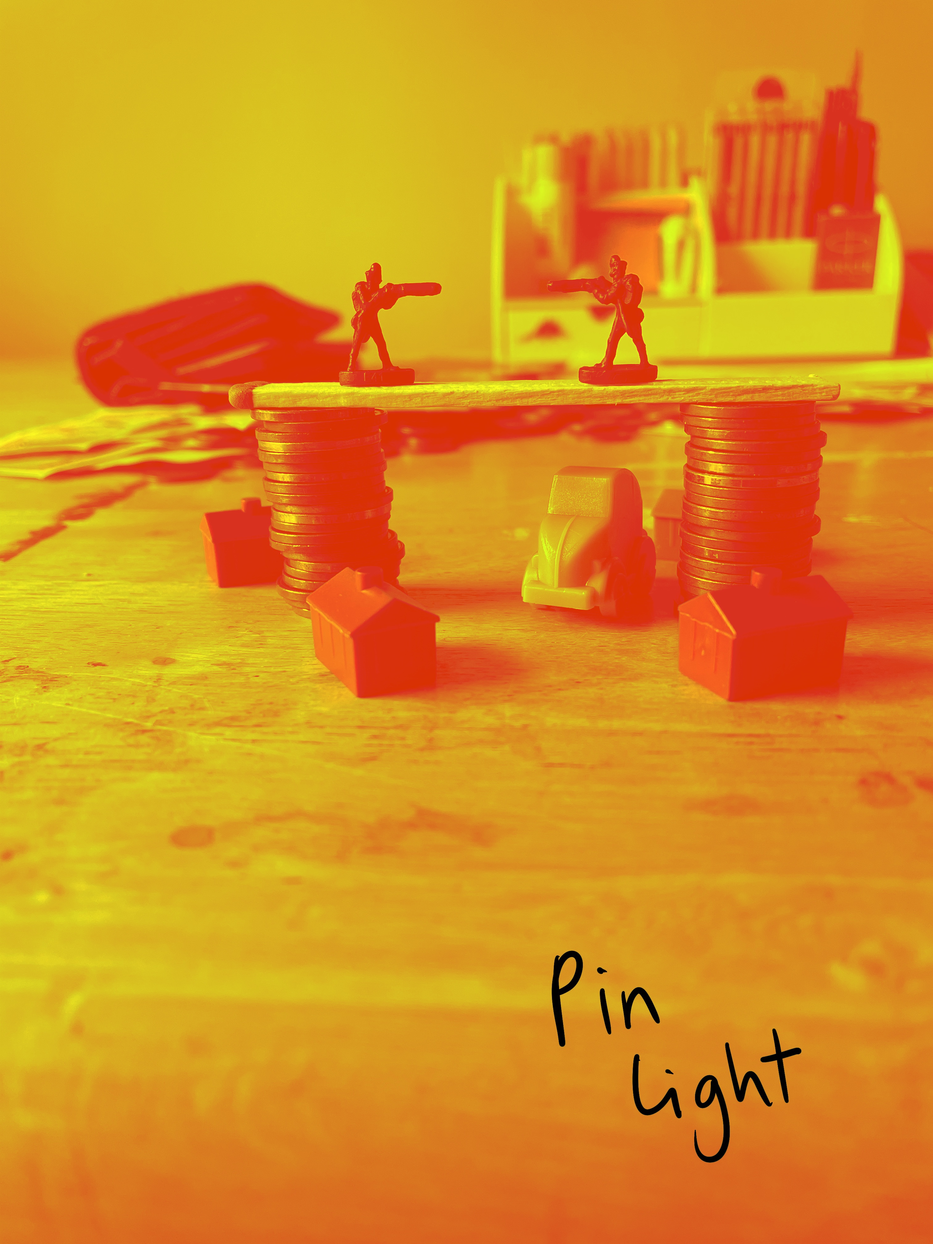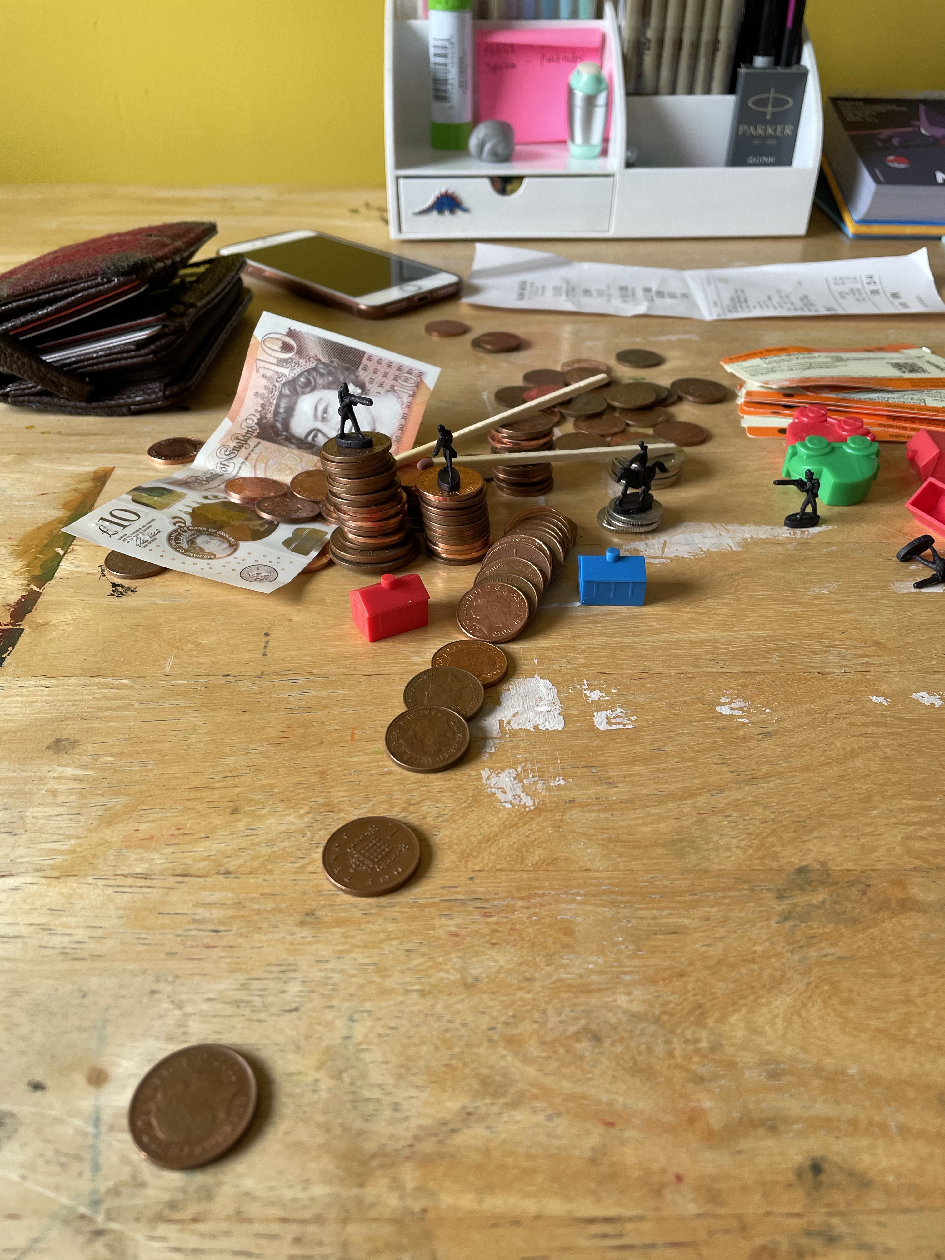 Once I felt I had exhausted my options for variations on the setup, I looked through the content I’d gathered. My favourite setup was one featuring two army men on a matchstick bridge that was held up by two stacks of coins, with monopoly pieces below invoking a village scene. I liked how this communicated ‘financial disaster’ and how the elements of the still life were used to do this. I decided that this setup would be my focus, and began sketching a simple observational line drawing.