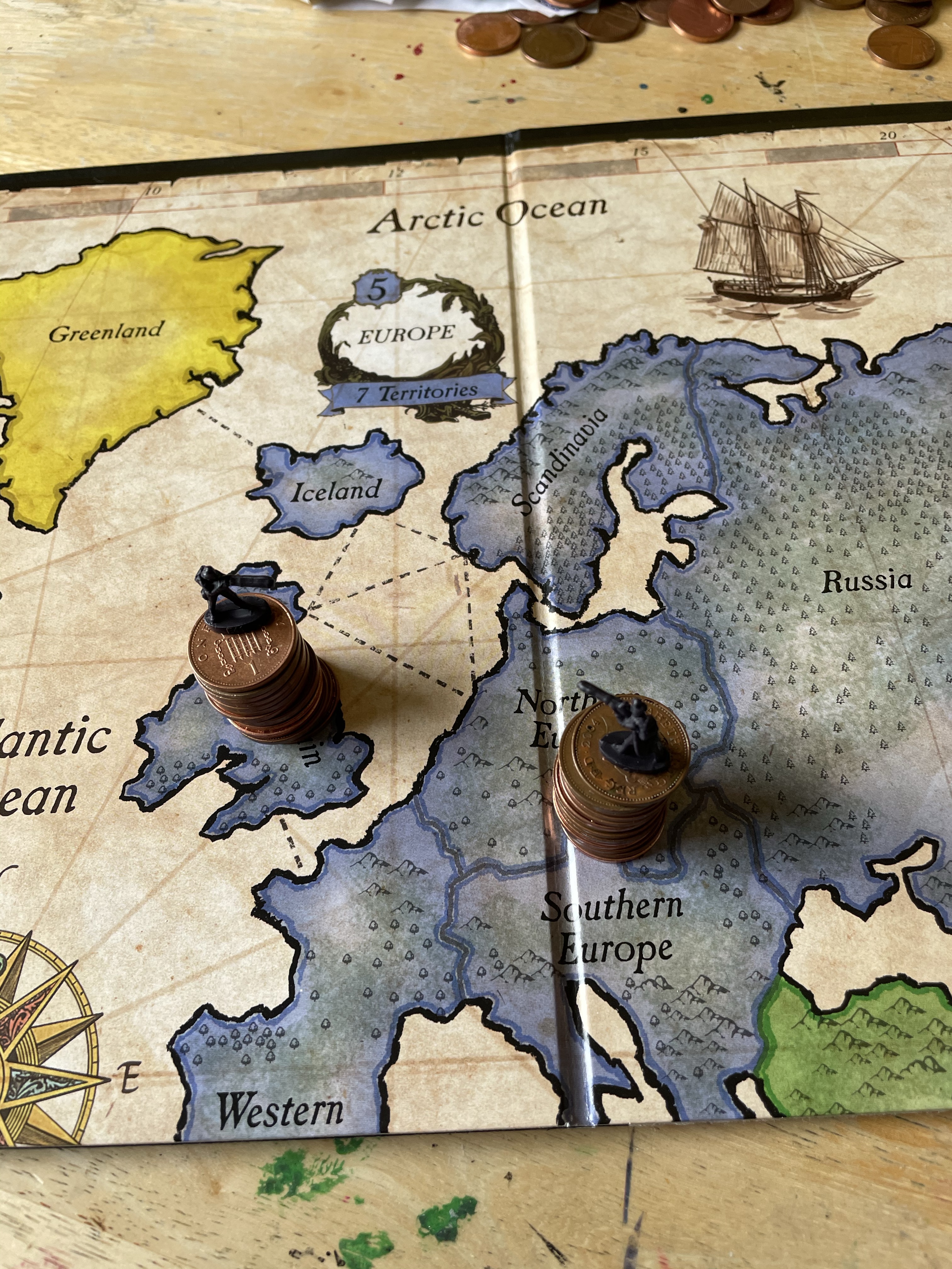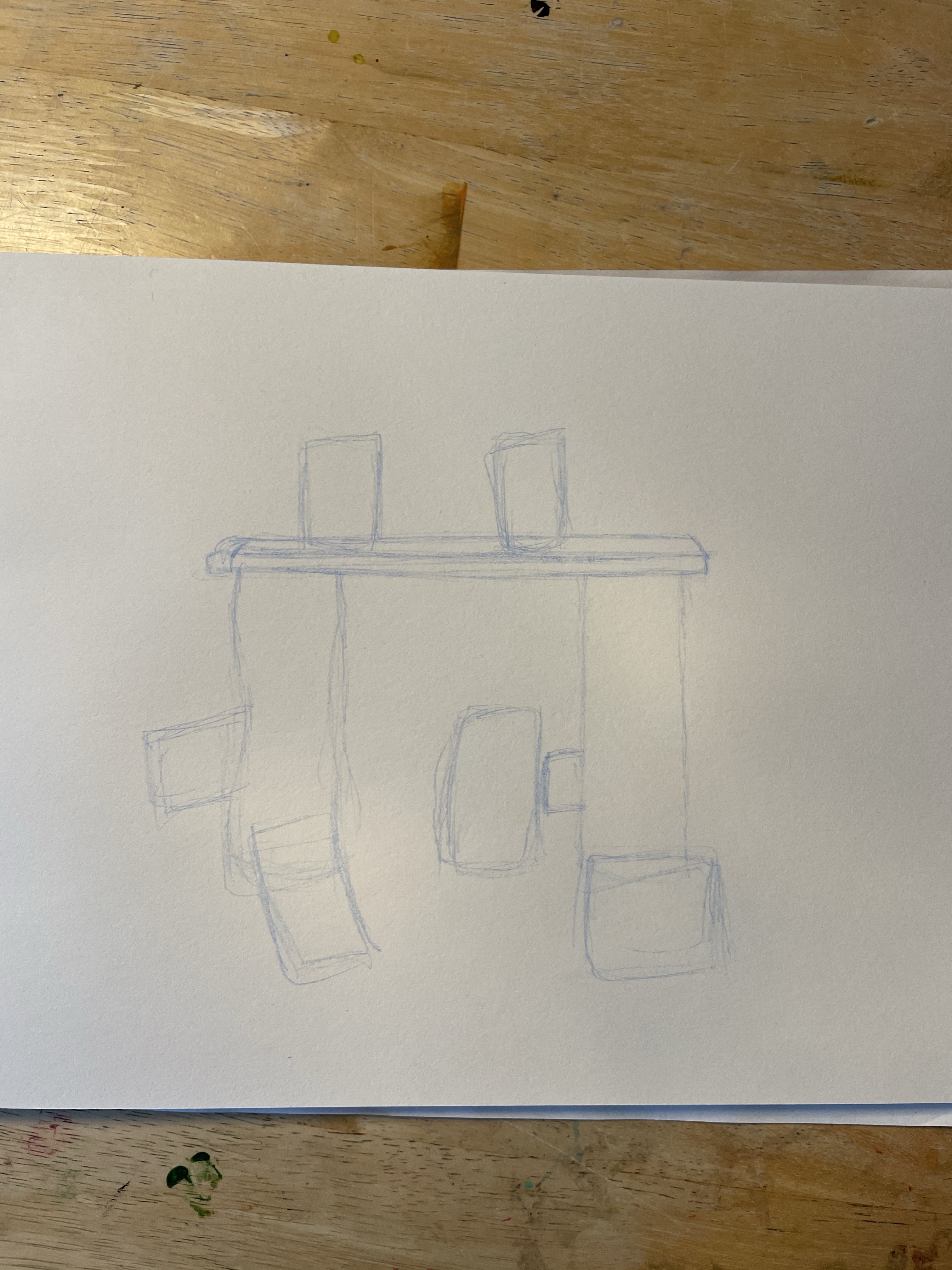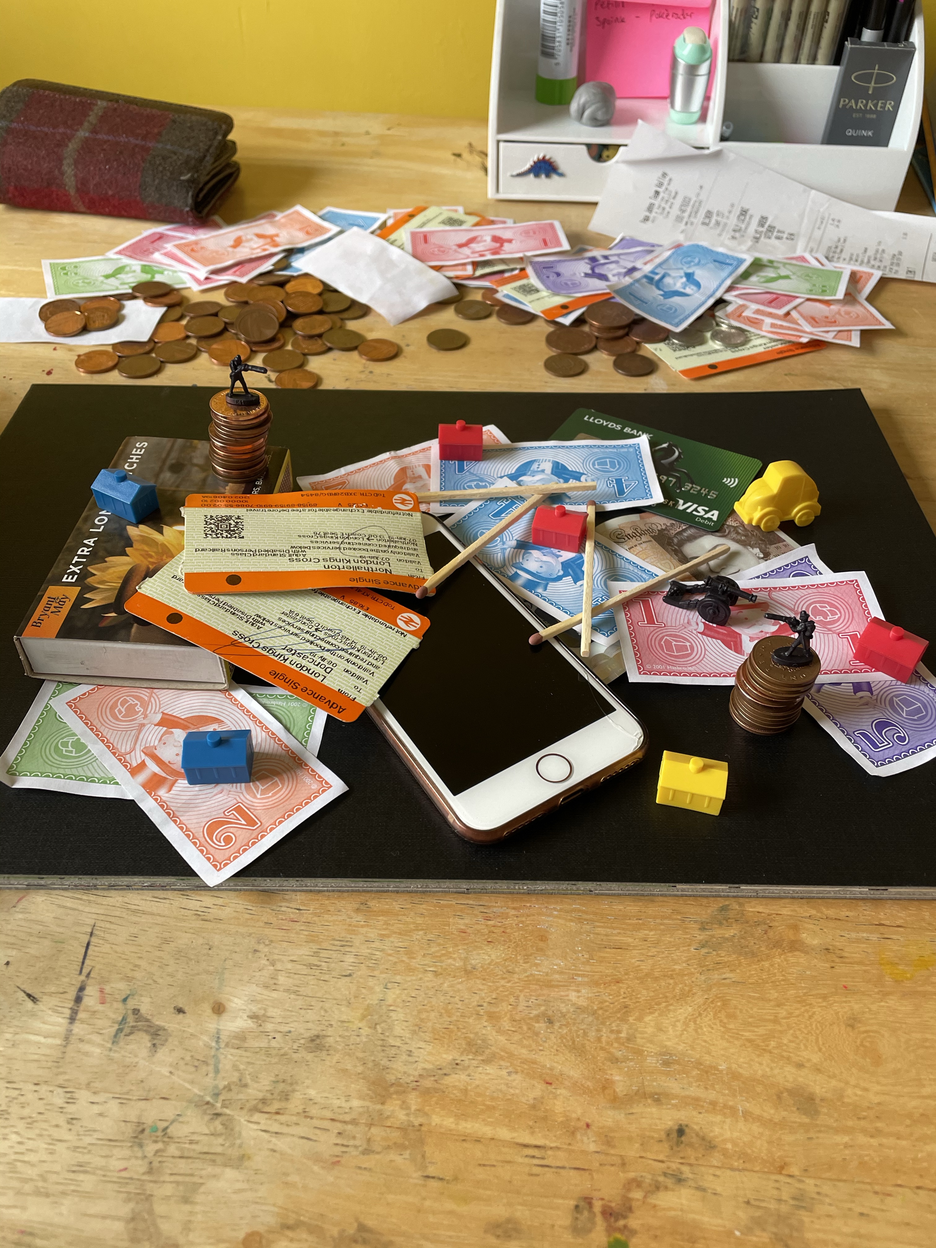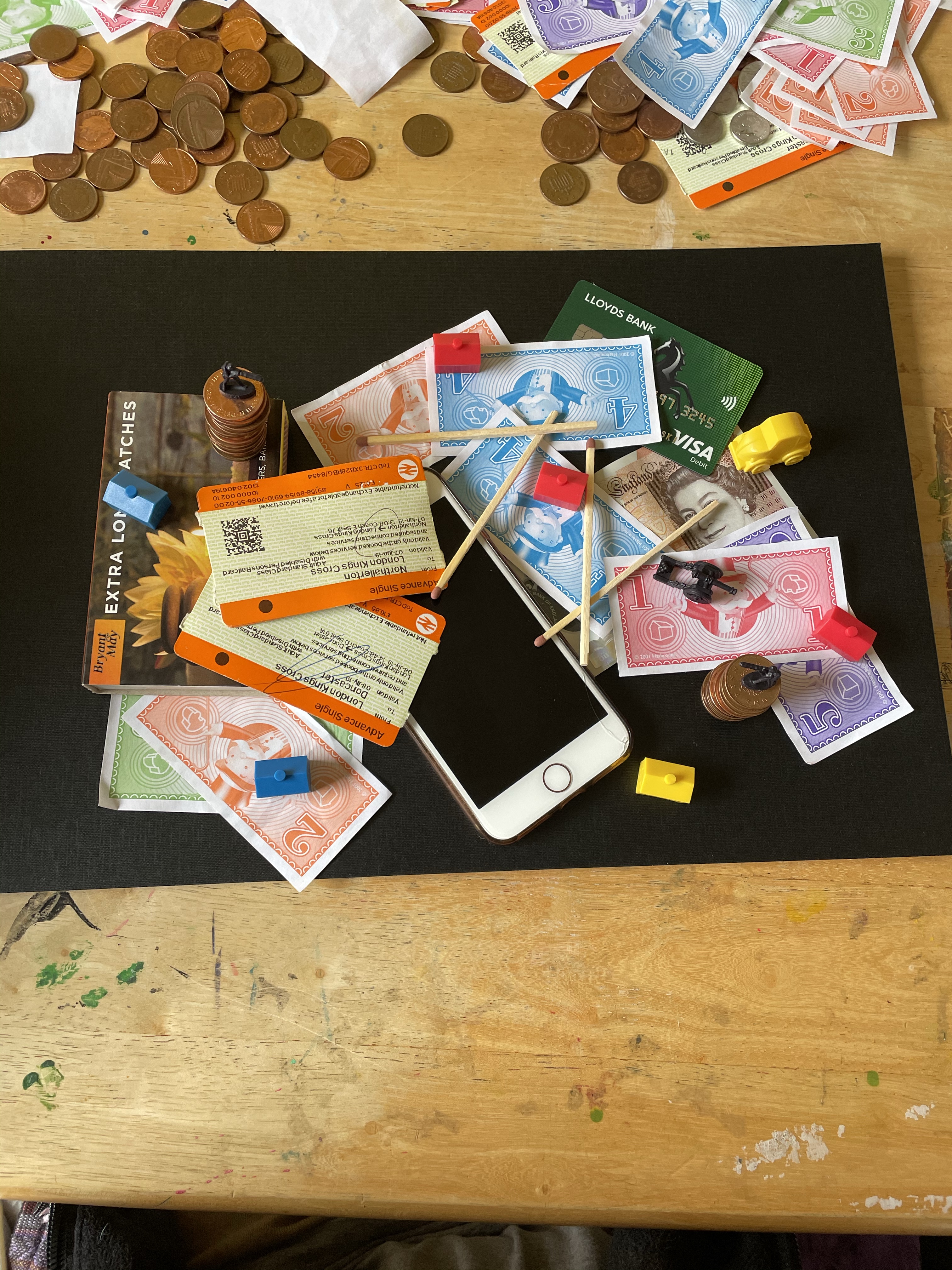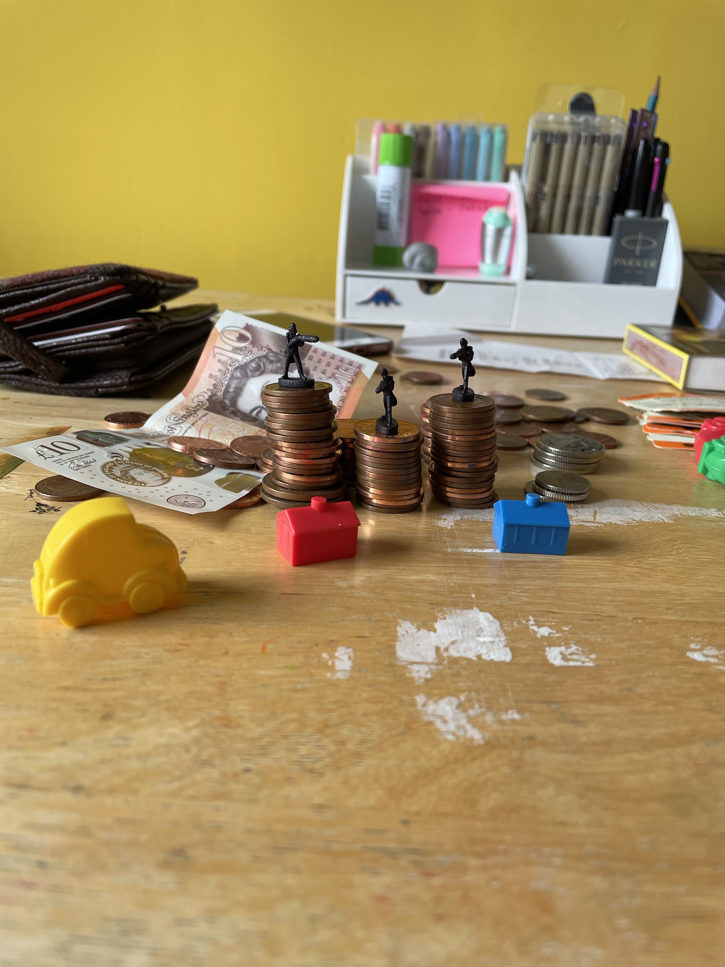 Once I felt I had exhausted my options for variations on the setup, I looked through the content I’d gathered. My favourite setup was one featuring two army men on a matchstick bridge that was held up by two stacks of coins, with monopoly pieces below invoking a village scene. I liked how this communicated ‘financial disaster’ and how the elements of the still life were used to do this. I decided that this setup would be my focus, and began sketching a simple observational line drawing.