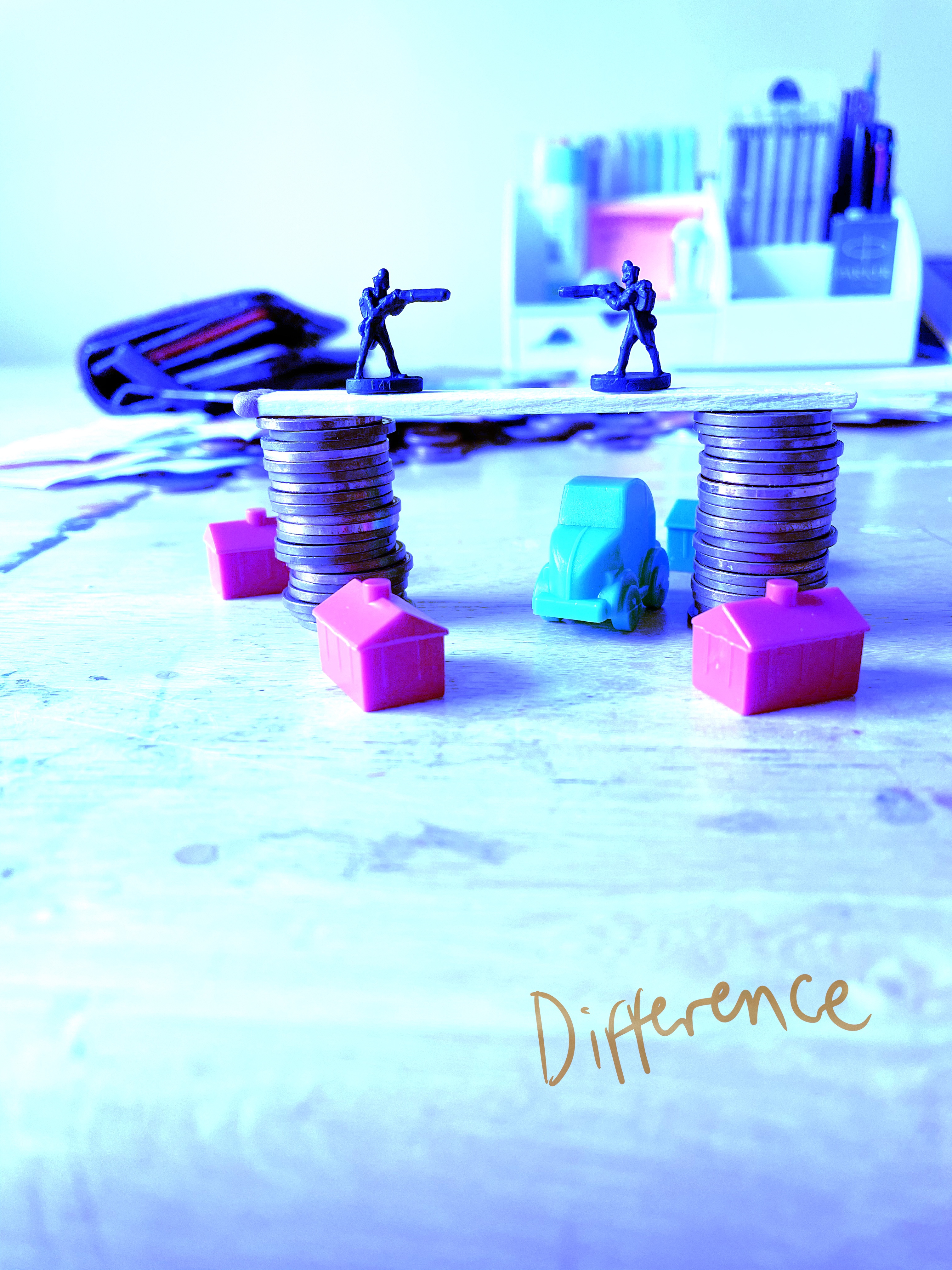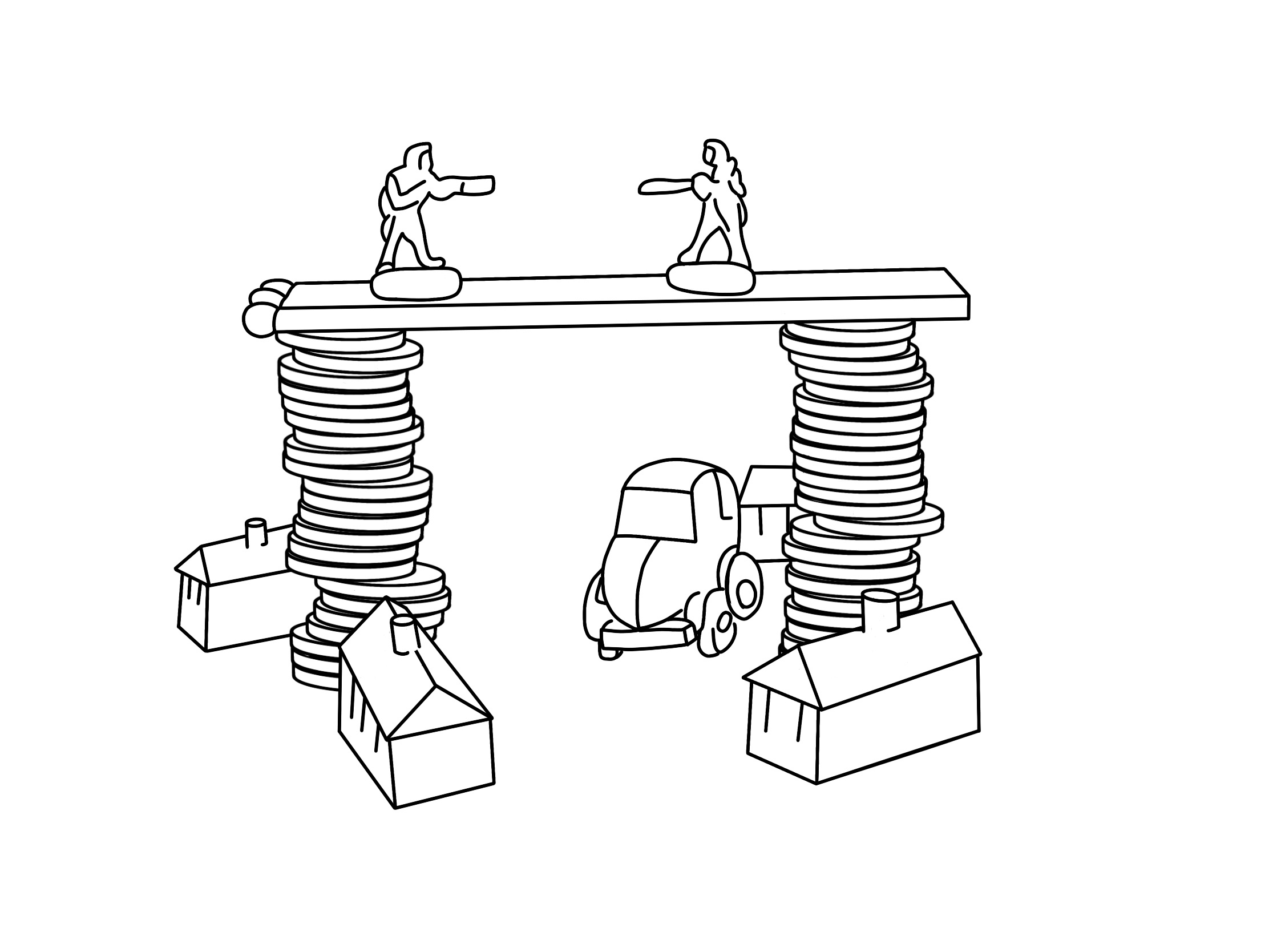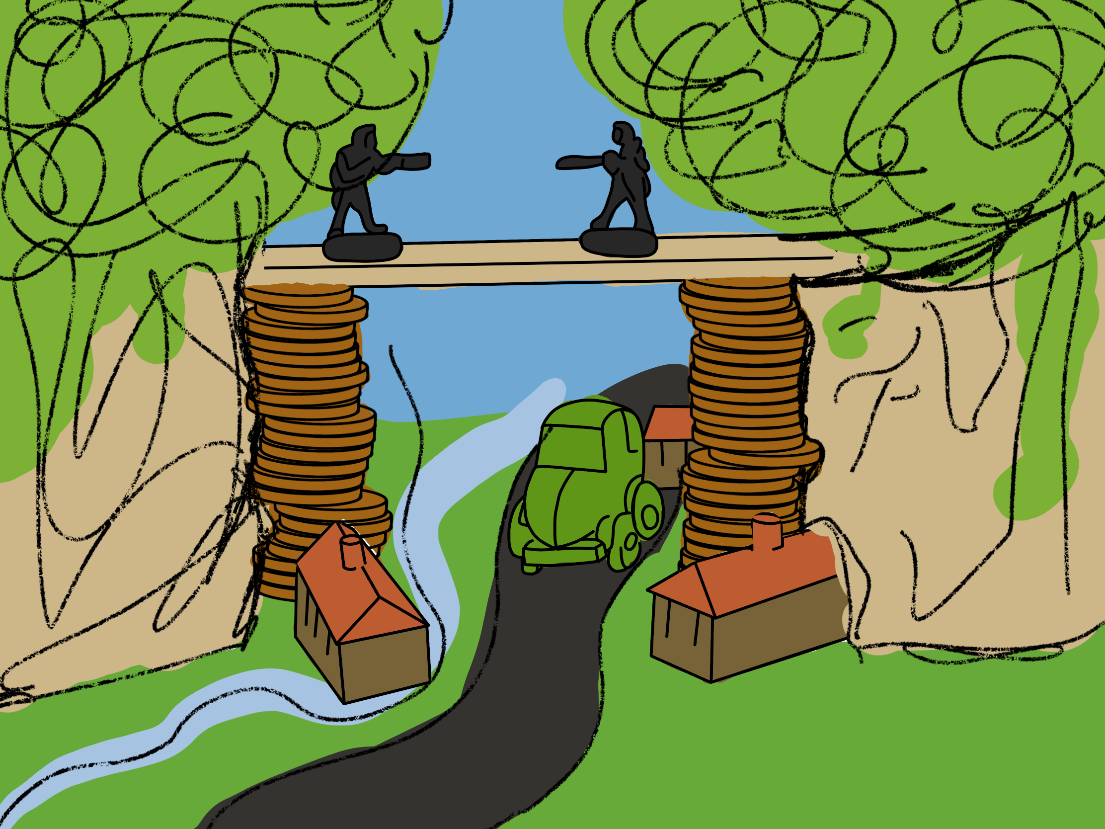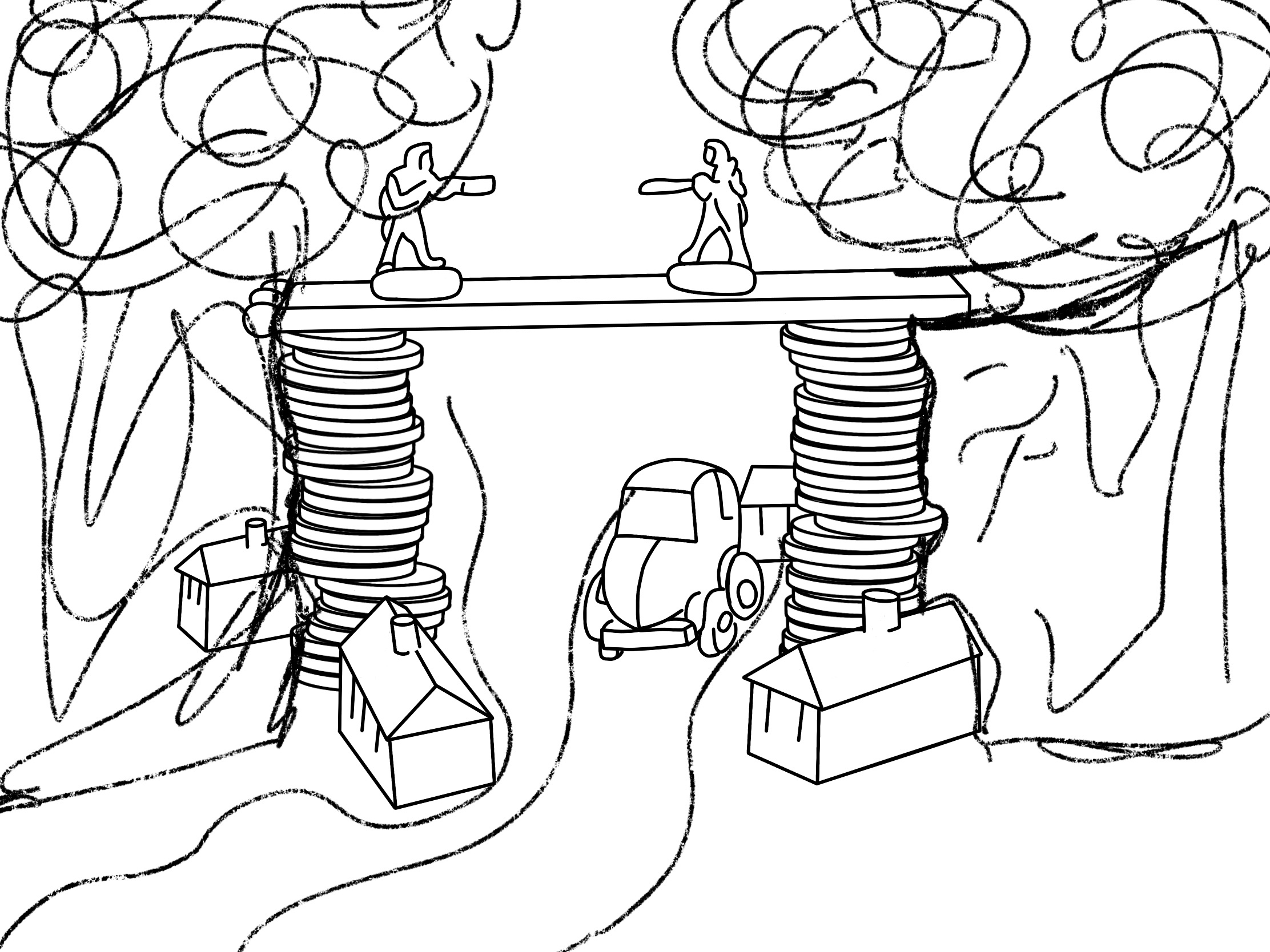 My next step was to figure out how to turn this into a full and complete magazine illustration. I decided to scan in my tonal drawing to use as a basis for my final design. Then, in Procreate, I traced over it to produce a line visual. The assignment guidelines advise that at this stage I may wish to introduce a character or location, to suggest a narrative. I thought about this a fair bit and considered what I could add, remove, or distort in my still life in order to convey the message of ‘financial disaster’. I had 3 main ideas. The first was to add in features such as a toy box, a child, or a playful background, to invoke the idea of ‘child’s play’. My second idea was to simply add a background of money falling, possibly using a repeating pattern, with the focus on my still life in the foreground. My third idea was to turn the scene into a full landscape, with the bridge connecting two locations and a road underneath, perhaps with a river flowing nearby.