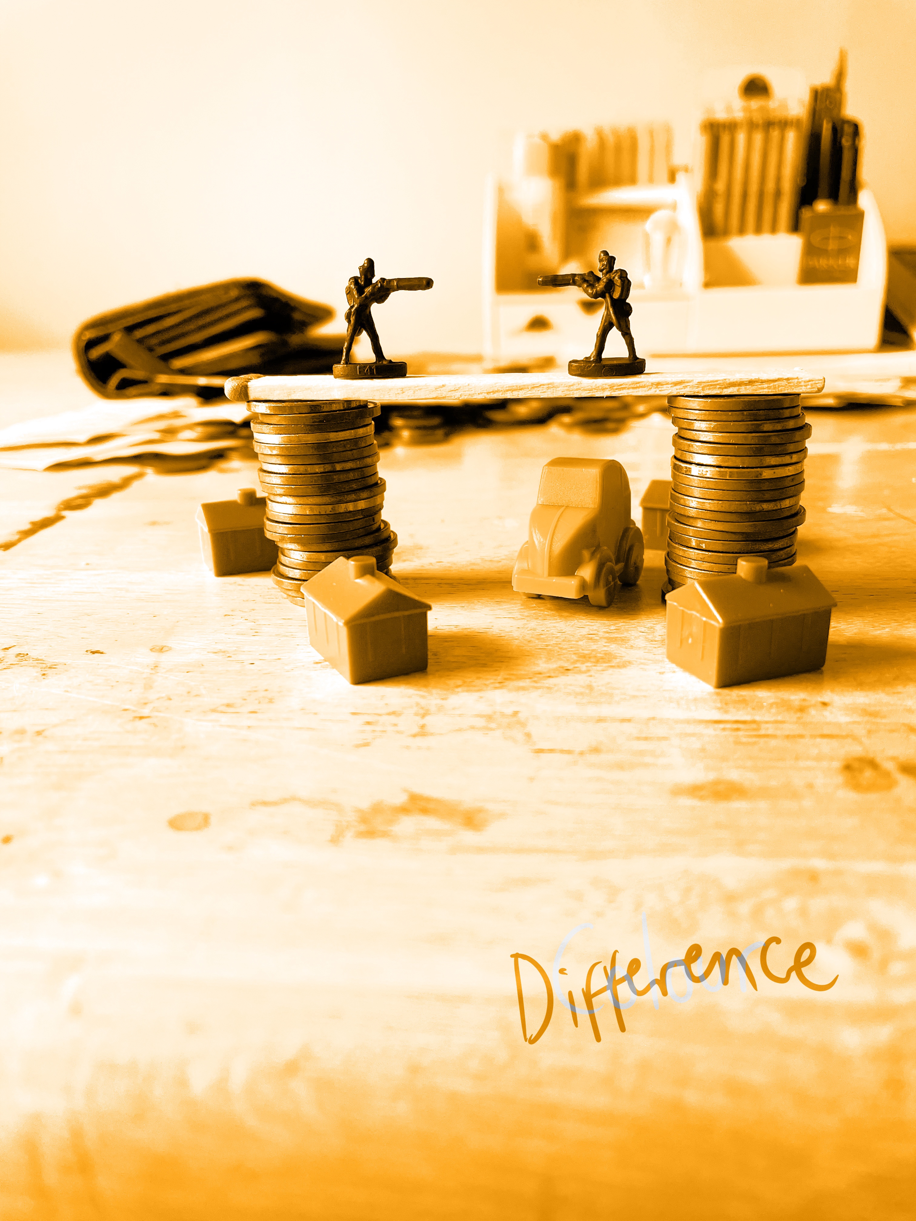 I duplicated my line drawing a few times so I could sketch out these ideas and see how they looked when thumbnailed. I liked the toy box idea a lot, and I thought the landscape concept was brilliant too. I even added colour, so I could have a fuller idea of how it would end up looking. I then used one of my still life setups as a tester background to see how it would look with money as the background. I stepped back and looked at all three ideas side by side, and I realised that I was straying quite far from my original theme. The assignment brief says ‘each decision you make…should contribute to the overall description of the theme you have chosen’. I didn’t think that my child’s play idea, or my landscape, really communicated the word ‘disaster’. It wasn’t immediately clear from either of these concepts that that was my focal word, except maybe through the soldiers holding guns. I also didn’t really feel like the ‘financial’ aspect of my choices was coming through either.
