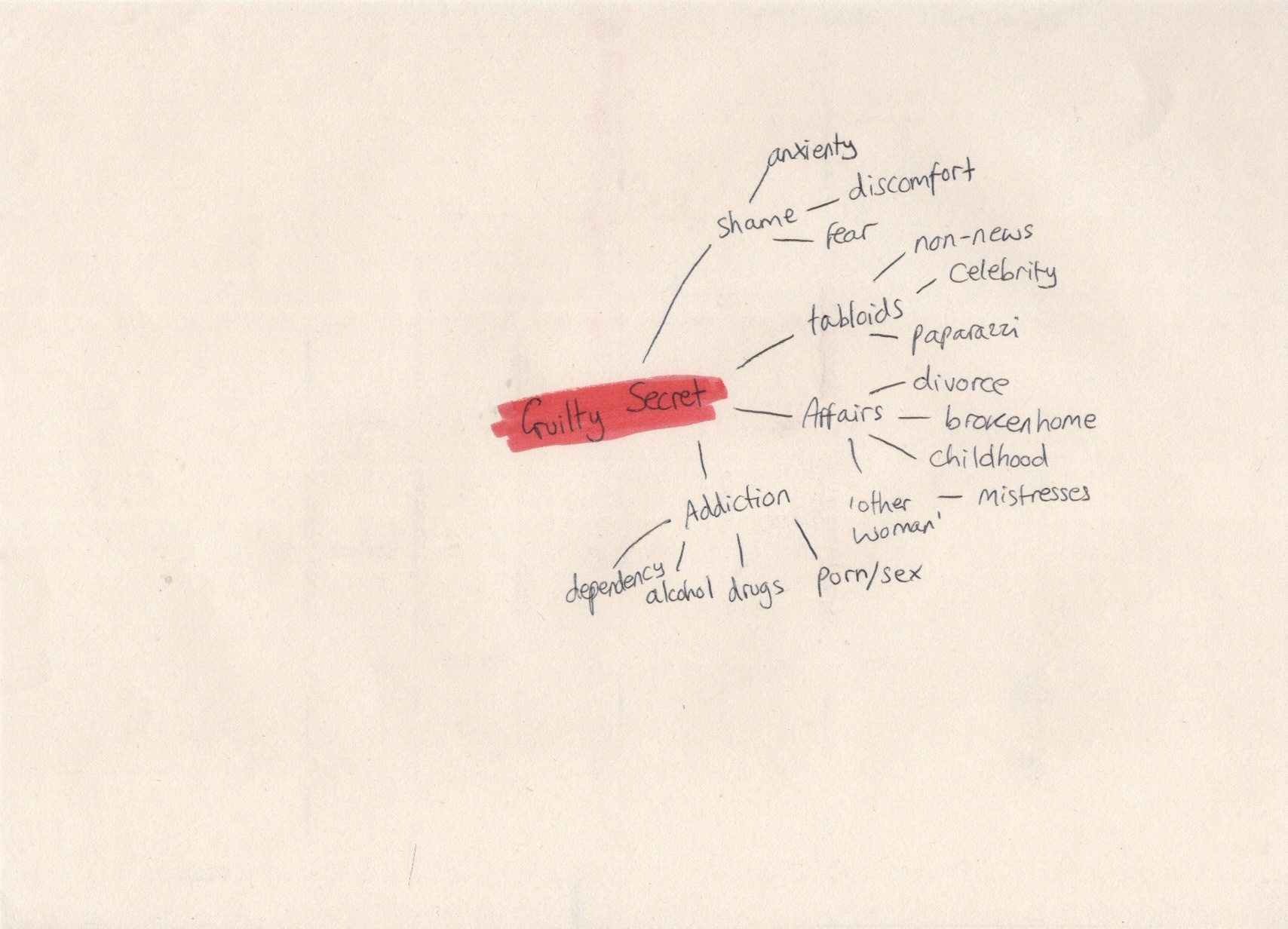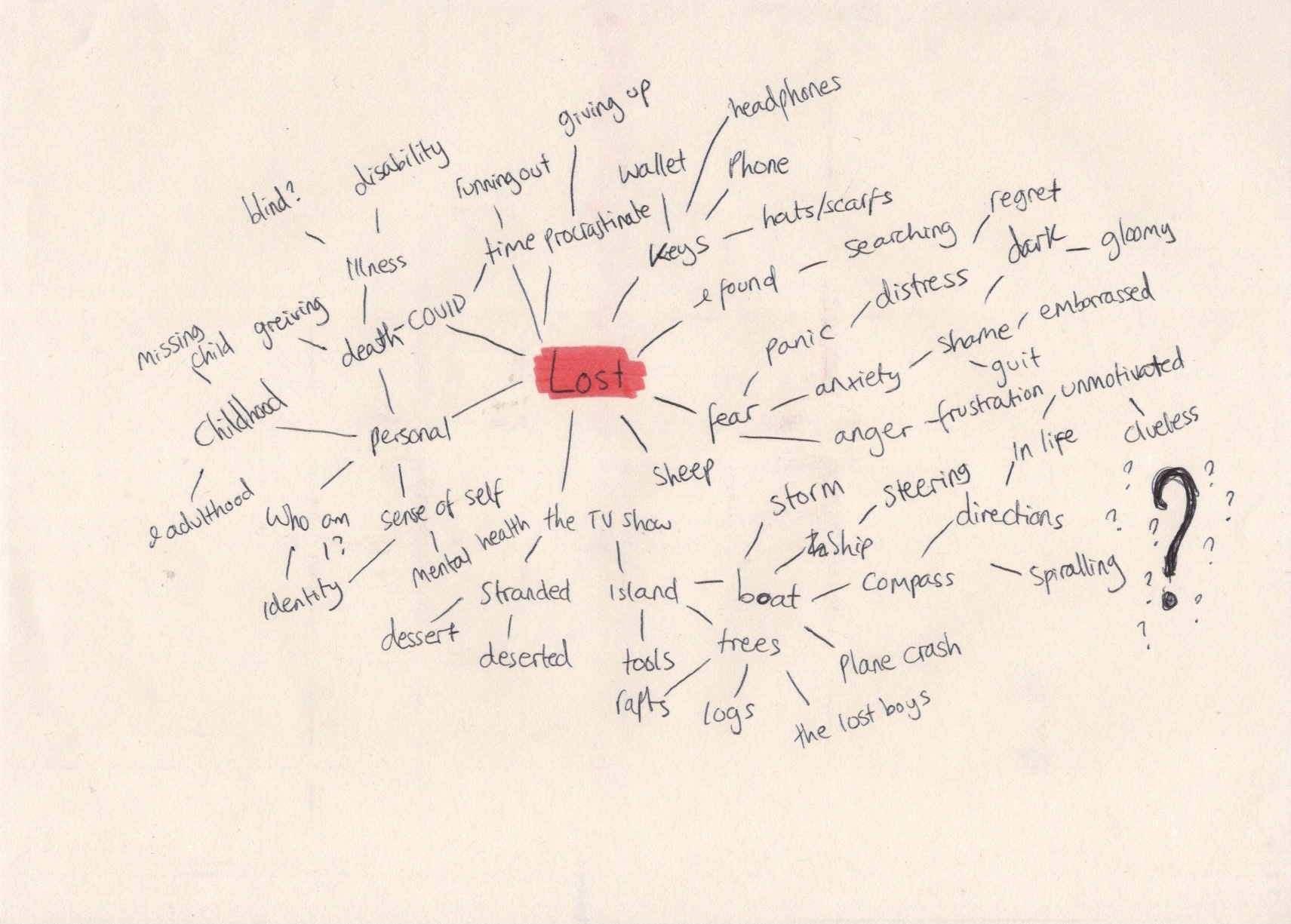 Next, I decided to brainstorm around each of the four topics to see which one I was most excited about. I chose to do mindmaps around the words, starting with ‘lost’, before moving onto ‘discovery’, then ‘disaster’, and finally ‘guilty secret’. I found it easy to think of ideas, words, colours, and concepts for all of these, but when I got to ‘guilty secret’ I started to struggle. I asked a friend if she had any thoughts on the topics, too, to see if I was missing anything. I was really excited about the ideas I had for the word ‘disaster’, which I think contributed to my struggles brainstorming around ‘guilty secret’.