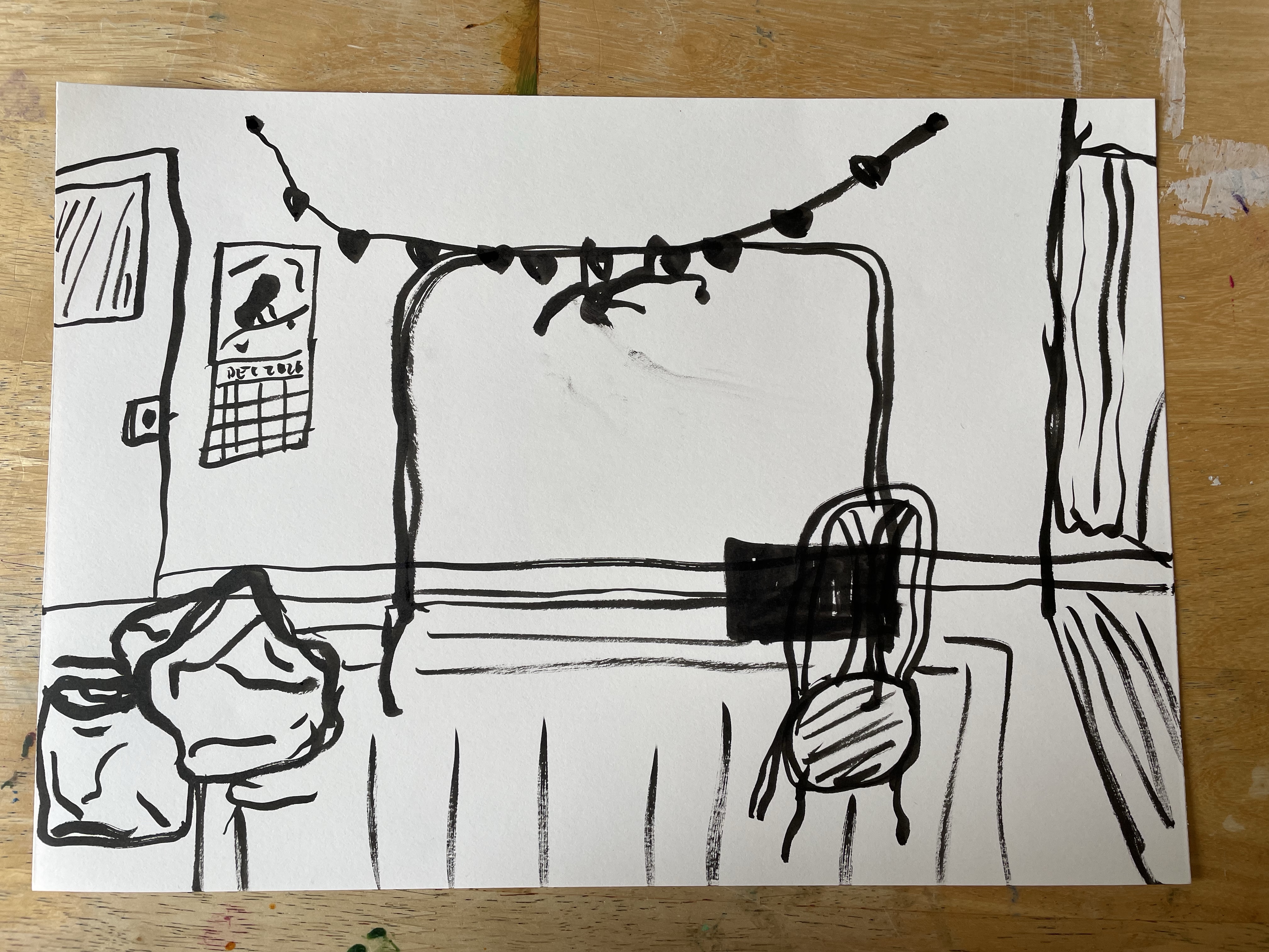 I carried on, next to the lipstick, which was surprisingly fun to use! I drew what was to my left this time. Interestingly I drew this on a much larger scale, which may be down to the material I was using. Once again, I could see all of the mistakes coming through, which was beginning to frustrate me. In retrospect, however, I can see so much that inspires me that I’d like to try out again. The last thing I used was the cork and India ink combo. This drawing is probably the ‘worst’ one, objectively. It’s definitely the one I like the least and the one I wish I could do again.