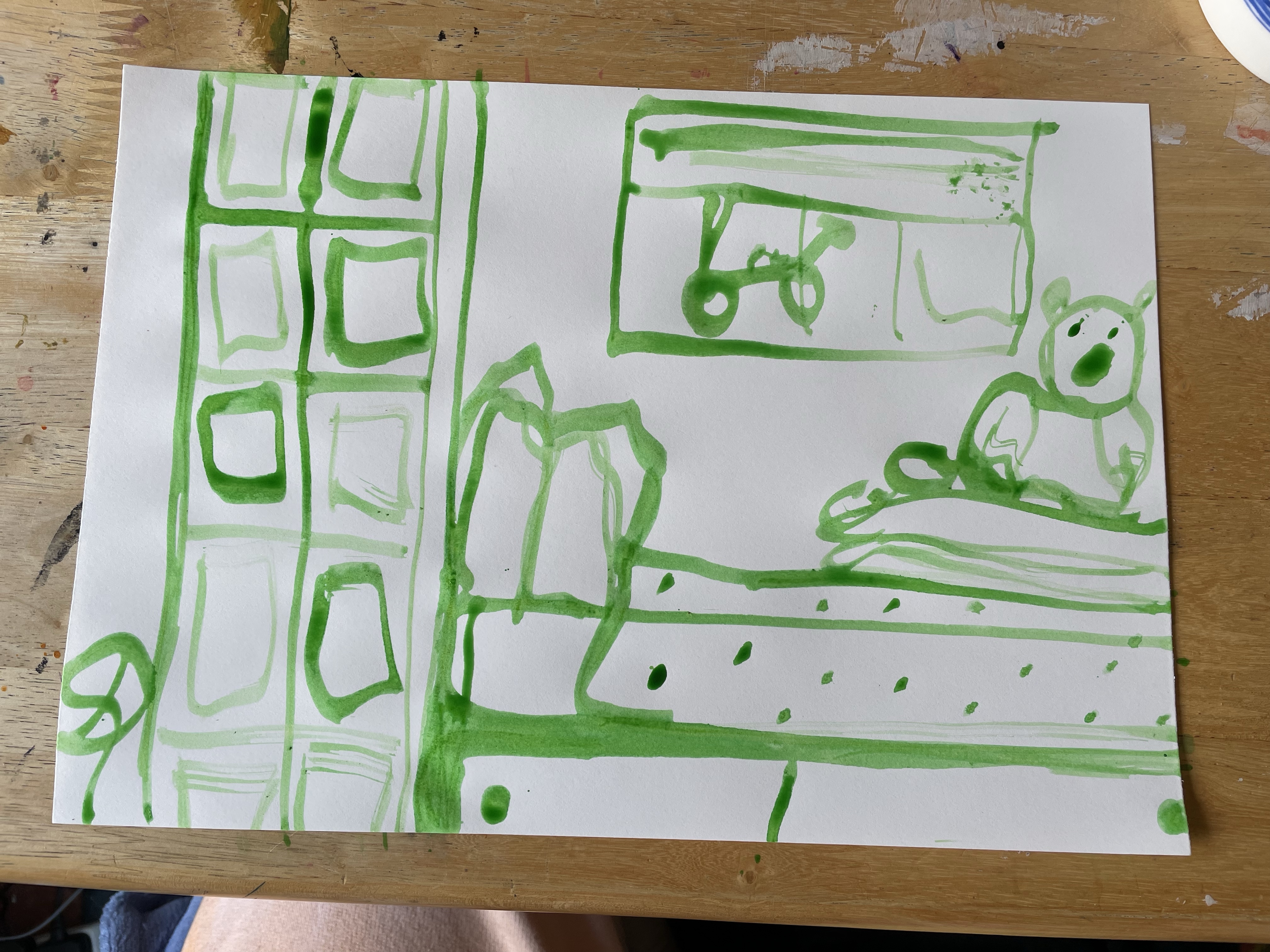 For the first part of the exercise, I was asked to gather four sheets of paper and four different drawing materials. It was noted that these could be conventional or unconventional, but I was encouraged to choose tools out of my comfort zone. I was then asked to draw, very quickly, what was in front of me, then what was behind me, then what was to my left and right. The exercise recommended working loose and fluidly, spending no longer than 5 minutes on each drawing. I had to fill the whole page during this time, capturing the essence of what I could see.