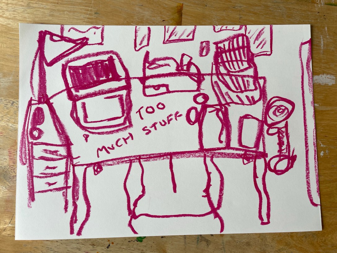 I chose to use four sheets of cartridge paper for this exercise. It’s slightly off-white in colour, smooth in texture, and a nice medium weight. I needed it to take the India ink and the lipstick without buckling, but I didn’t want to use something overly heavy as I was aware of the folding required later on. I then got to work drawing. I started with the art crayon as it felt like a good way to introduce myself to the exercise and to working fluidly. I set a timer for 5 minutes and drew what was in front of me. I was not drawing exactly what I could see, nor was I drawing everything. I chose to draw what I felt was visually interesting and eliminate what didn’t fit. I very quickly had filled the whole page and realised my timer was only half-finished! I had expected 5 minutes to feel very quick.