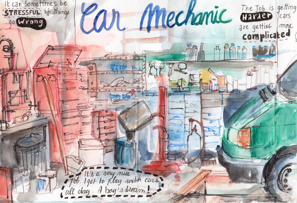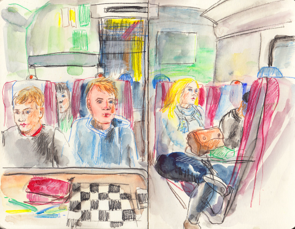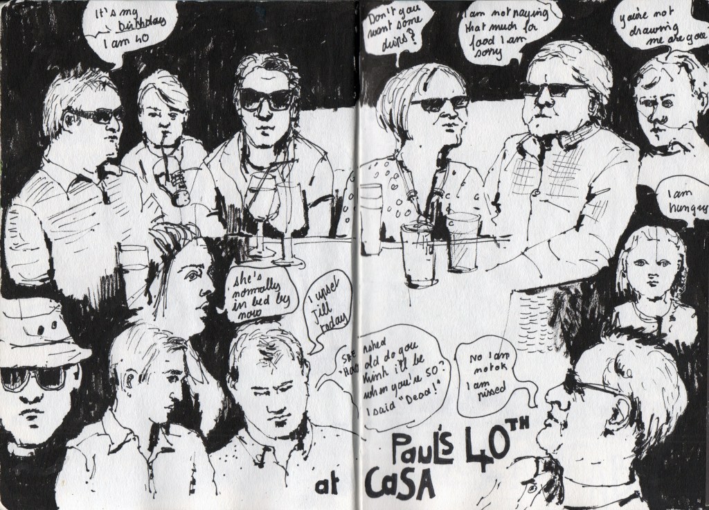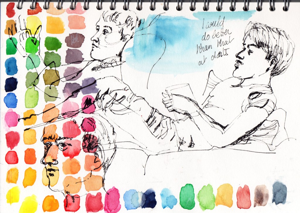 Sophie Peanut’s finished illustrations are playfully messy, abstract, and endearing. Her sketchbook work, as she describes, is much of the same. She speaks of the value of drawing in the waiting space between day to day activities and how doing this repeatedly improves one’s drawing skills. Based on my own experiences with rapid sketching, I would have to agree – it is of huge help. She advises arriving early to events or sticking behind after, making time for sketching, and just drawing whatever is in front of you without thinking.