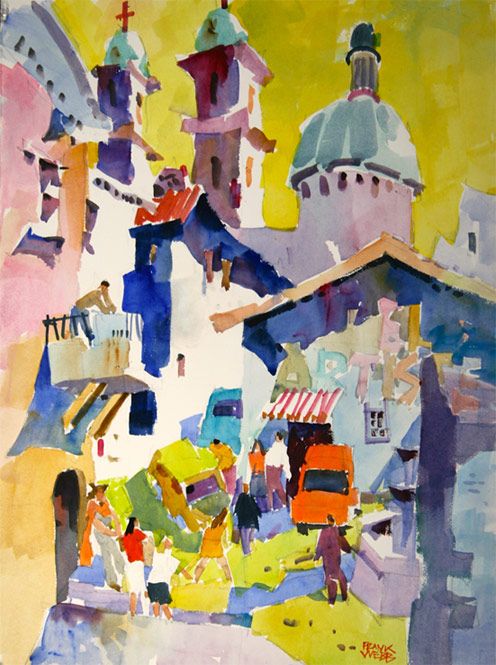 Webb taught watercolour extensively in the 1980s and has released three instructional books on the subject. His Wikipedia page states that he ‘stressed the importance of having a sketch or drawing of your painting before you paint, design, draw, etc.’ This immediately opposes Austin’s style of work in an almost laughable way. In spite of this concrete belief, Webb’s work strays away from traditional realism, which he considered to be ‘boring’. His work, like Austin’s, has a playful and fun feel to it, though it is clearer that he is trying to communicate ‘real’ things.