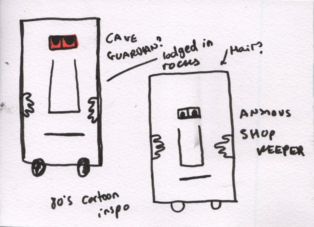 Overall, I’m less excited about this character. I’m not sure if that’s because I’m just less invested in it in general or if it’s down to the way I created the textures for it. I feel more attached to the ironing board character and more excited about fleshing out a narrative for him. Still, I moved on to my third character – inspired by a switch found in my kitchen – which I felt a little more positive towards. I envision this character to be a wise, old guardian, blocking the entryway to a cave. Whenever anyone tries to enter the cave, he presents them with riddles and trivia and only allows them to pass if he feels they are worthy. He isn’t mean or rude but stoic and protective.