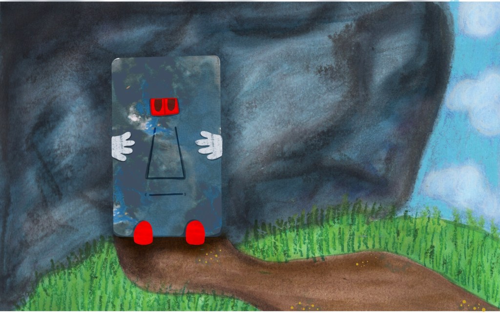 I reused the texture created for the school blazer here as I felt it was perfect. I did alter it slightly and changed the colour here and there to see how I could achieve a more ‘rock guardian’ type look. I once again used the crayon texture for the hands added and digitally drew facial features. I then used some acrylic paint to create a shiny red texture to use for the shoes and eyes, inspired by the red light on the switch. I thought that acrylic paint always dried glossy, but this time, it dried matte. Frustrated, I added some PVA glue over the paint and also mixed some with a brighter shade of red to try to get that shininess I desired.