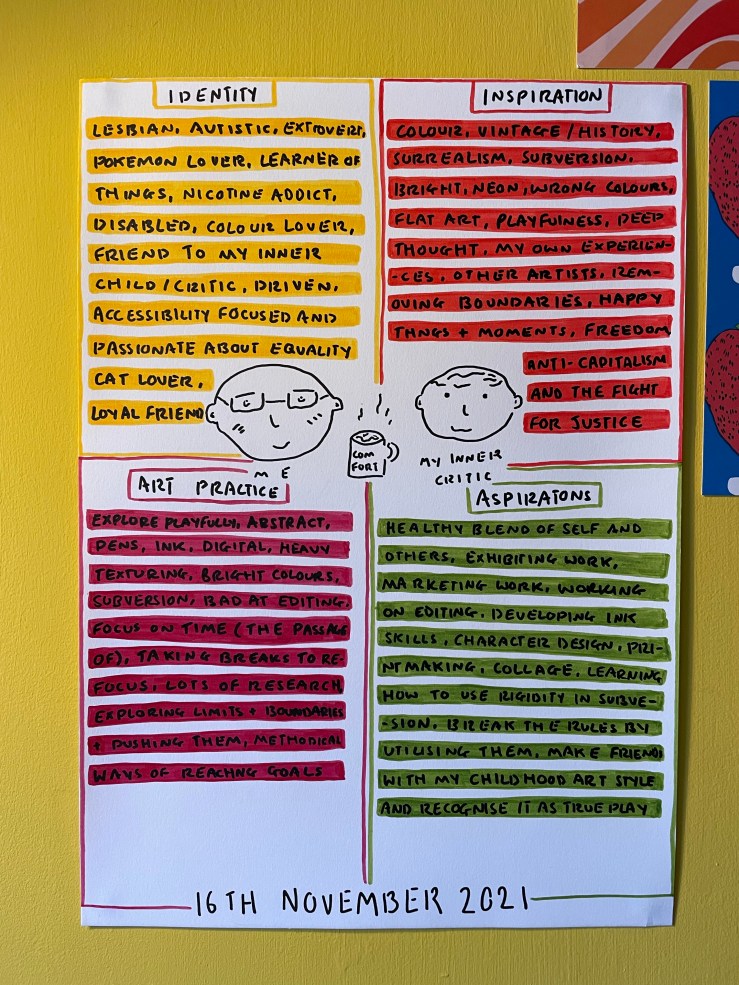Once the 20 minutes had run out, we all shared our work with each other. It was really interesting seeing how other people had approached the exercise. Notably, I was the only person who wanted to befriend my inner critic. Everyone else wanted to get rid of it or yell at it. This showed me quite a lot about my own self-development and growth, both personally and as an artist. The other people in the workshop added to-do lists to their pieces, which was cool to see, especially as I hadn’t considered anything of the sort. There were also more illustrations and drawings on the other pieces, which I guess shows my preference for infographics and other forms of graphic design.