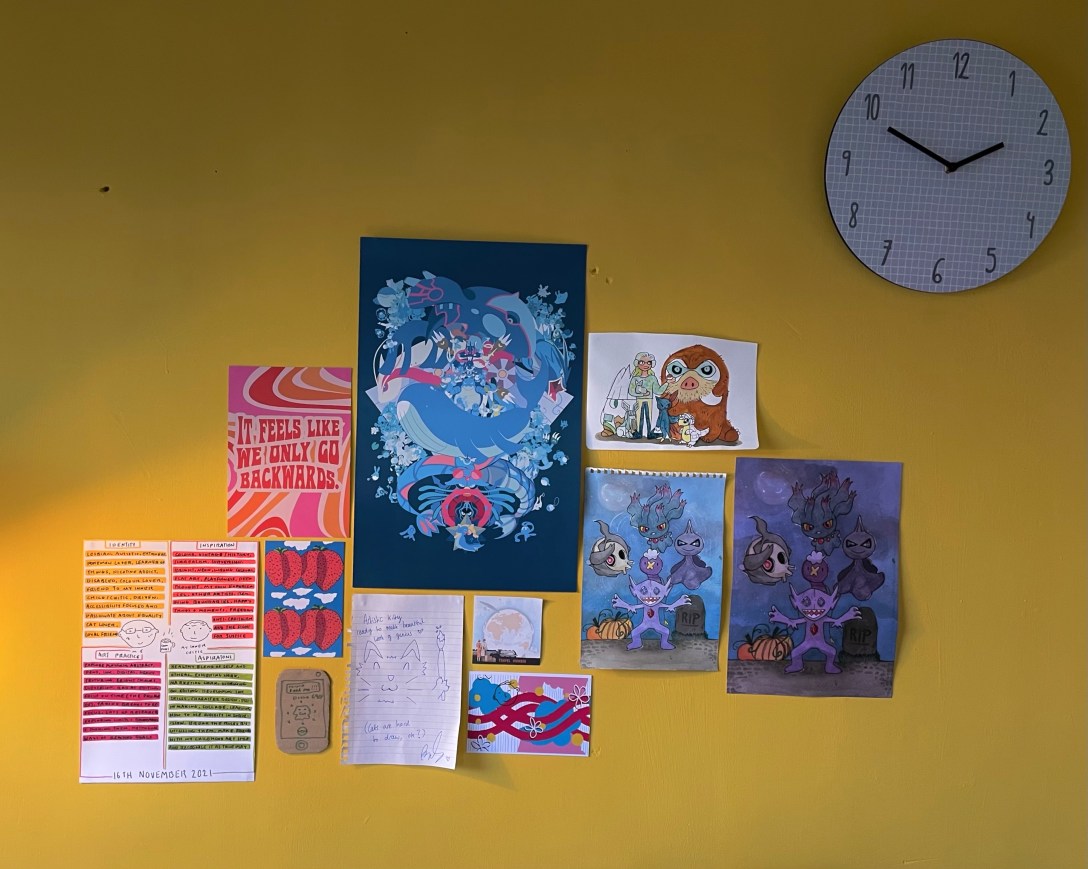 I came away from this workshop feeling fantastic. I loved the piece I had created, and I felt passionate about making art in general. I had clear-cut avenues to go down to further my artistic practice, and I was able to ground myself a little bit and see the reality of the situation. I now have this piece on my wall, as intended, and I look at it almost every day. I don’t always read what it says – sometimes I just smile at the bright colours and me, my critic, and our cup of comfort. That alone motivates me to keep going. Throughout this sketchbooks unit, I keep coming back to the same thing: I want to always make art that makes me smile.