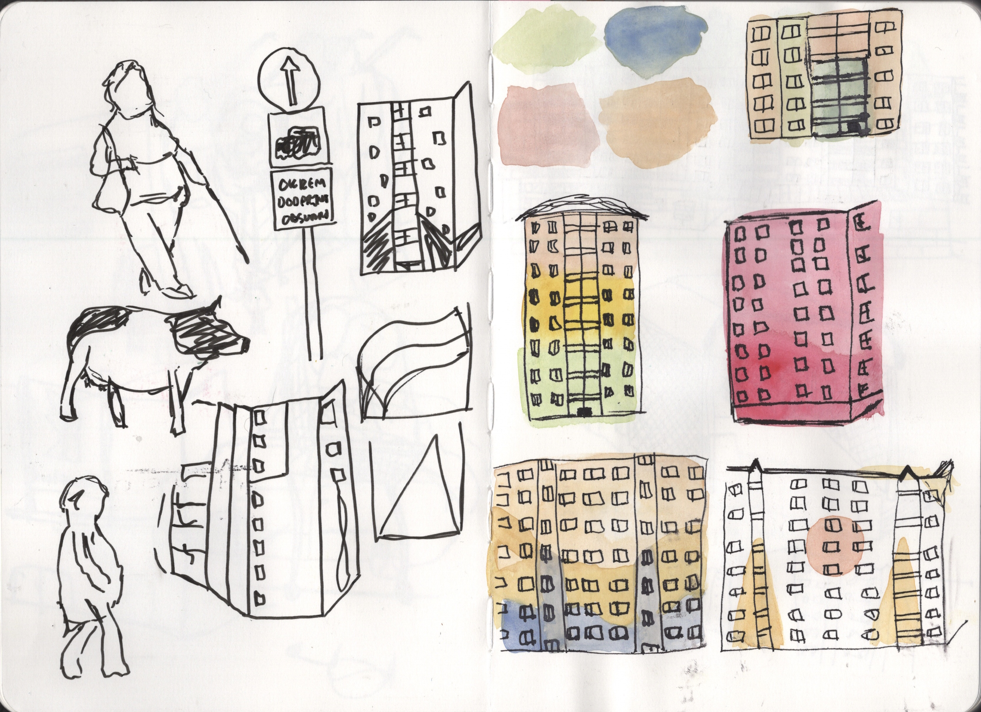 When selecting content to draw, I focused on elements of the journey that I felt were the most interesting or the most memorable from when I was there in person. Looking back, I’m not sure how accurately my sketches portray the route from point A to point B, but I feel it’s apparent where I was. I used a range of materials from my travel tool kit. I began by using my trusty 1.0 fineliner – which is perfect for rapid and thoughtless sketching – then moved on to using a smaller nibbed writing pen in order to accurately draw the details on buildings. When it came to adding colour, I mainly relied on my watercolour palette, but I did use one brush pen right at the end. Waiting for the watercolour to dry was tricky – if I were to do this on-site, I would need to invest in some waterproof ink pens. I’m grateful I was indoors and able to wait in the warmth before adding linework! Switching between rapid sketches and more sustained work came naturally, depending on the subject of my sketch. By the end, I found I had settled into a midpoint that felt comfortable to me. A mix of rapid outlines and detailed elements just felt right.