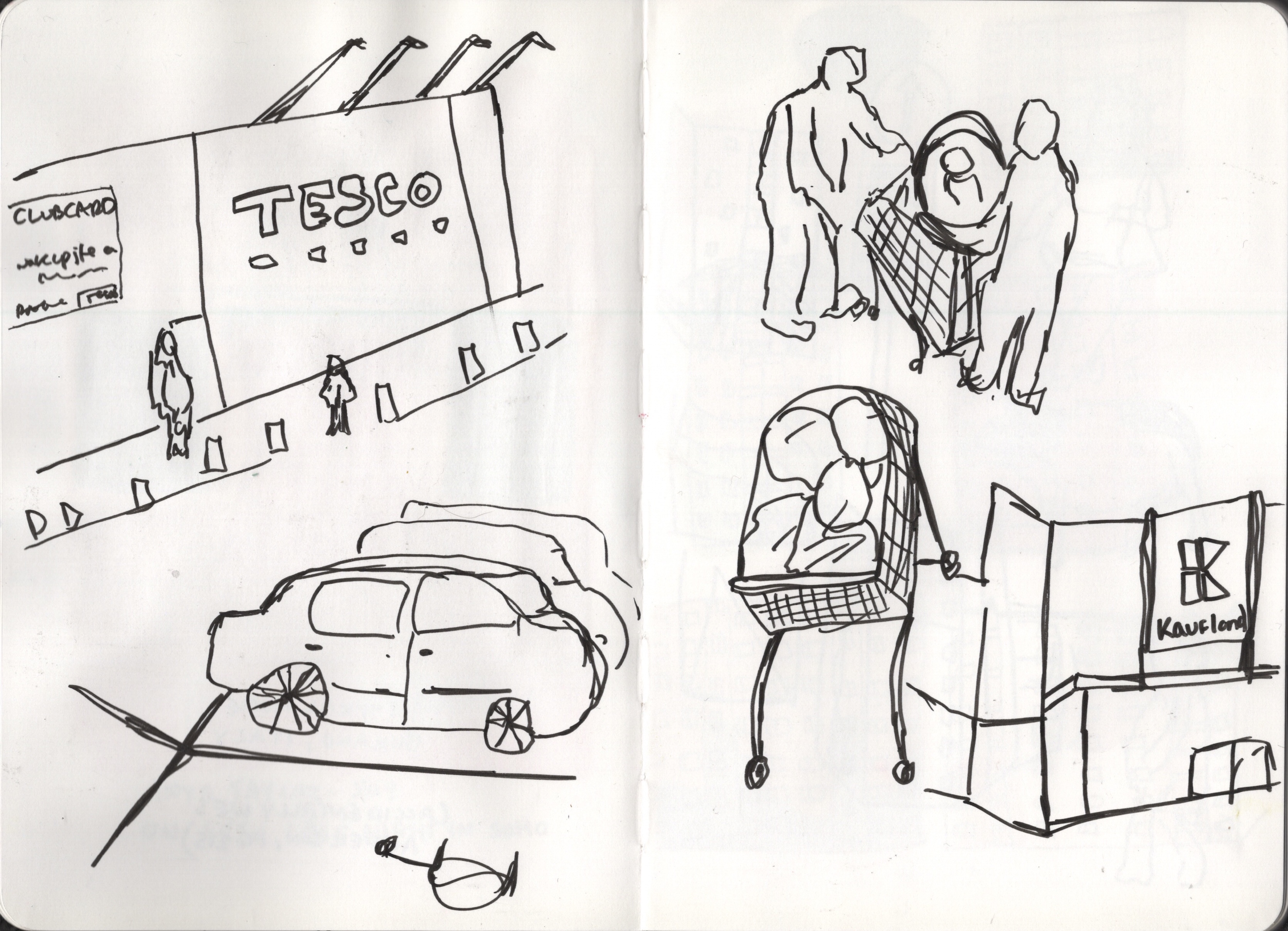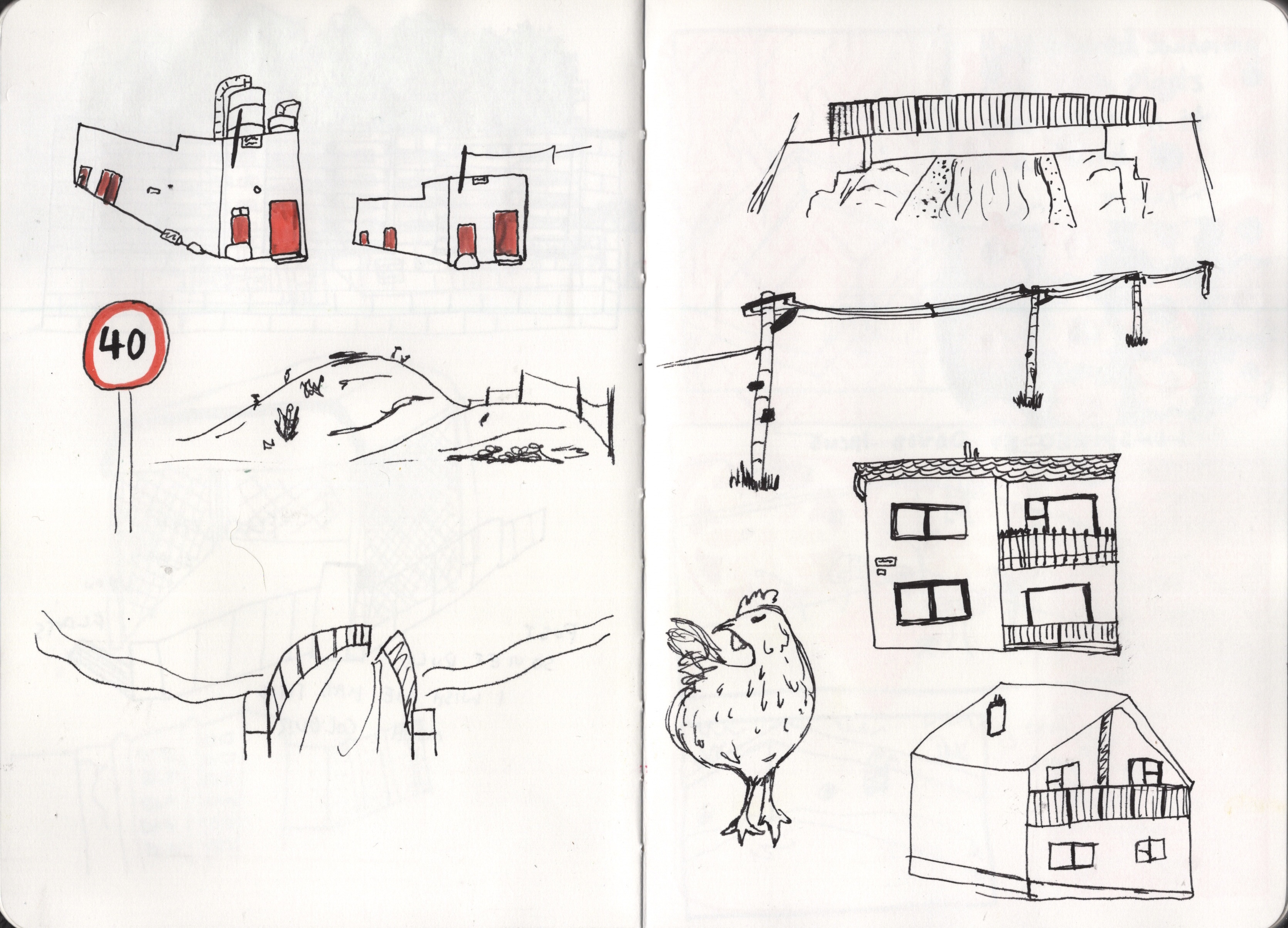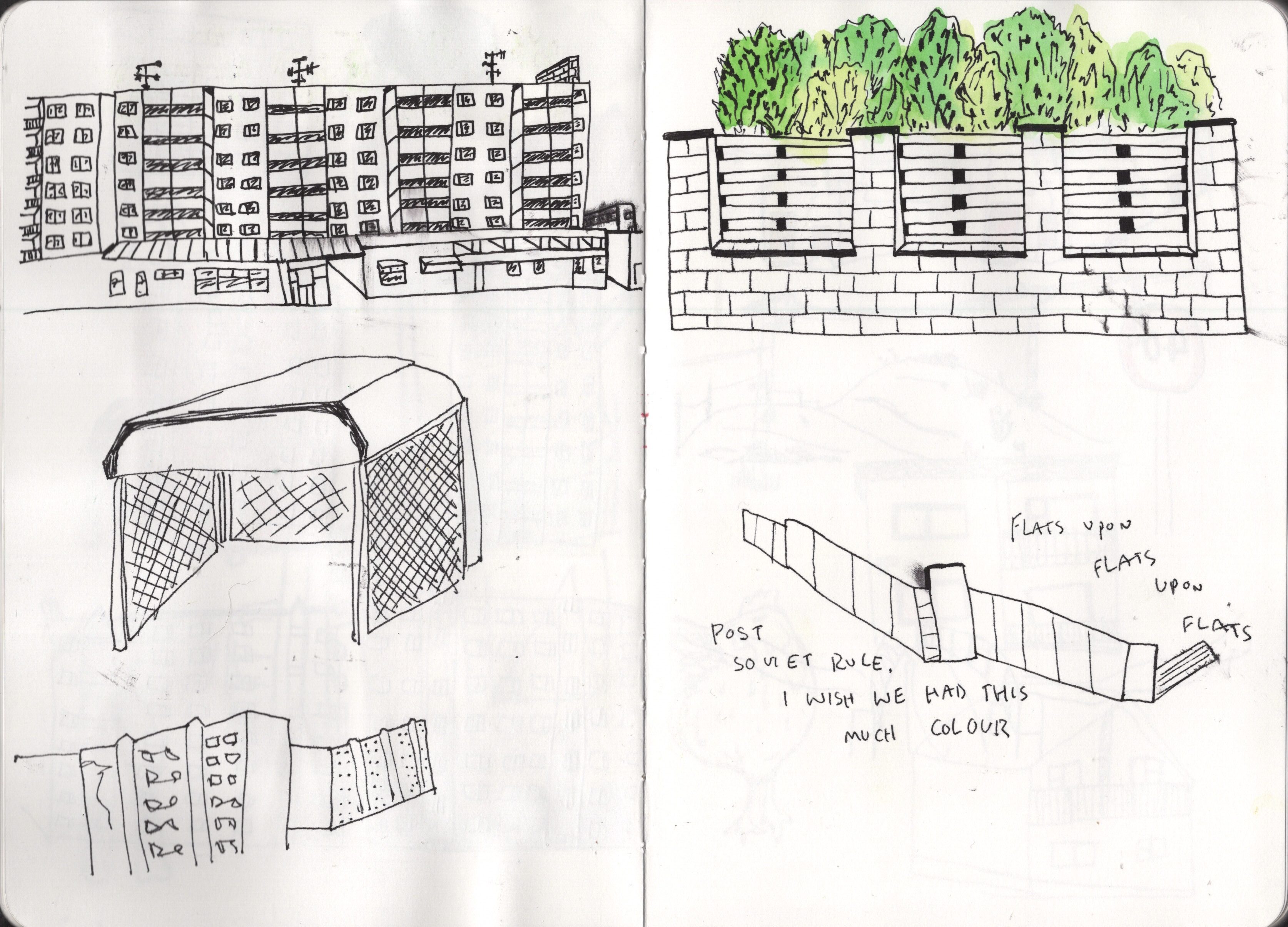 The goal of the exercise was to absorb the environment I was viewing and use my sketchbook to document it using rough visual shorthand. I was asked to try both quick and loose sketches and slower, more sustained work. I spent a few days considering what route I would ‘walk’ using google maps, conscious of the fact I wouldn’t be getting the full sensory experience. I thought about places that were meaningful to me or that I had strong sensory attachments to – places I had been repeatedly or had experienced intense emotions in. I wanted to be able to tap into these feelings and to express that in my sketches somehow.