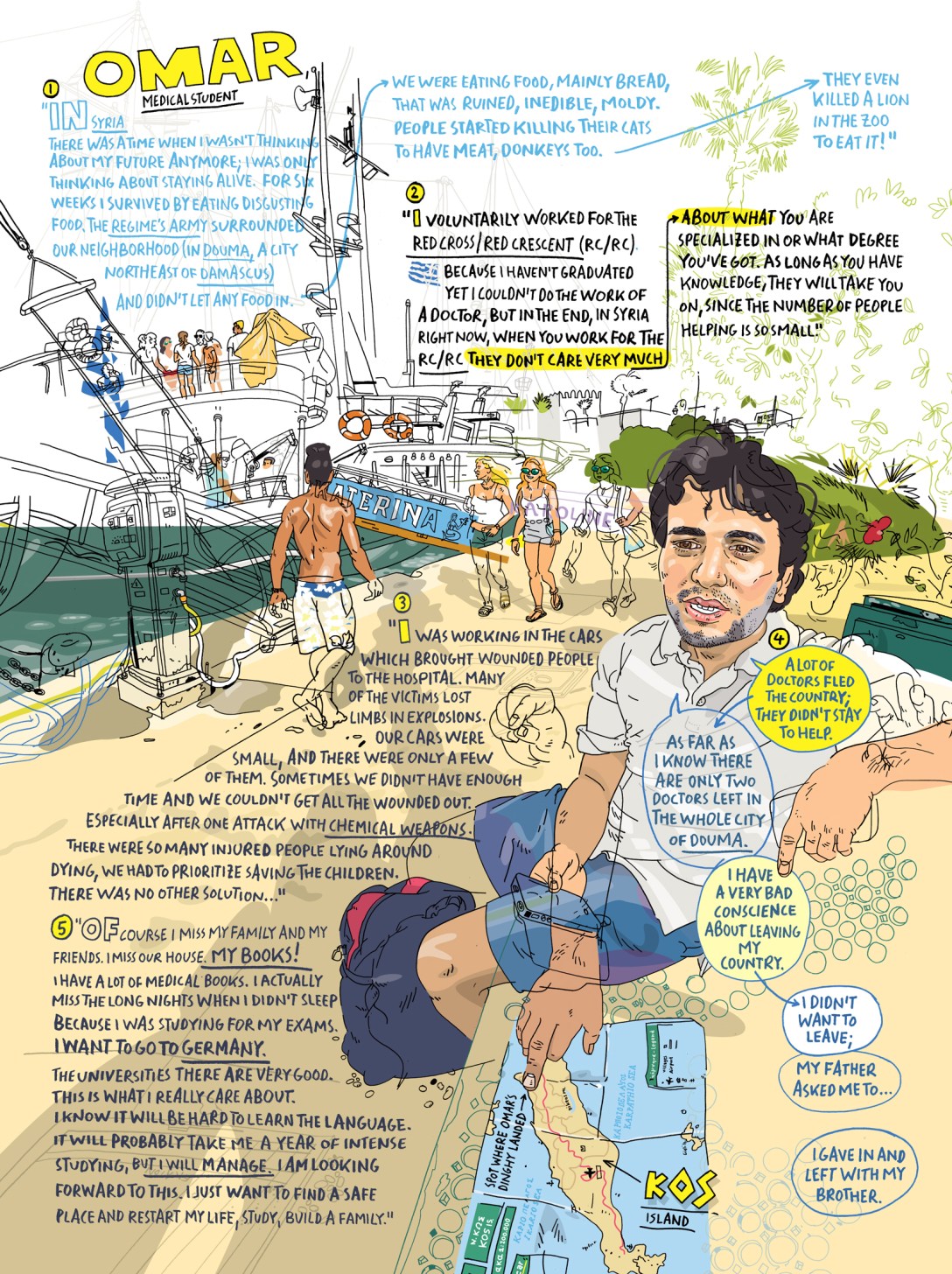 Ultimately the power an artist has is the ability to choose what content to include and to remove from their imagery. An observer of a situation such as war cannot accurately make these decisions in a way that represents the lived experiences of those within the situation. The artist’s opinions, feelings, and biases towards the situation will ultimately prevail. An example of being an observer whilst centring those in the situation is the work of Olivier Kugler, who presents illustrations alongside text in an incredibly matter of fact way. It is clear he tries to represent those in his illustrations accurately. His work almost presents as infographics, describing to the viewer what is happening in these situations and how people feel about it. It is honest and raw and not intended for Kugler’s own gain.